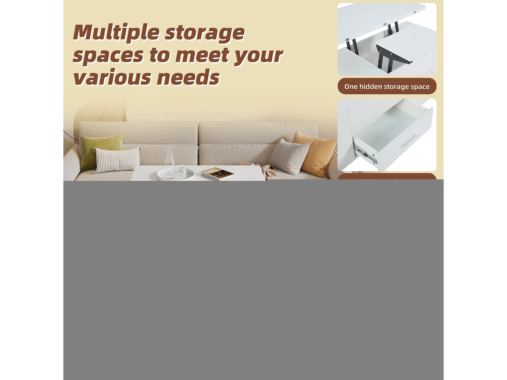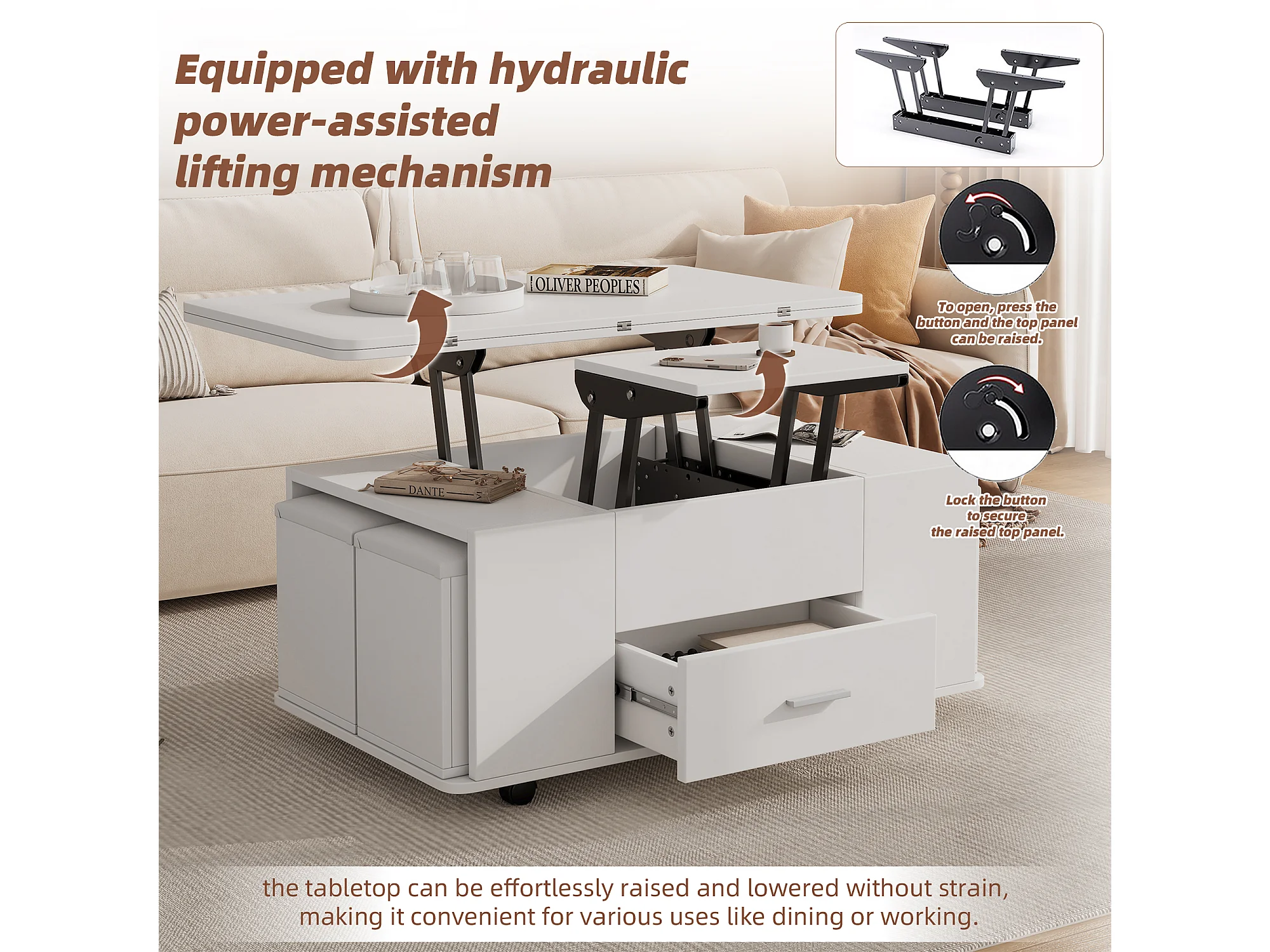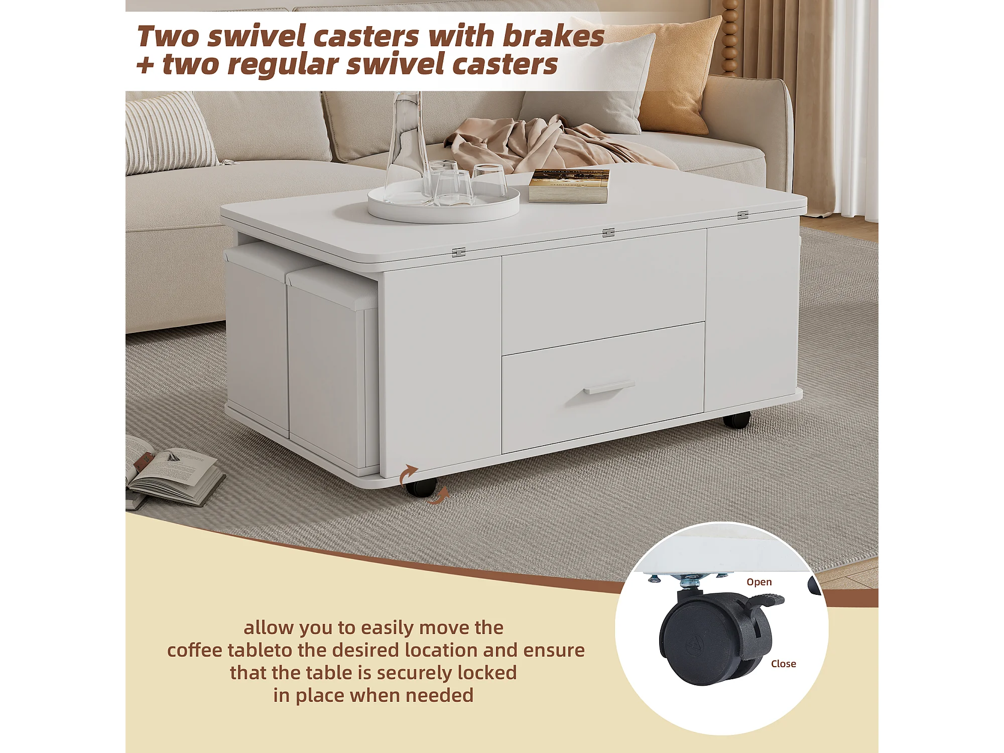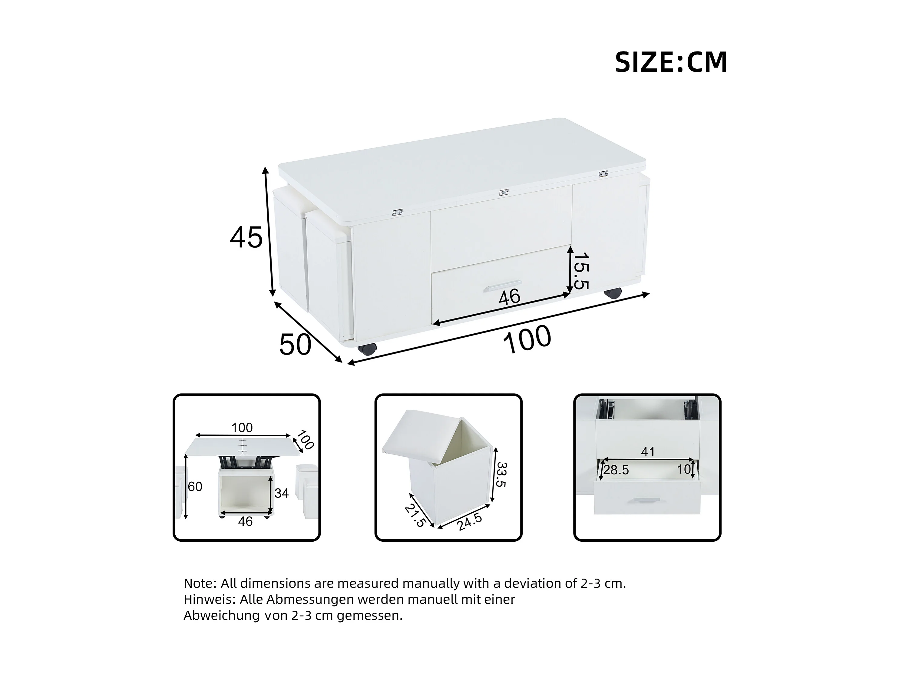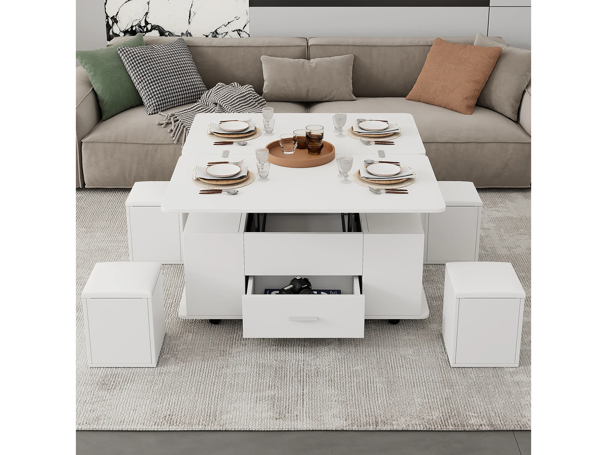 Mesa de centro multifuncional 4 en 1 con altura ajustable, cajones y 4 taburetes, blanca