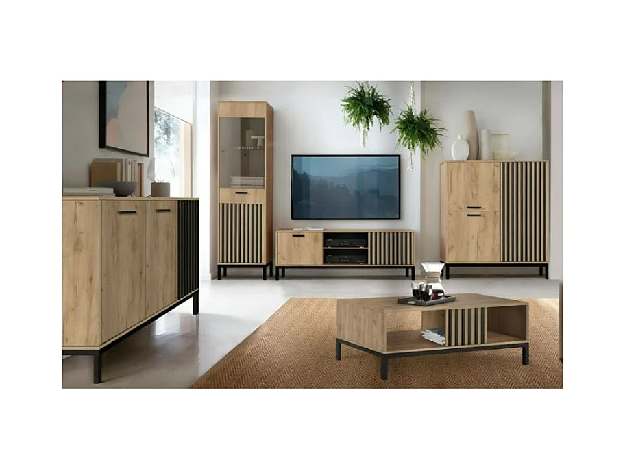 Mesa de centro con estante y estructura de acero negro y tablero Expanse de aspecto roble dorado