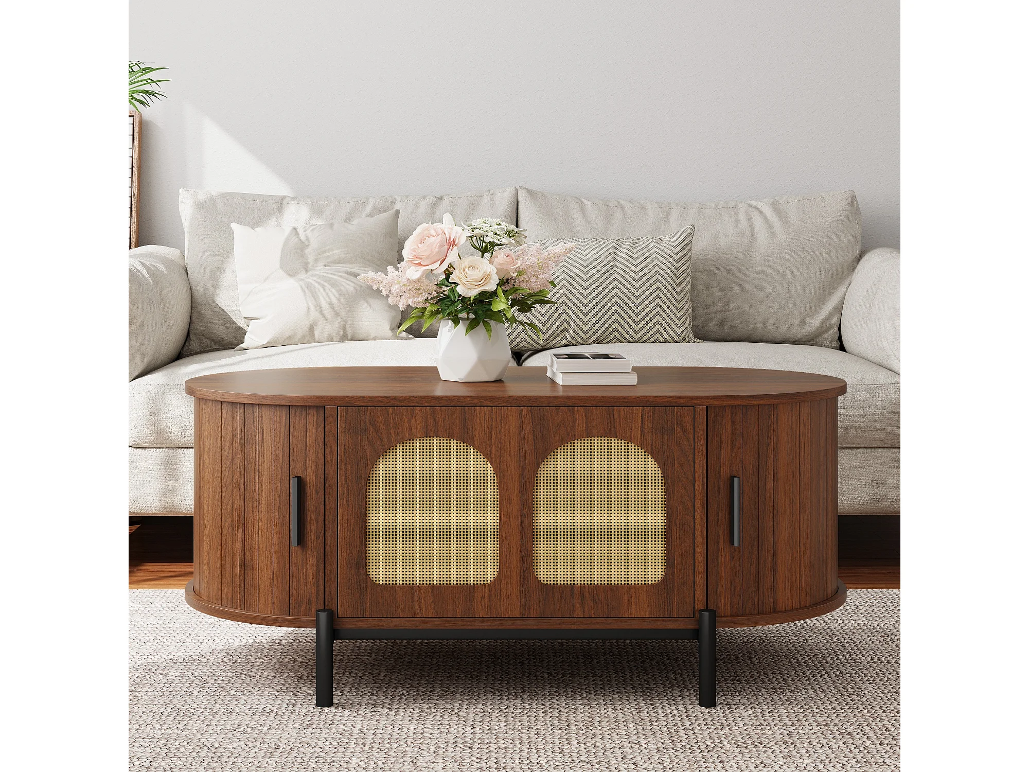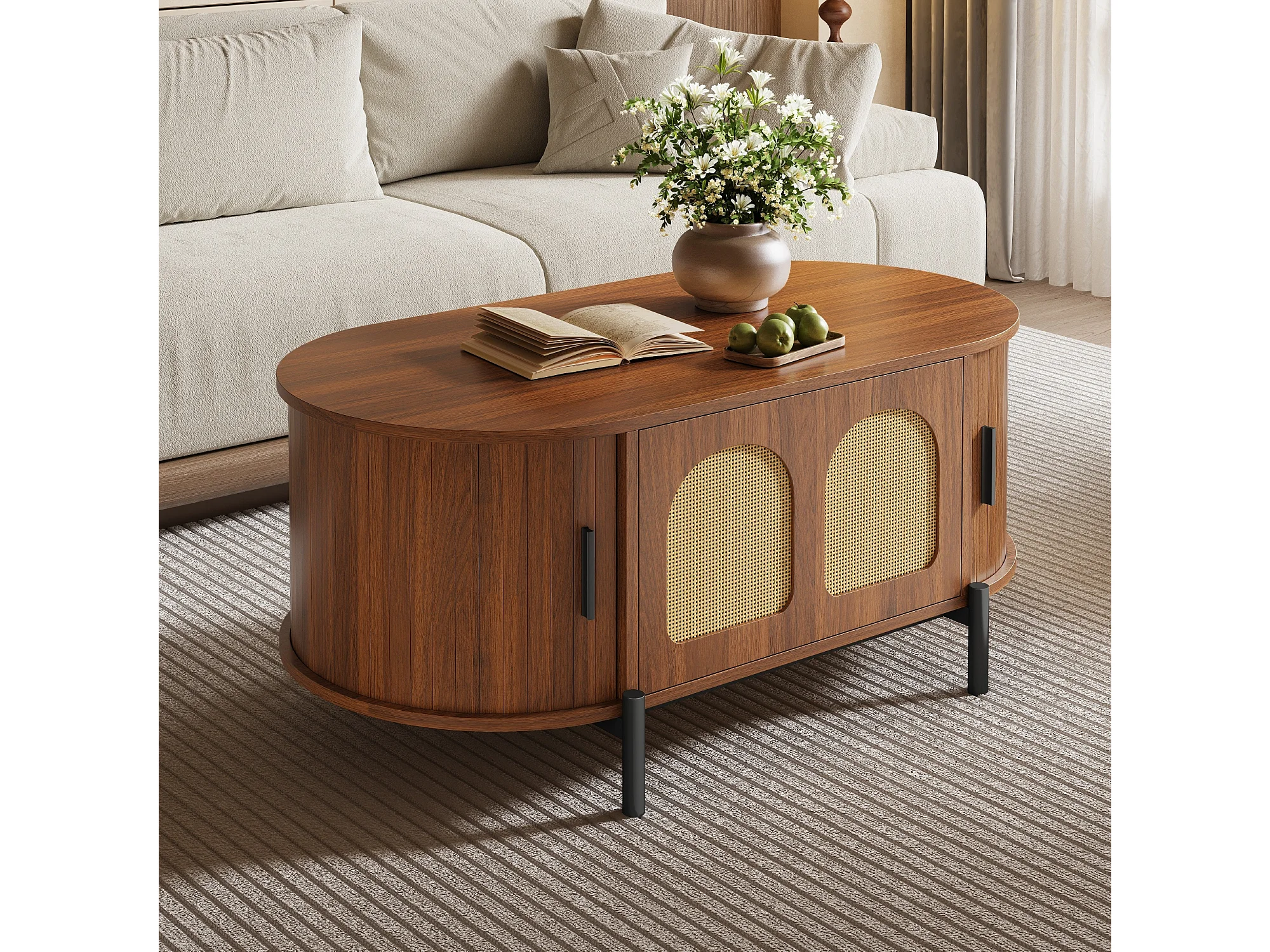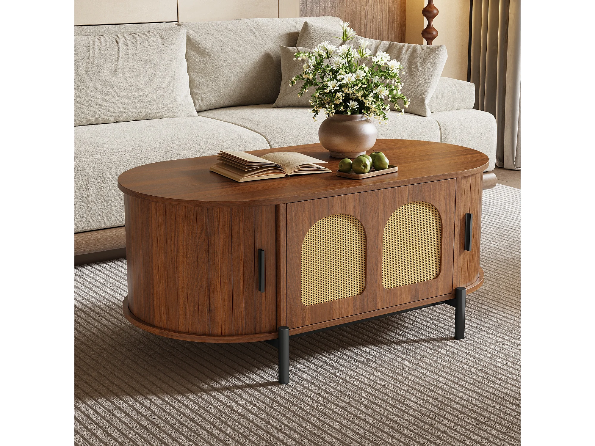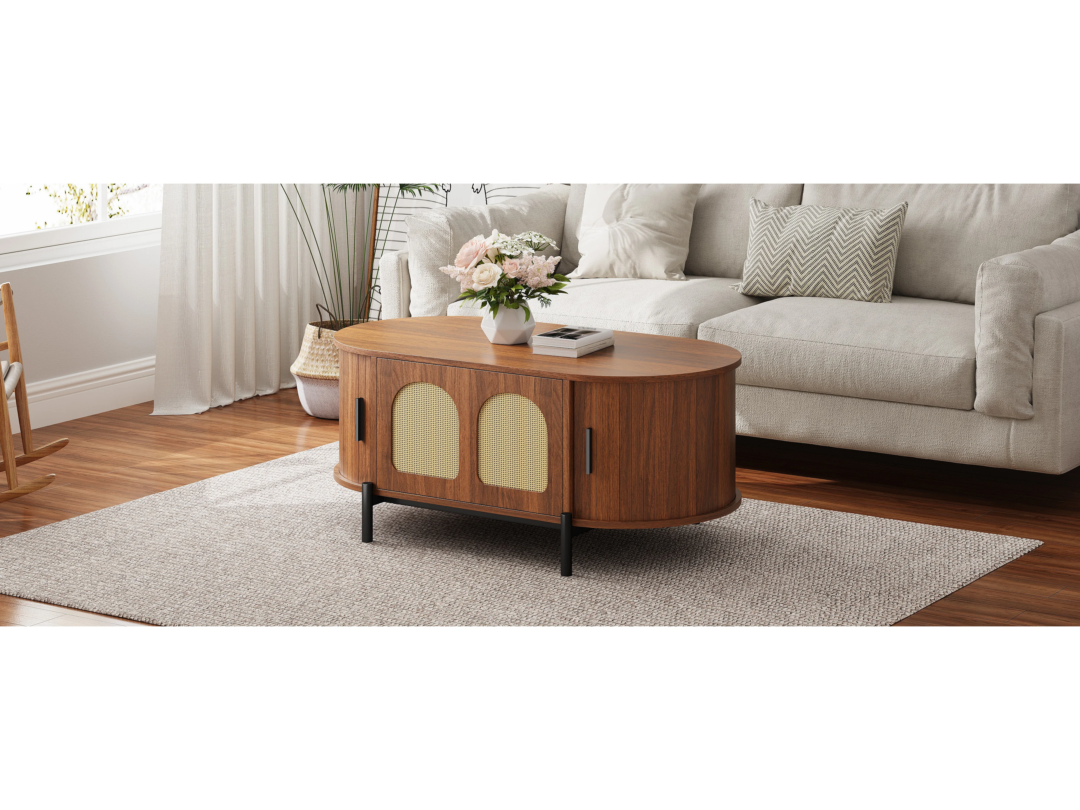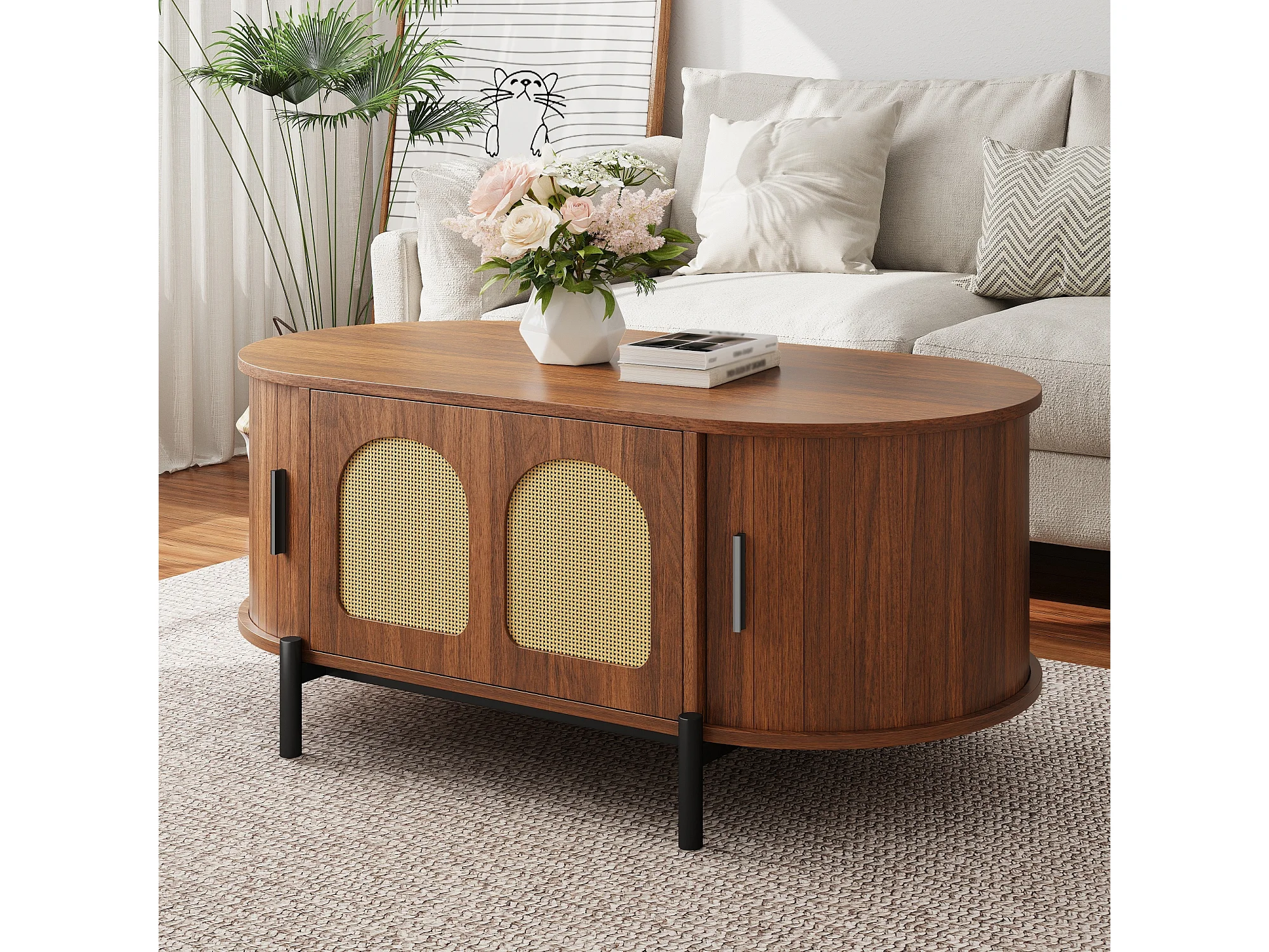 Mesa de centro ovalada de ratán - 100 x 50 x 40 cm - con puertas correderas y espacio de almacenamiento - patas de metal - MDF - marrón