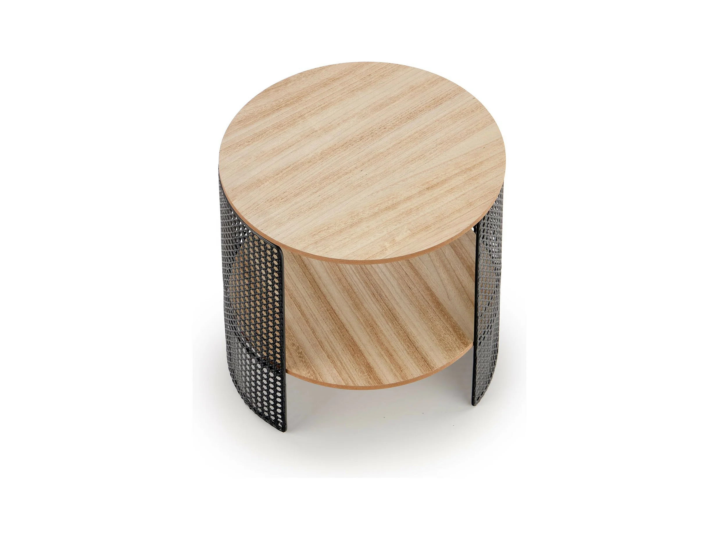 Mesa de centro redonda con estructura de metal negro calado y tablero de aspecto madera LEANA