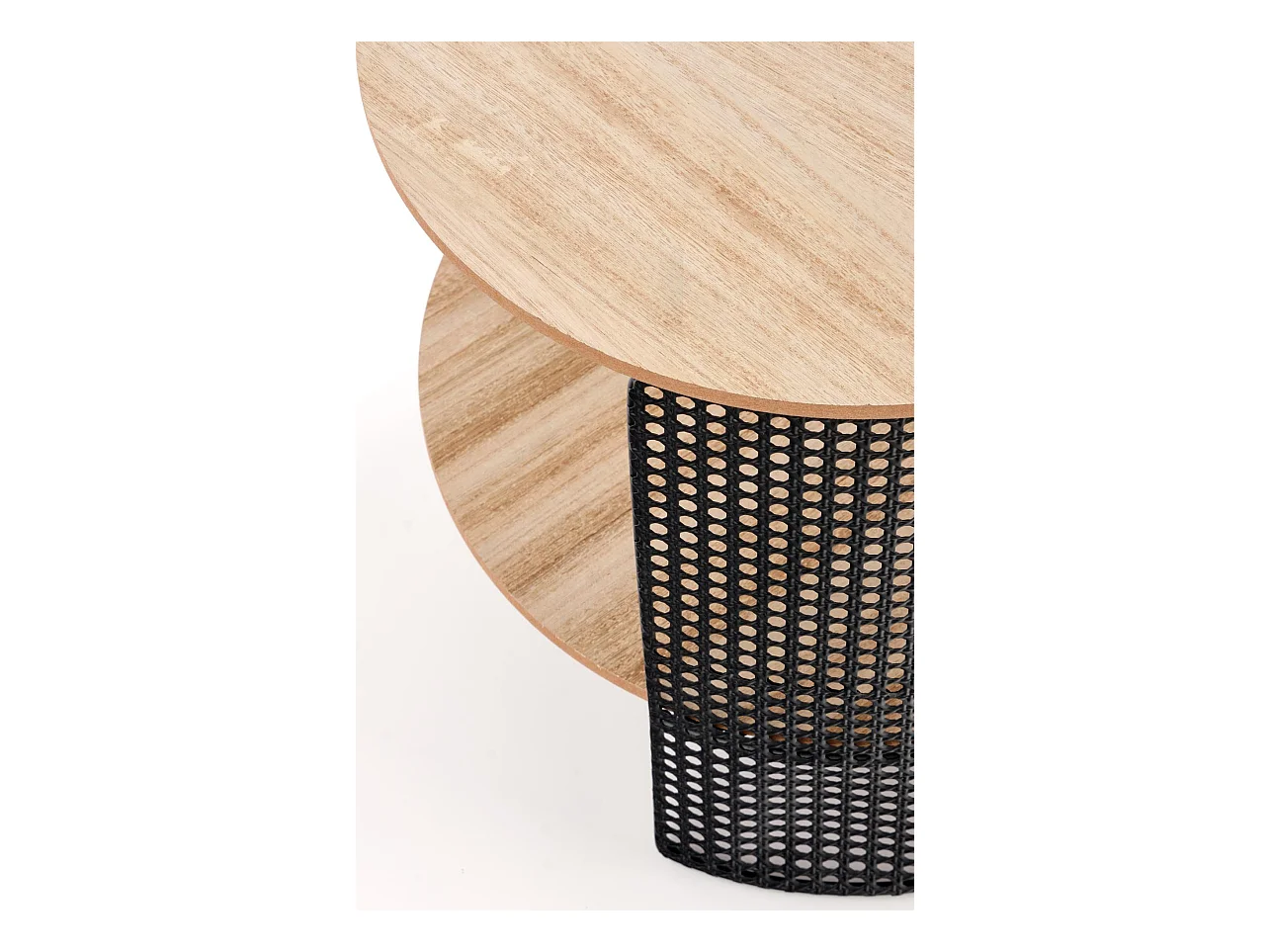 Mesa de centro redonda de 80 cm con tablero de aspecto roble natural y estante de ratán sintético negro WODAN