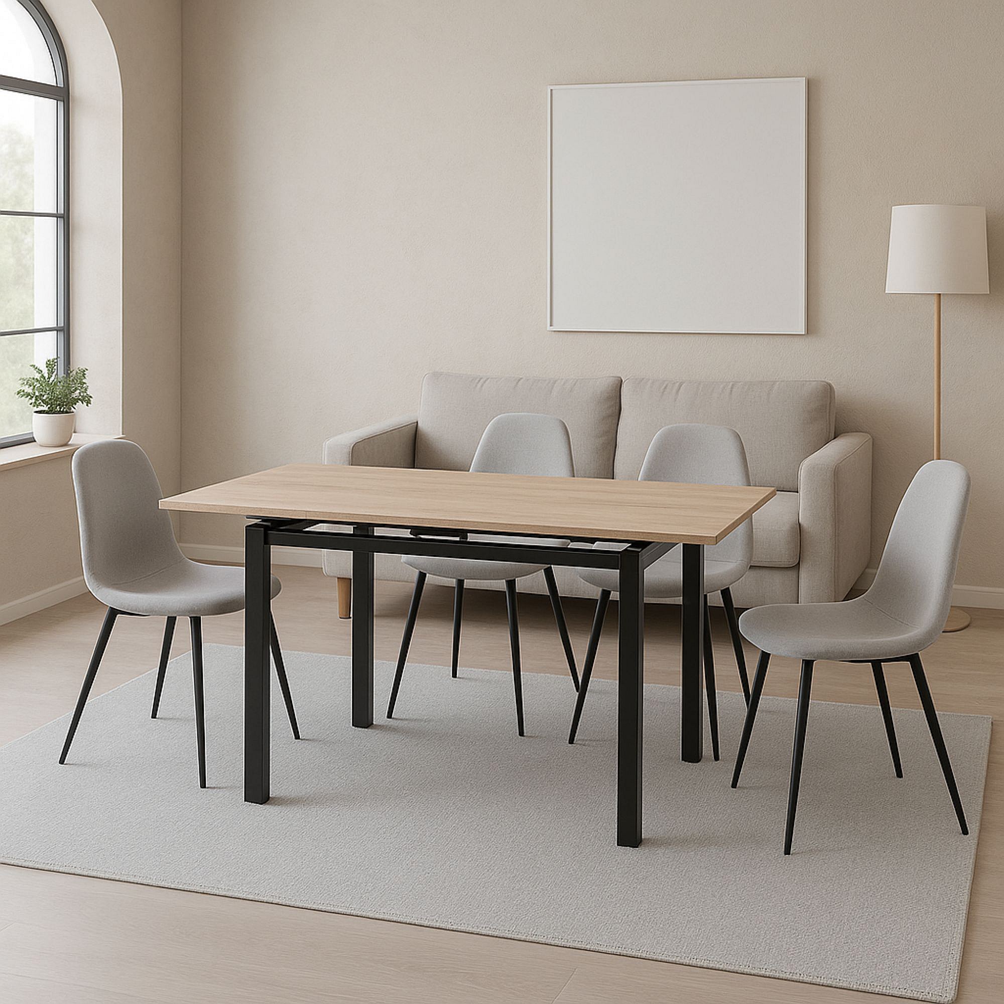 Mesa de Cocina Extensible – 110/170x70x75 cm, Tapa MDF en Acabado Roble y Patas Metálicas Negras, con Dos Alas Laterales, Diseño Moderno y Funcional.