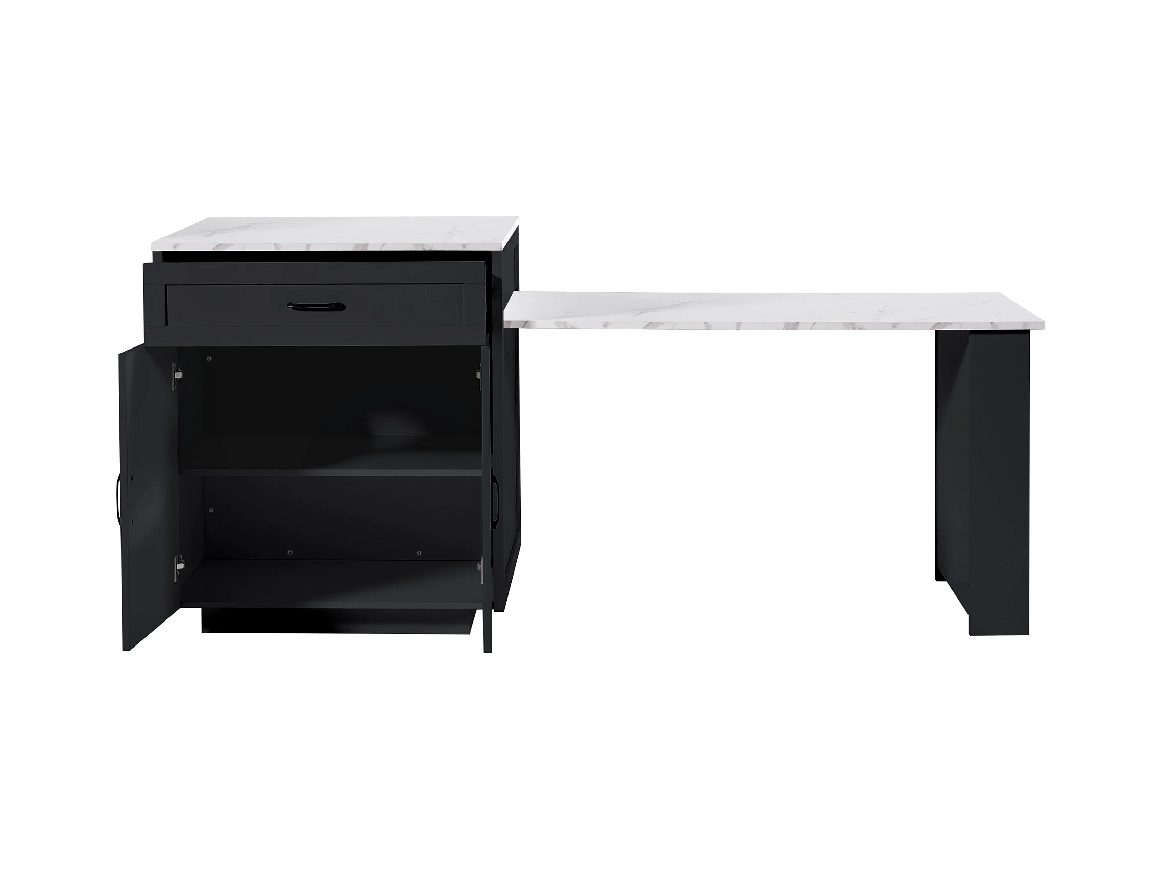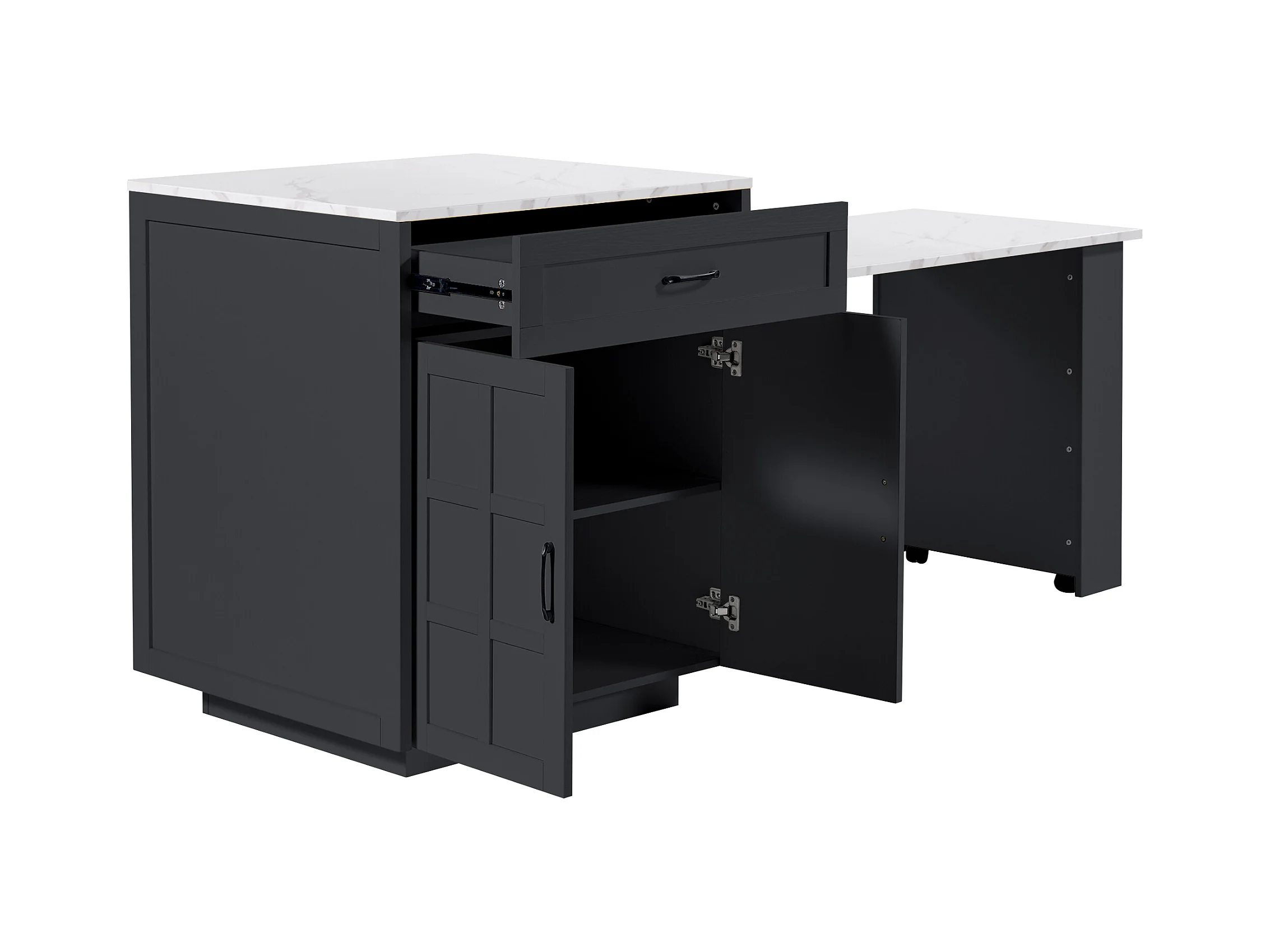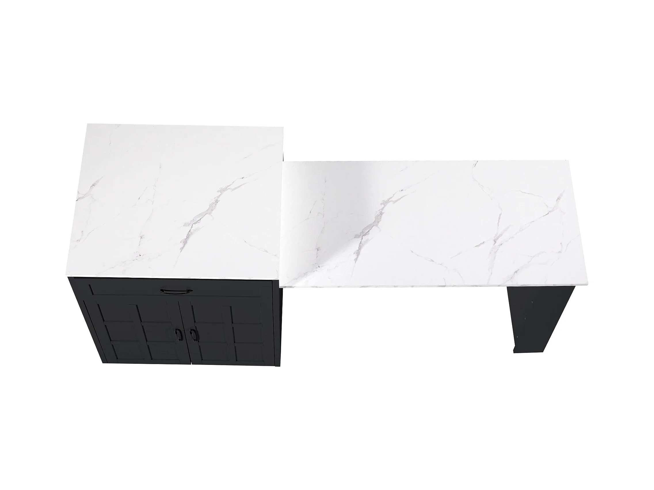 Isla central de cocina con 2 puertas y 2 cajones - Tablero extensible - Encimeras de mármol artificial - 133(202)x59x93,5 cm - Para 2 a 6 personas - Negro + Blanco