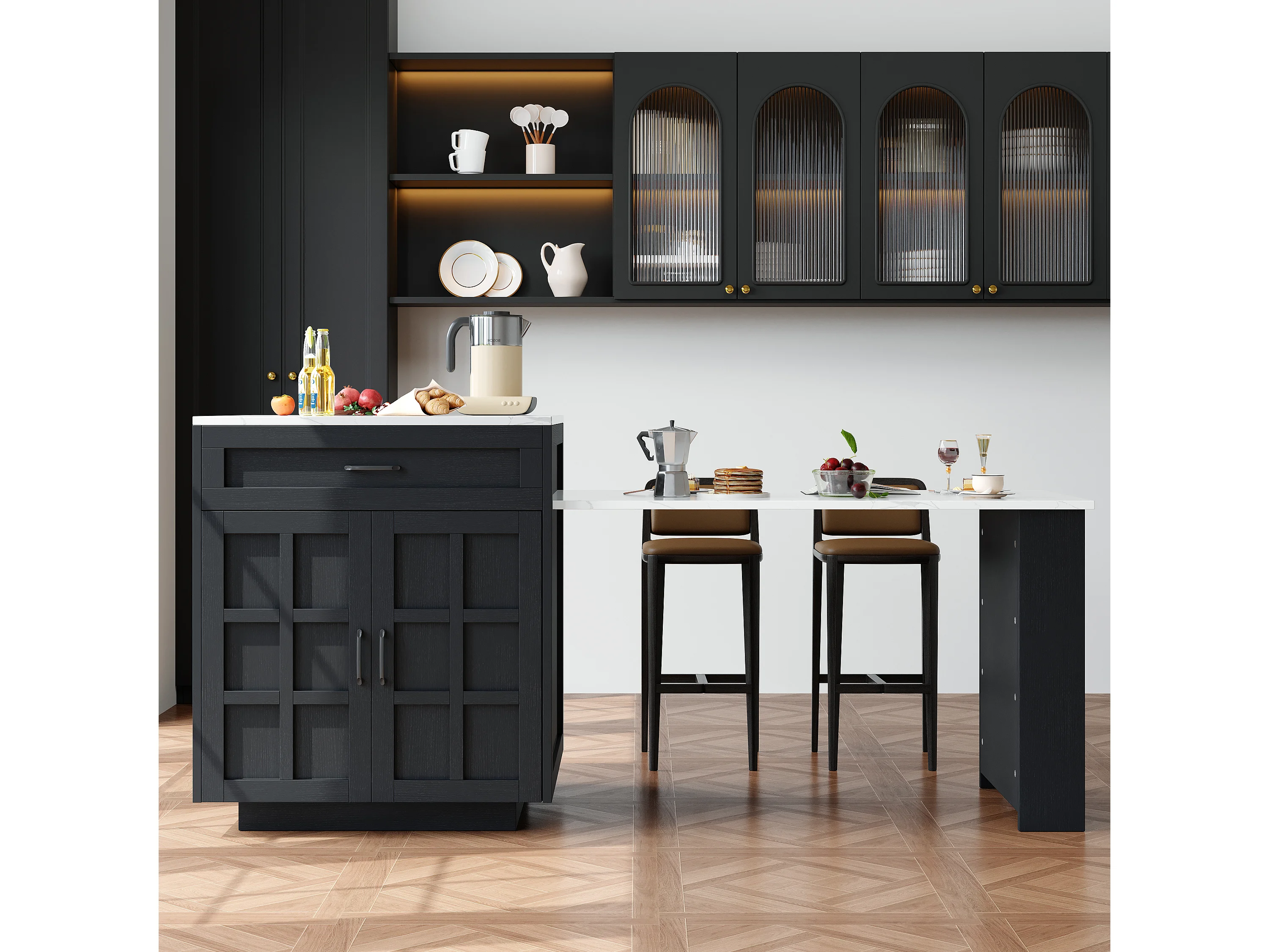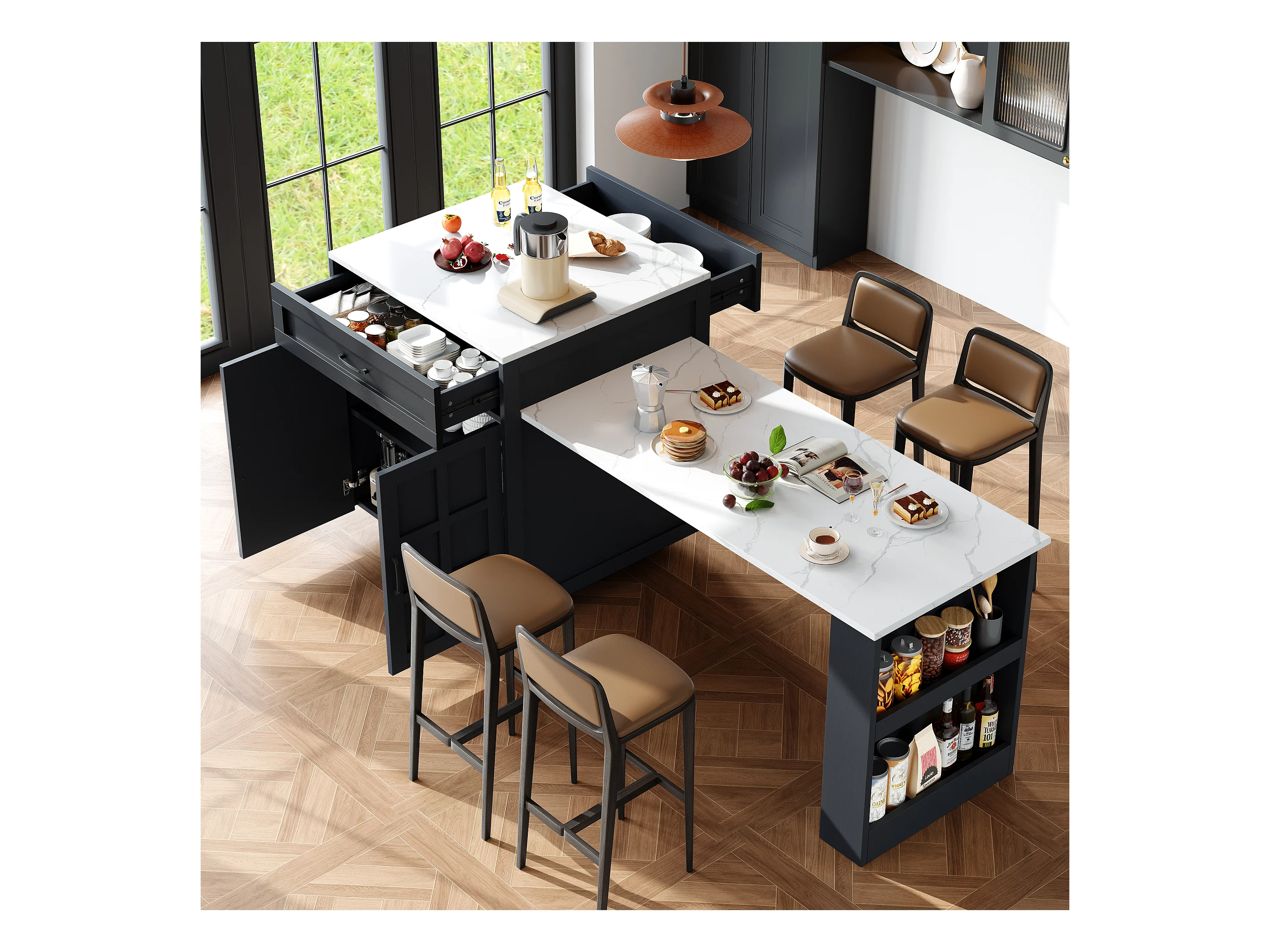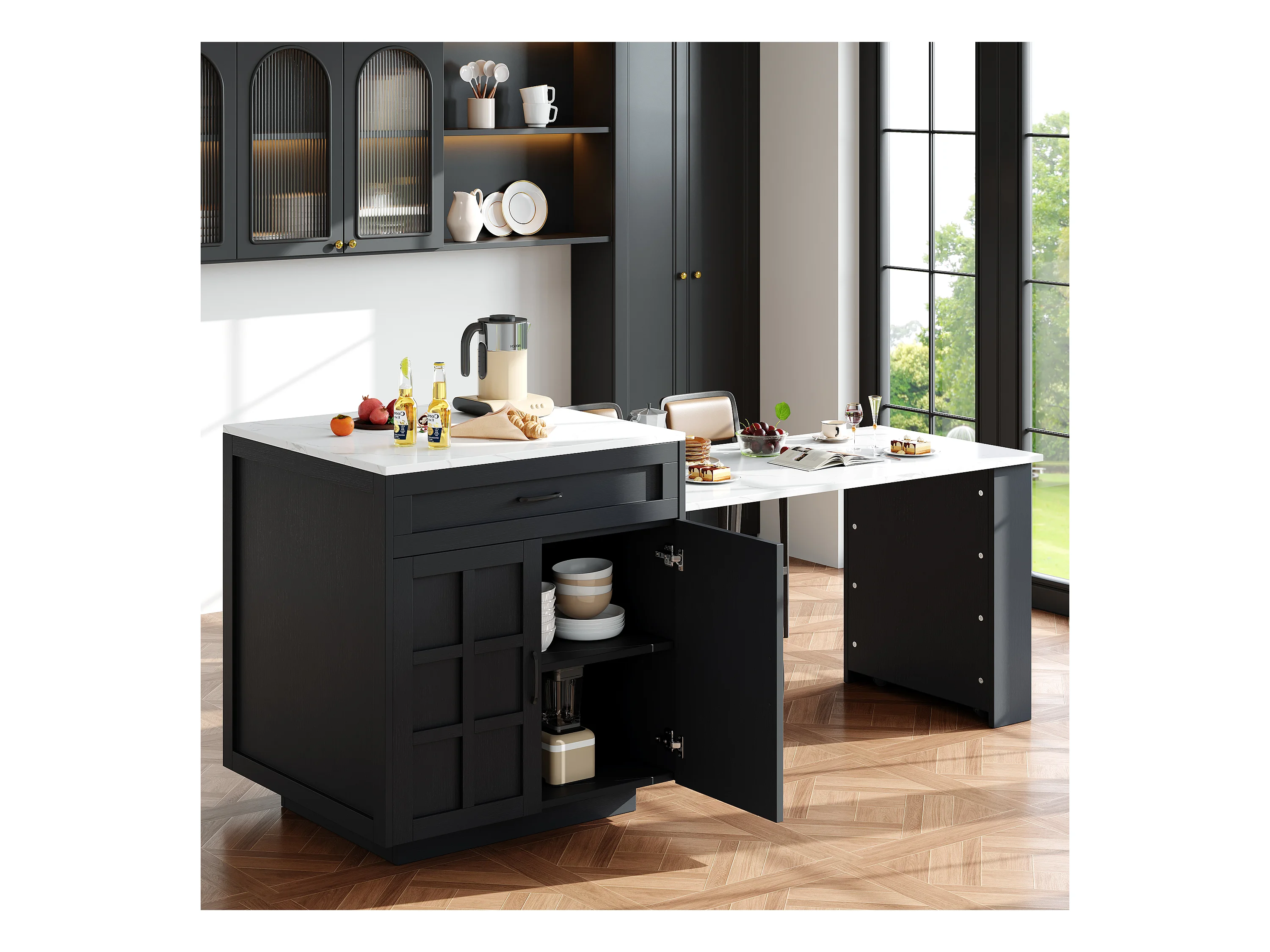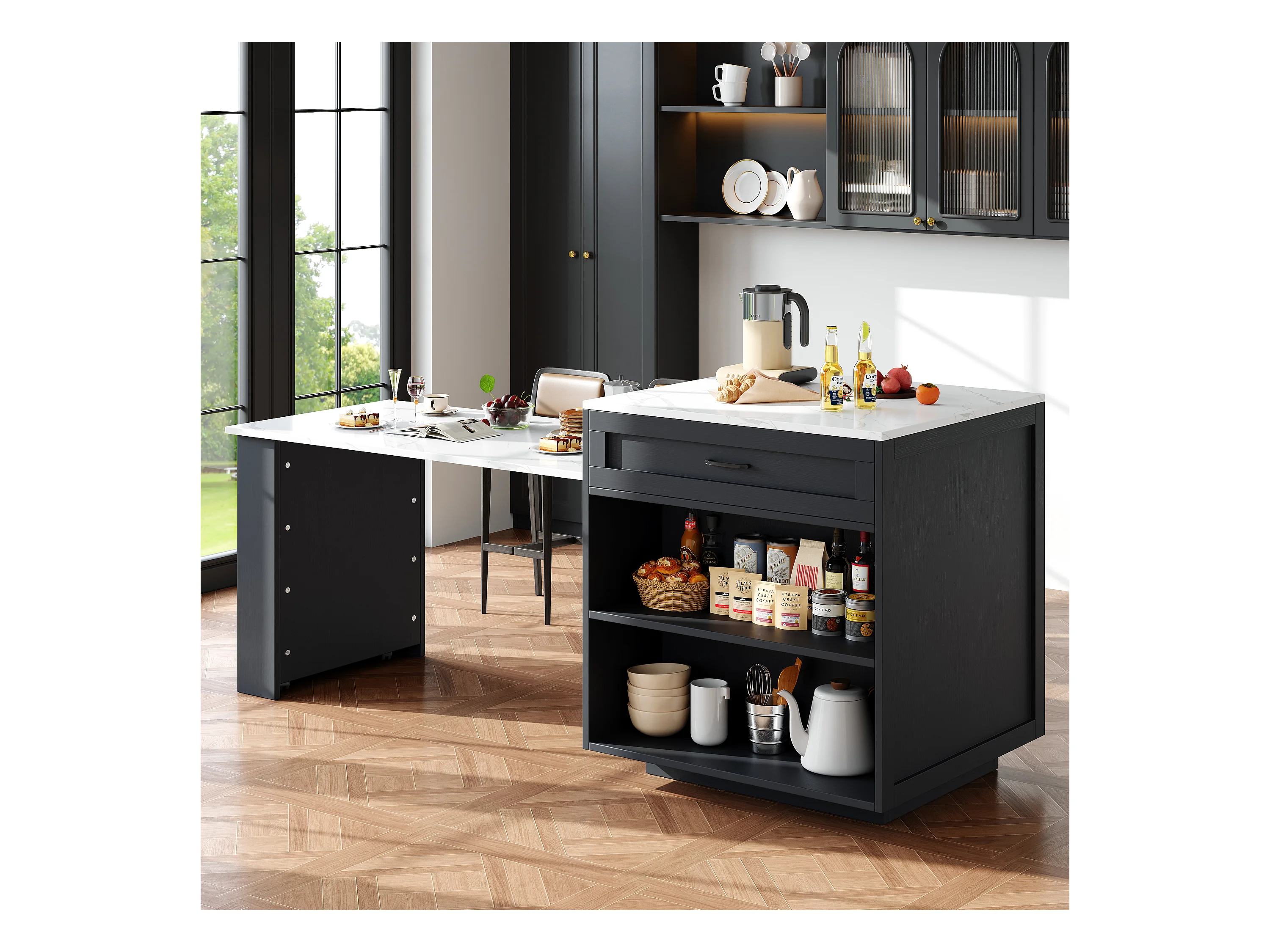 Isla central de cocina con 2 puertas y 2 cajones - Tablero extensible - Encimeras de mármol artificial - 133(202)x59x93,5 cm - Para 2 a 6 personas - Negro + Blanco