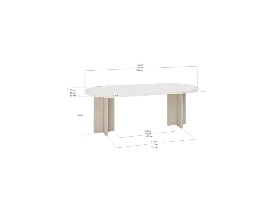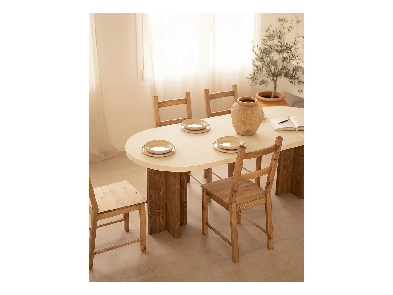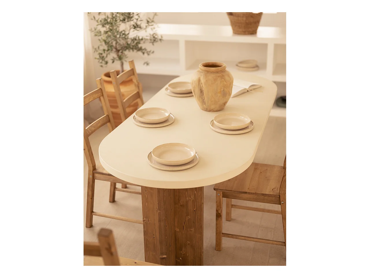 Mesa de comedor de madera de abeto maciza en microcemento ovalada y patas cilíndricas de 200x75cm en tono blanco roto - LUCÍA - DECOWOOD