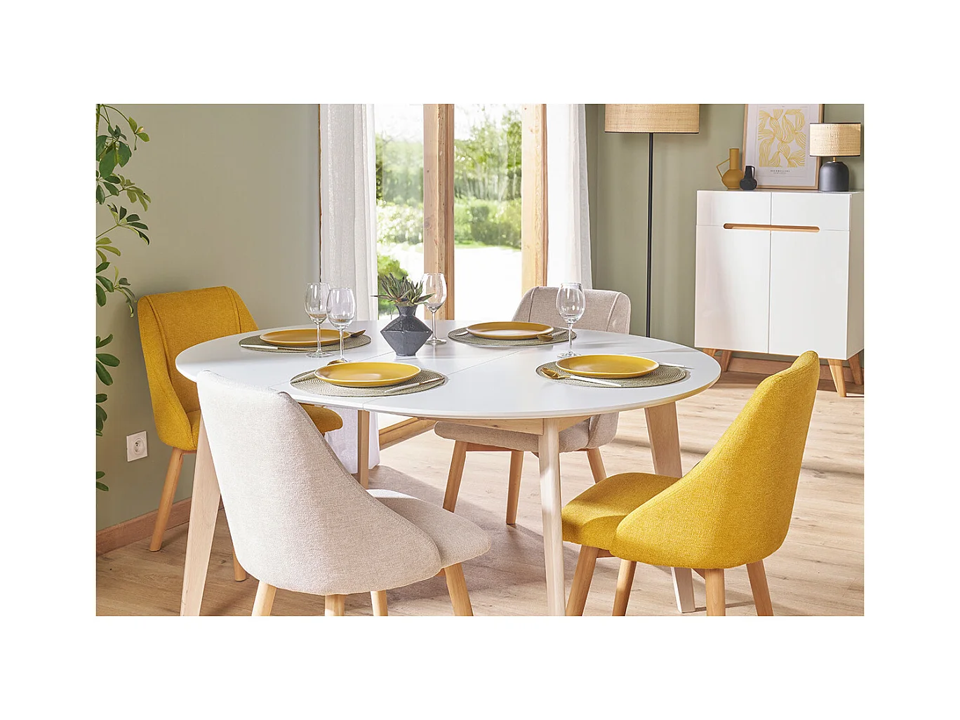 Mesa extensible oval blanca y madera clara L150-200 LEENA