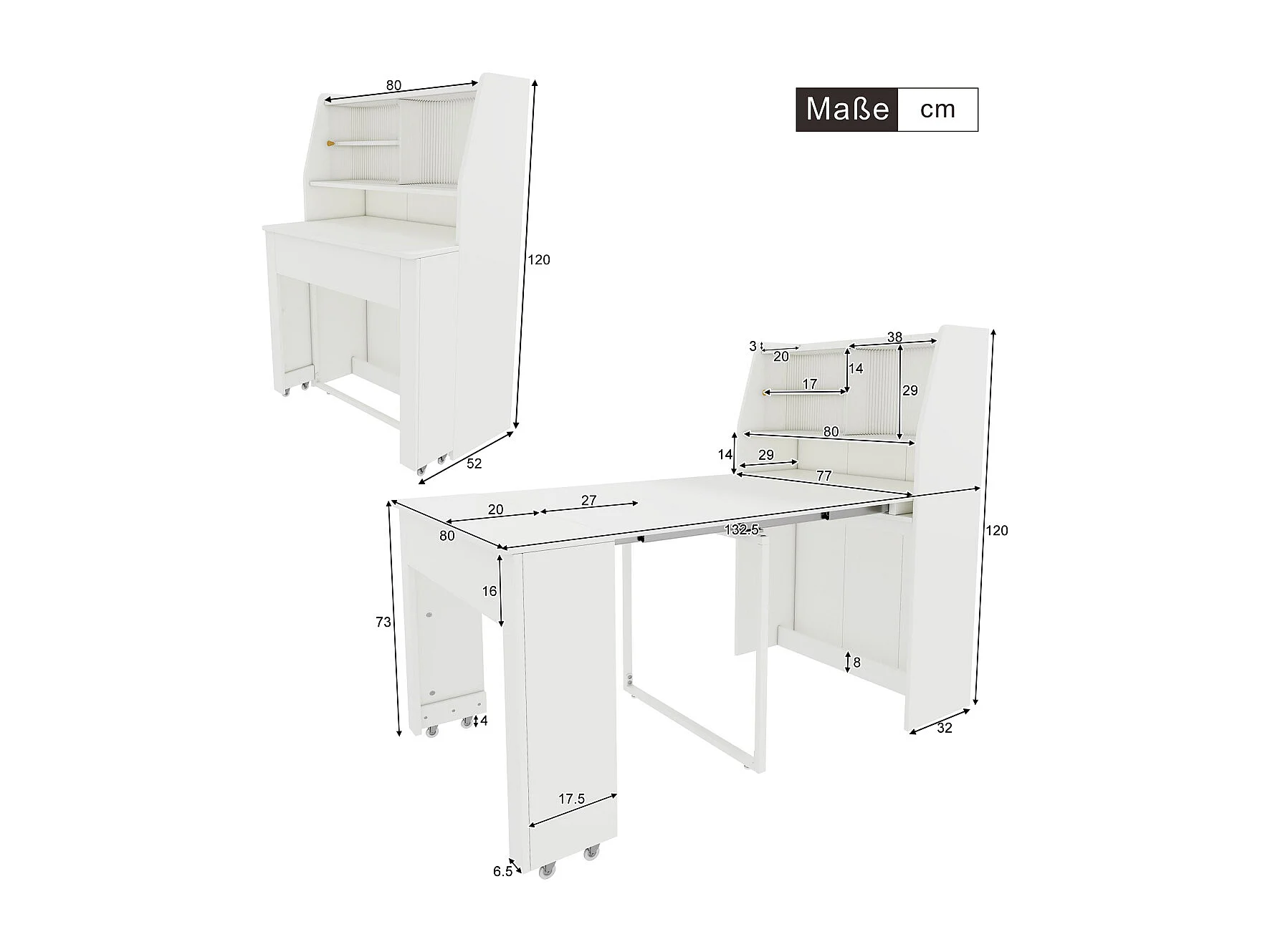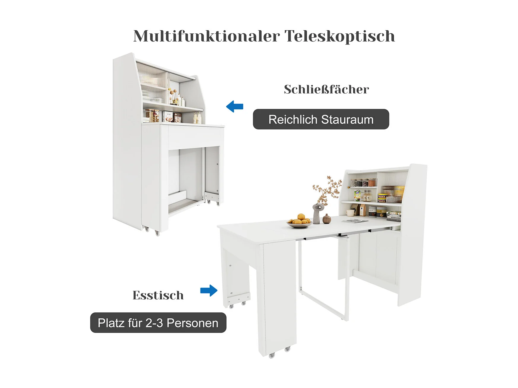 Mesa de comedor extensible, L52/132,5xW80xH76cm, extraíble en una dirección, armario de almacenamiento, ahorra espacio, color blanco.
