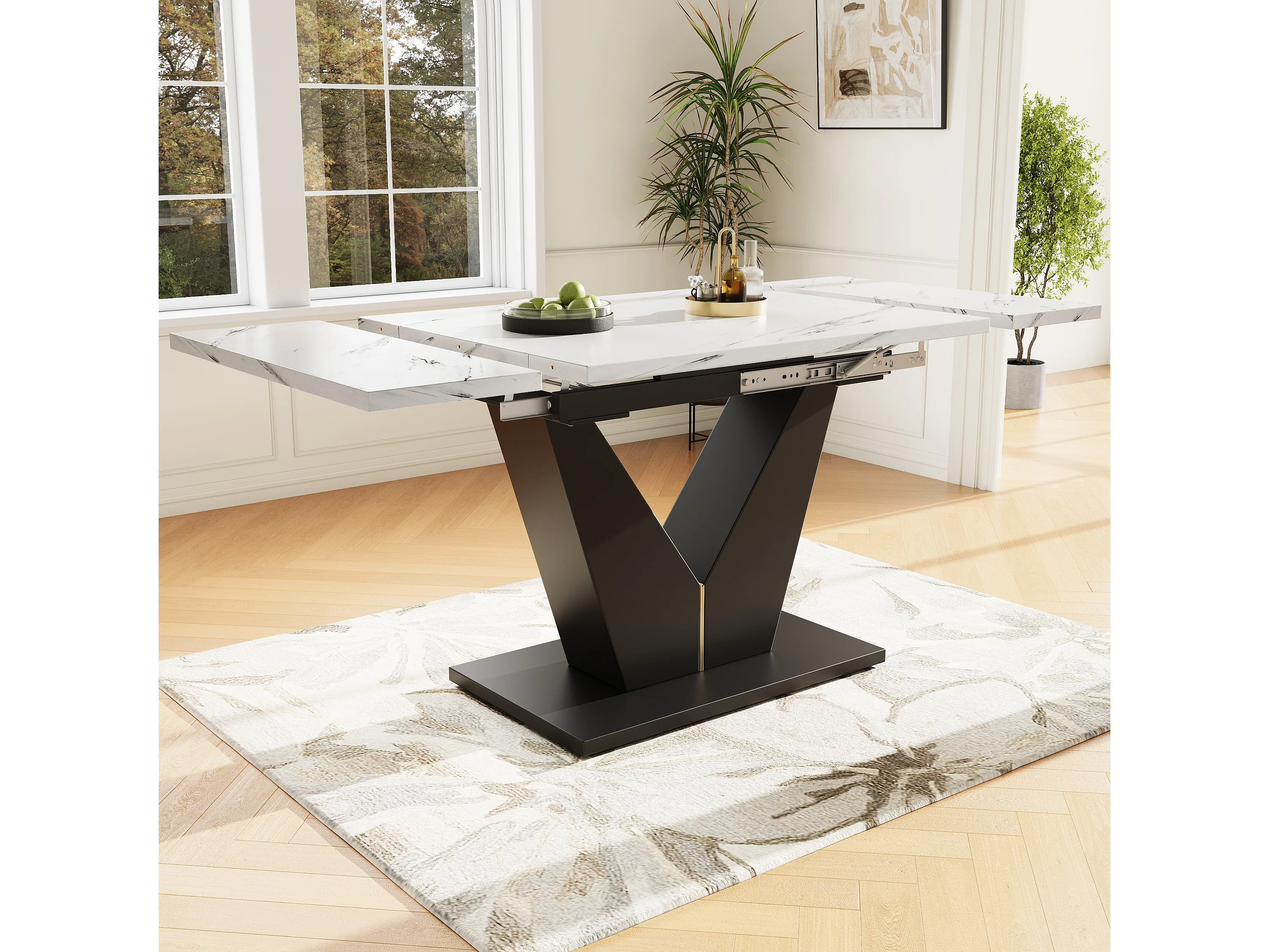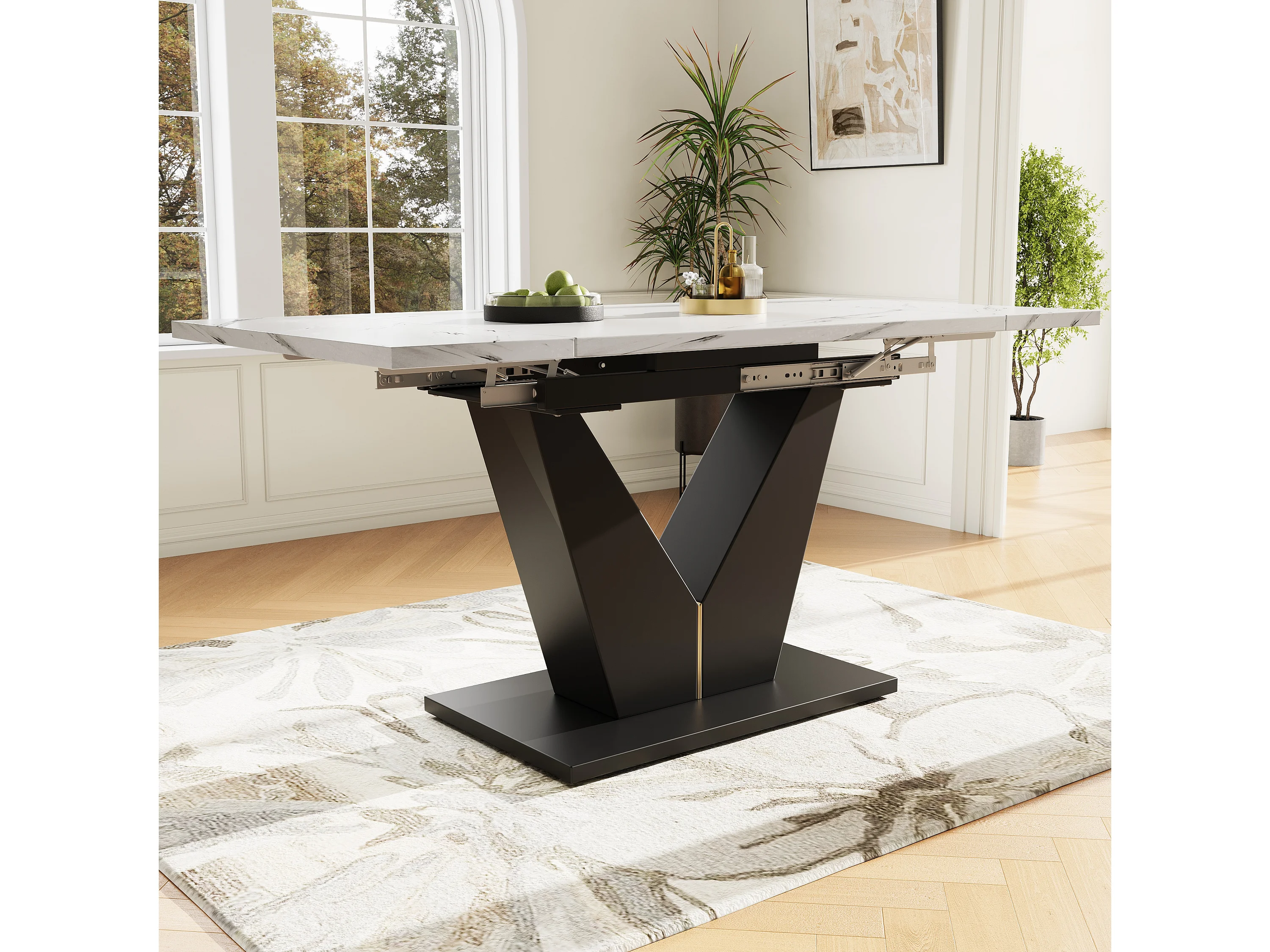 Mesa de comedor retráctil - en MDF y metal - tapa efecto mármol - Blanco