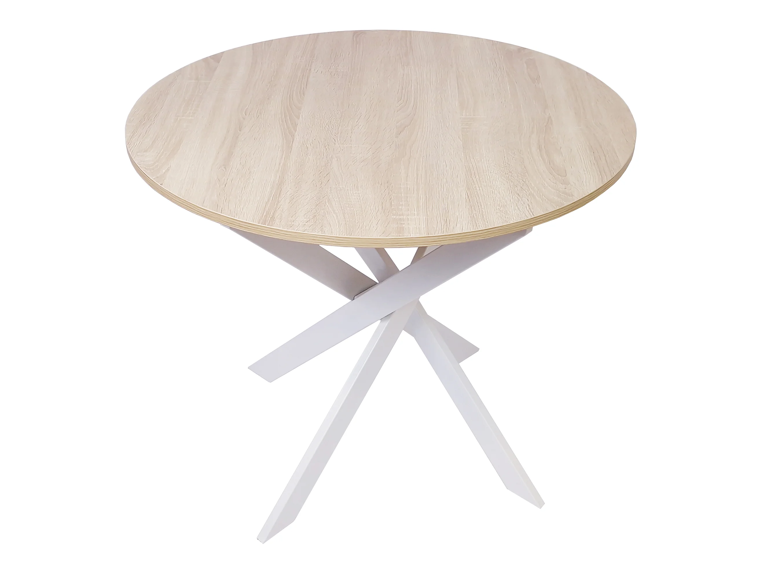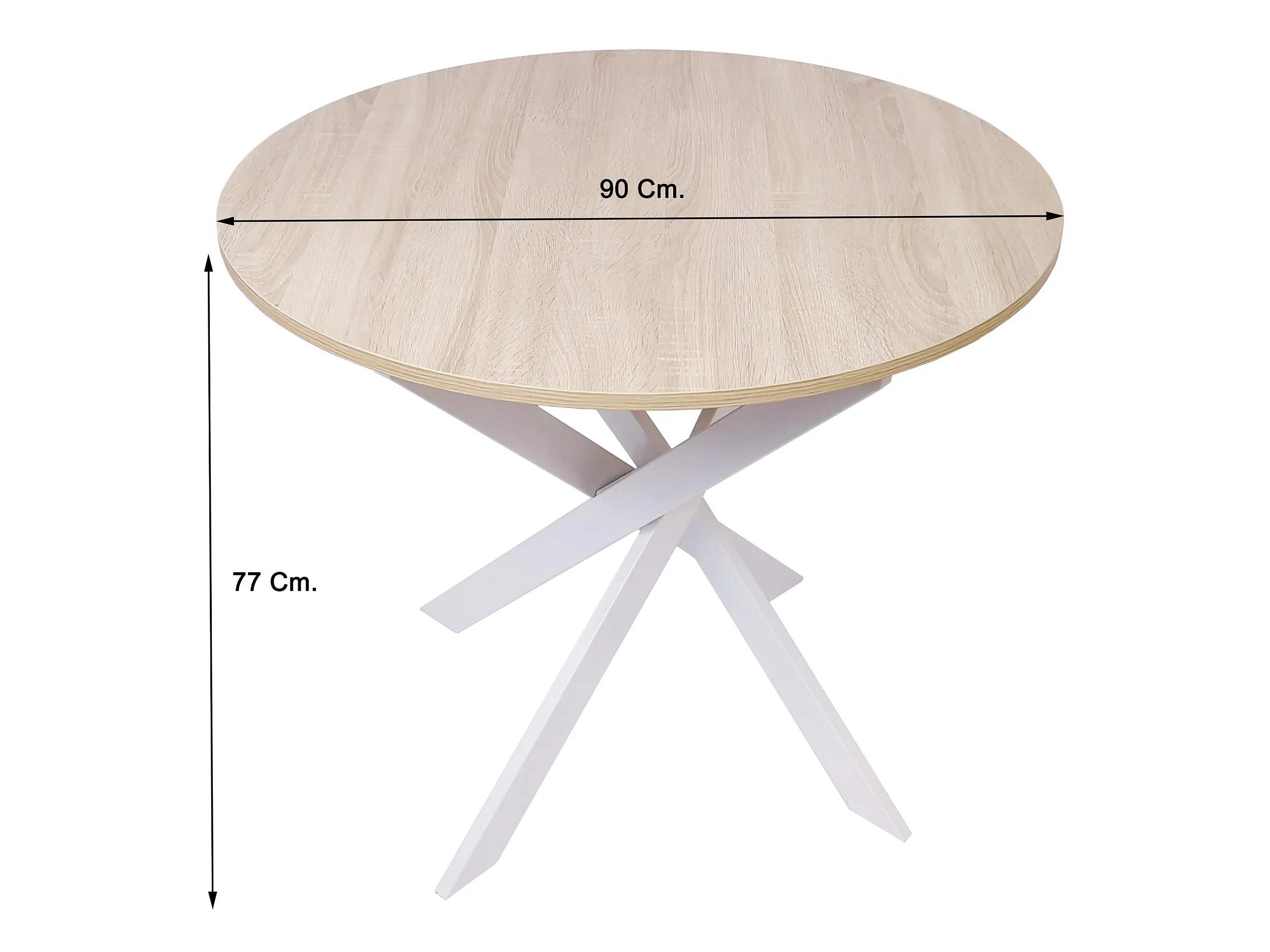 Mesa de comedor fija redonda ZEN, 90x90x77cm, Capacidad hasta 4 personas, Color roble, Patas metálicas blanco lacado mate