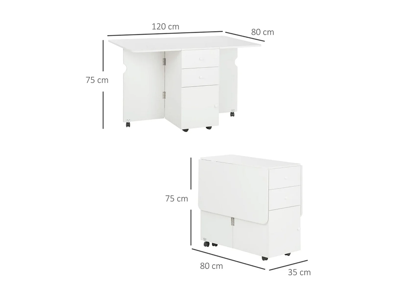 Mesa de comedor Oke Homcom plegable 2 cajones + 1 armario + ruedas blanco 75x35-120x80 cm