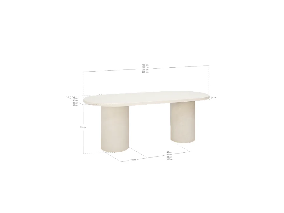Mesa de comedor de madera de abeto maciza en microcemento ovalada y patas cilíndricas de 180x75cm en tono blanco roto - LUCÍA - DECOWOOD