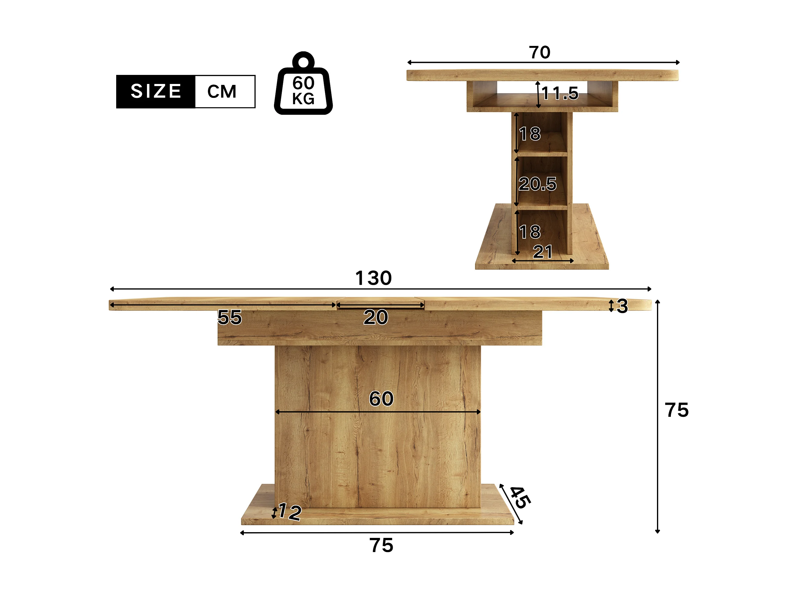 Mesa de comedor rectangular - Mesa de comedor natural con espacio de almacenamiento y tablero ajustable - Para comedor y sala de estar