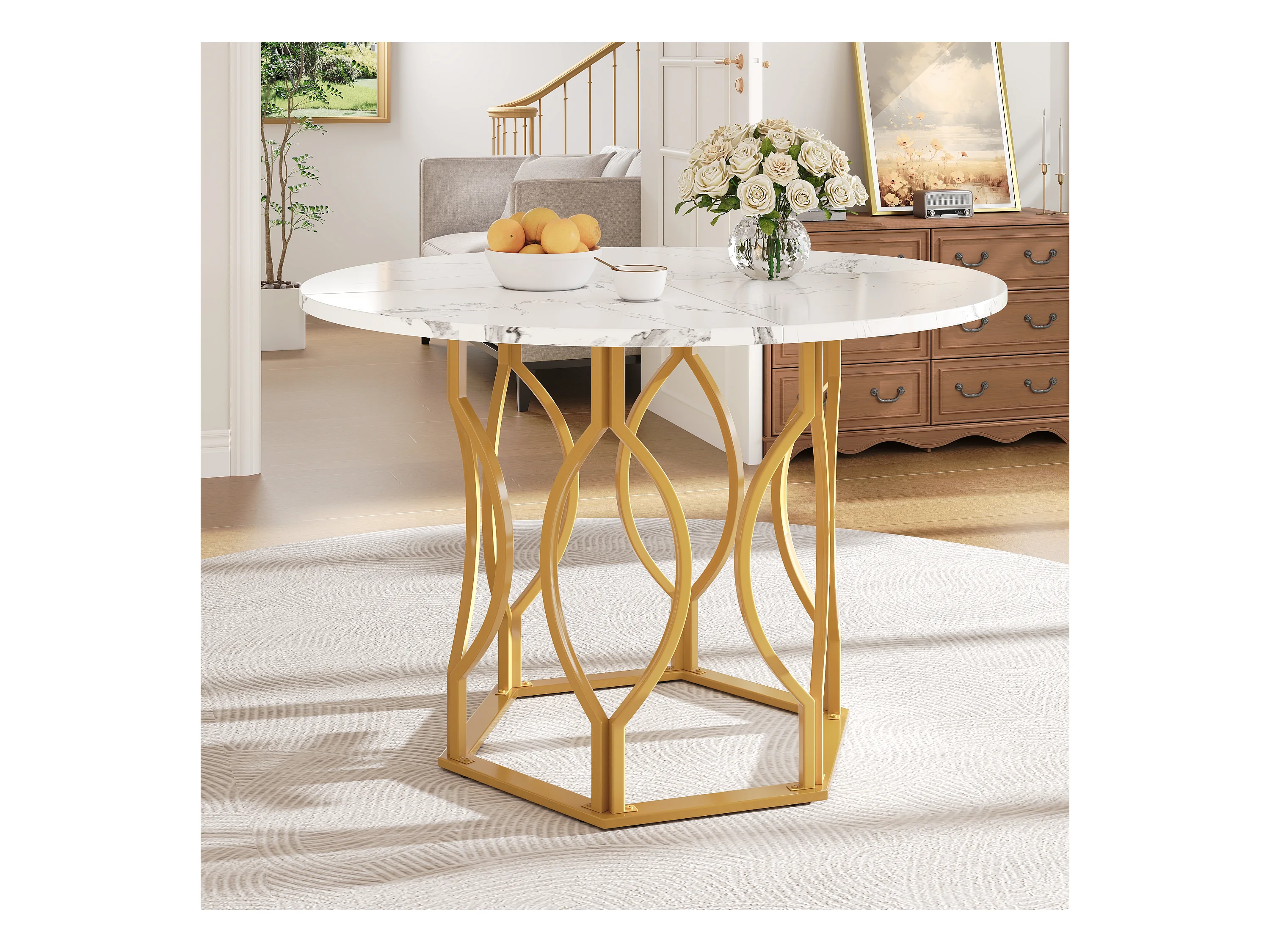 Mesa de comedor redonda de MDF con tablero efecto mármol y base de metal dorado para 4 personas (80 x 80 x 76 cm)