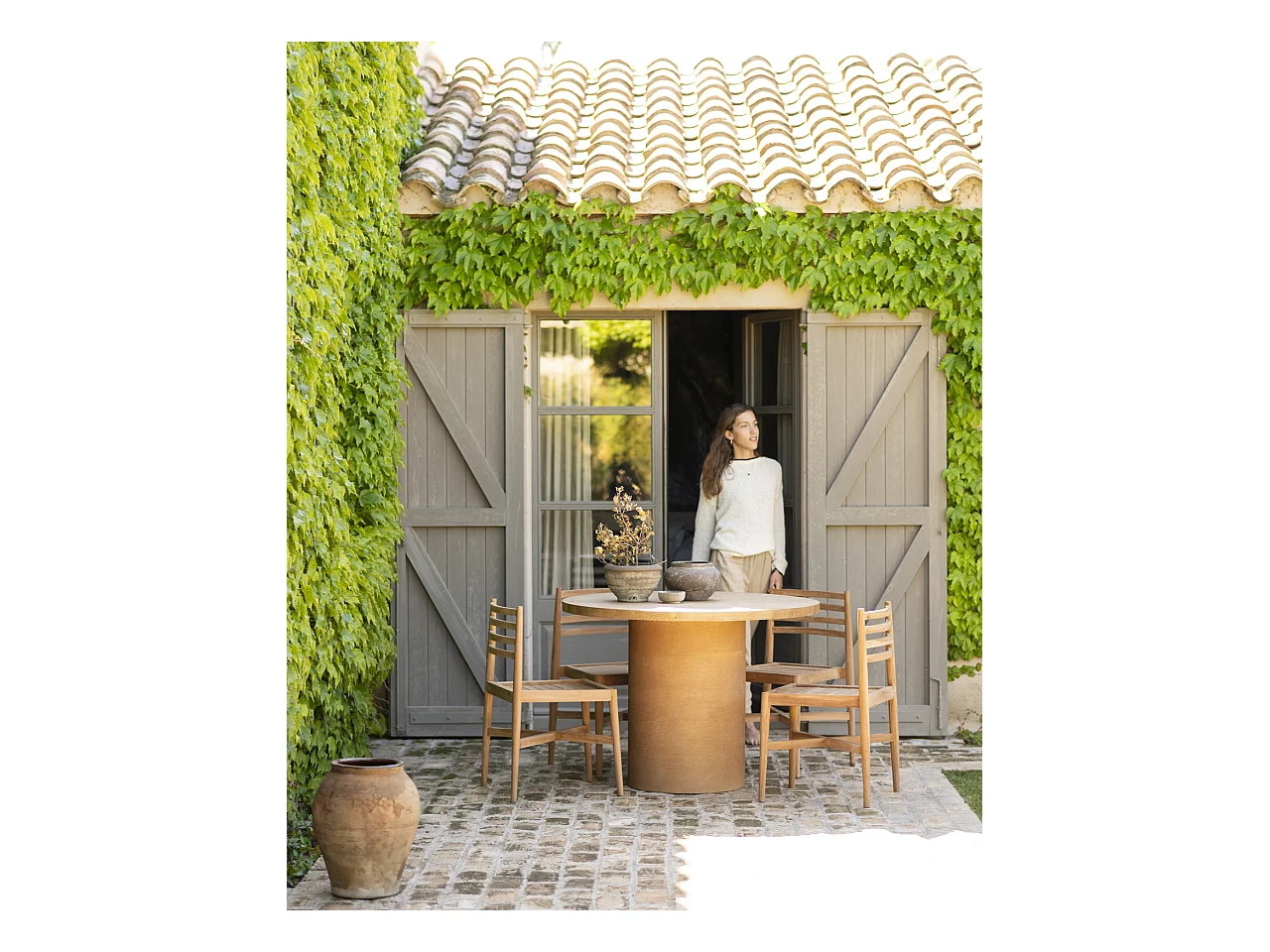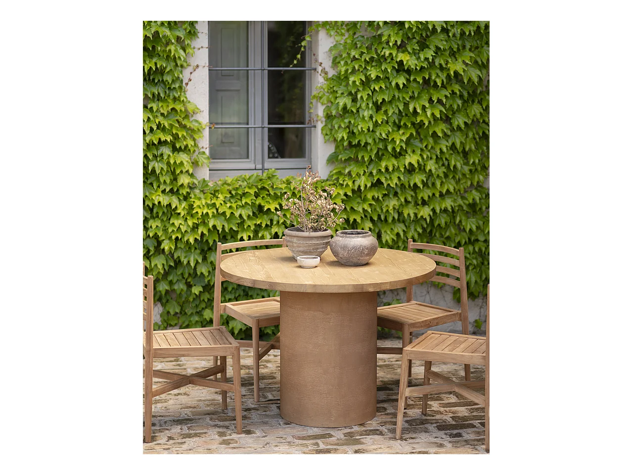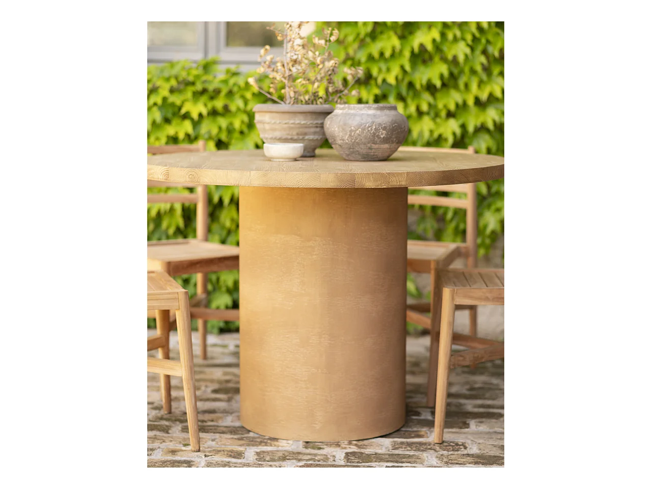 Mesa de comedor redonda de madera maciza tono roble medio y patas de microcemento en tono terracota DECOWOOD de Ø120x75cm - LUCÍA - DECOWOOD
