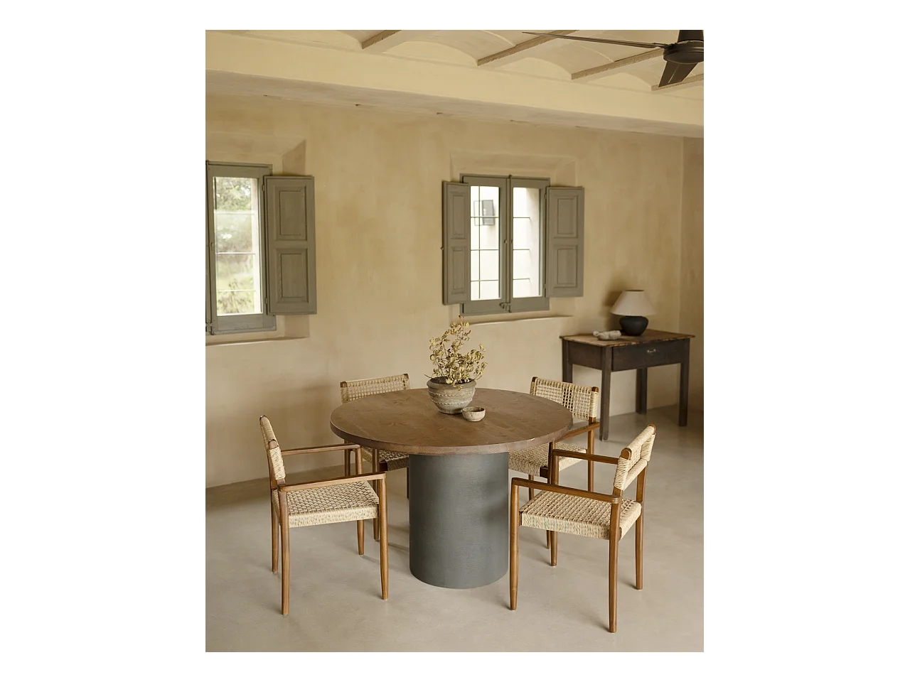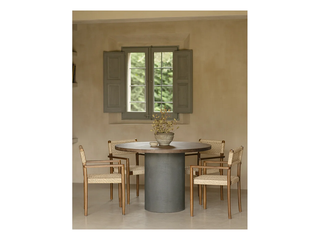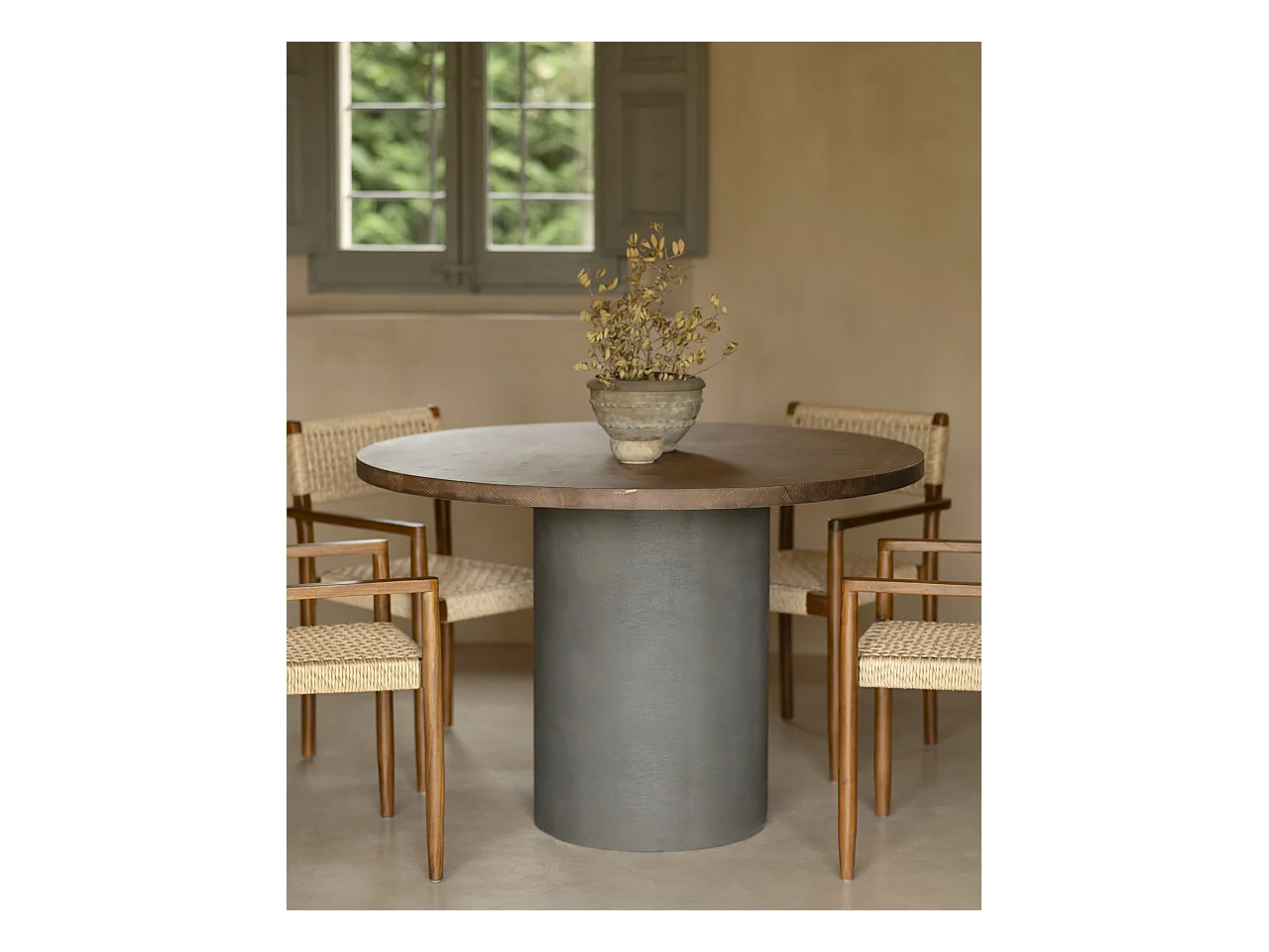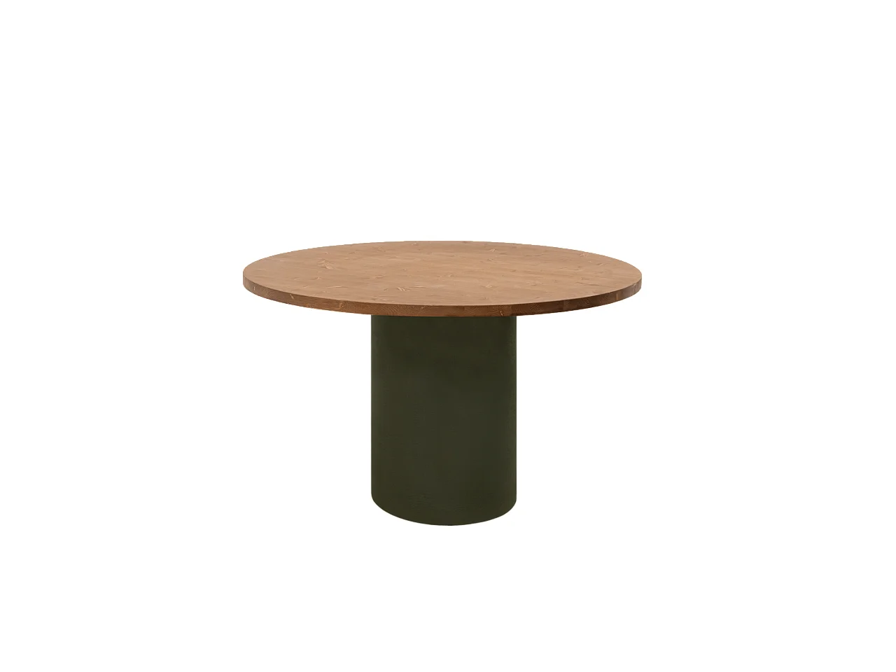 Mesa de comedor redonda de madera maciza tono roble oscuro y patas de microcemento en tono verde DECOWOOD de Ø100x75cm - LUCÍA - DECOWOOD