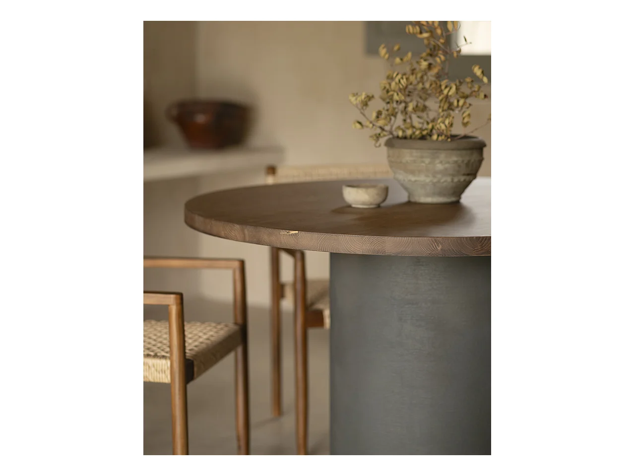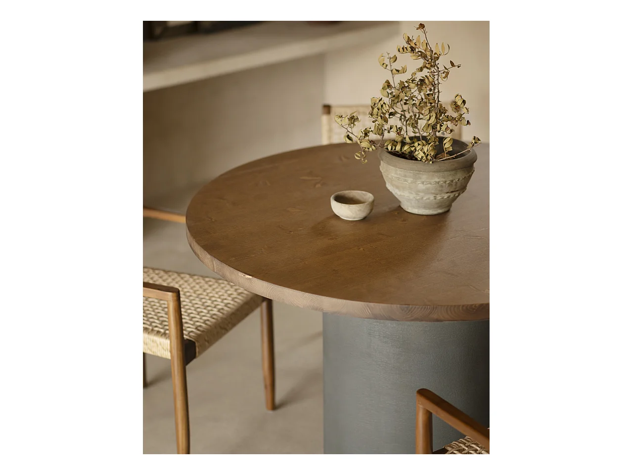 Mesa de comedor redonda de madera maciza tono roble medio y patas de microcemento en tono terracota DECOWOOD de Ø100x75cm - LUCÍA - DECOWOOD