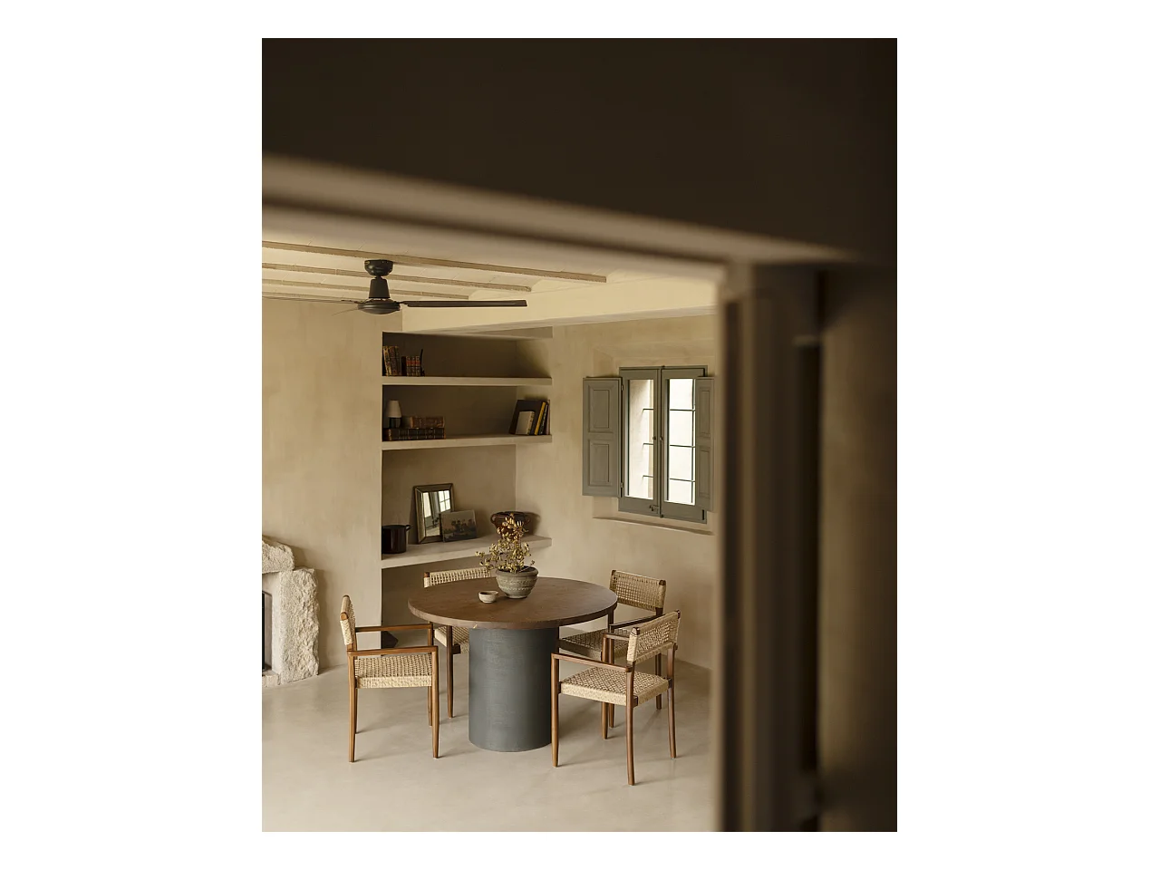 Mesa de comedor de madera de abeto maciza en microcemento redonda y soporte cilíndrico de Ø100x75cm en tono blanco roto - LUCÍA - DECOWOOD