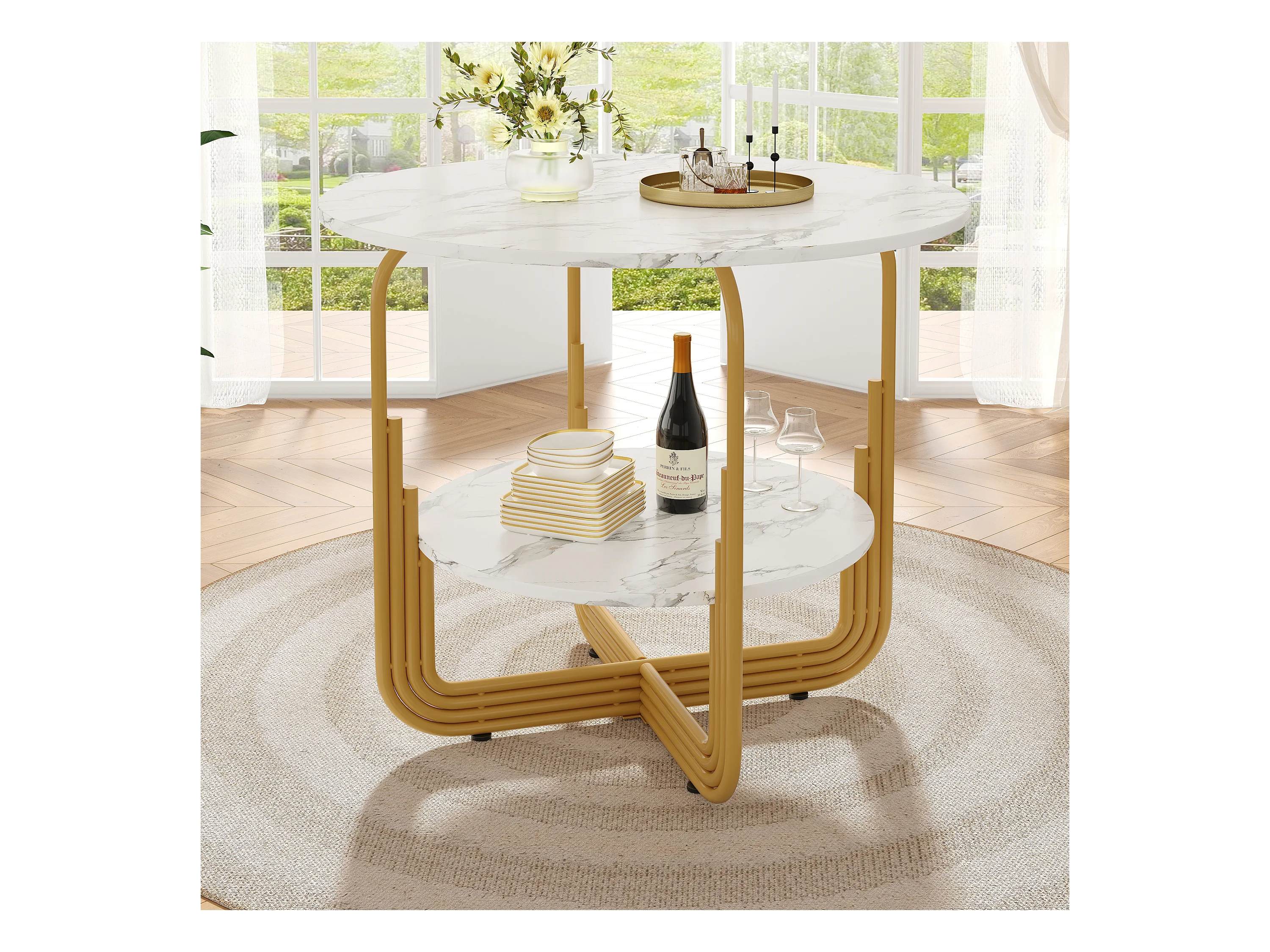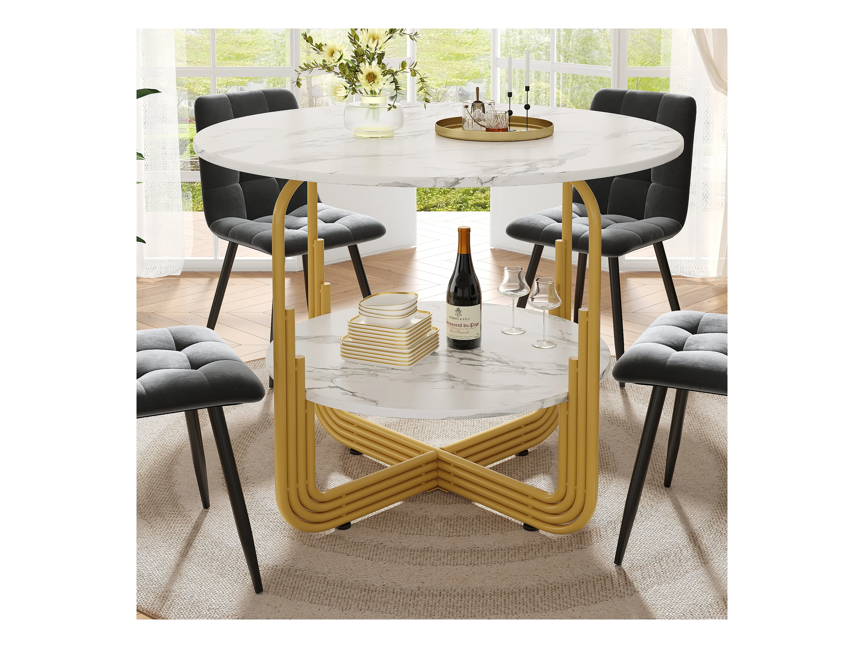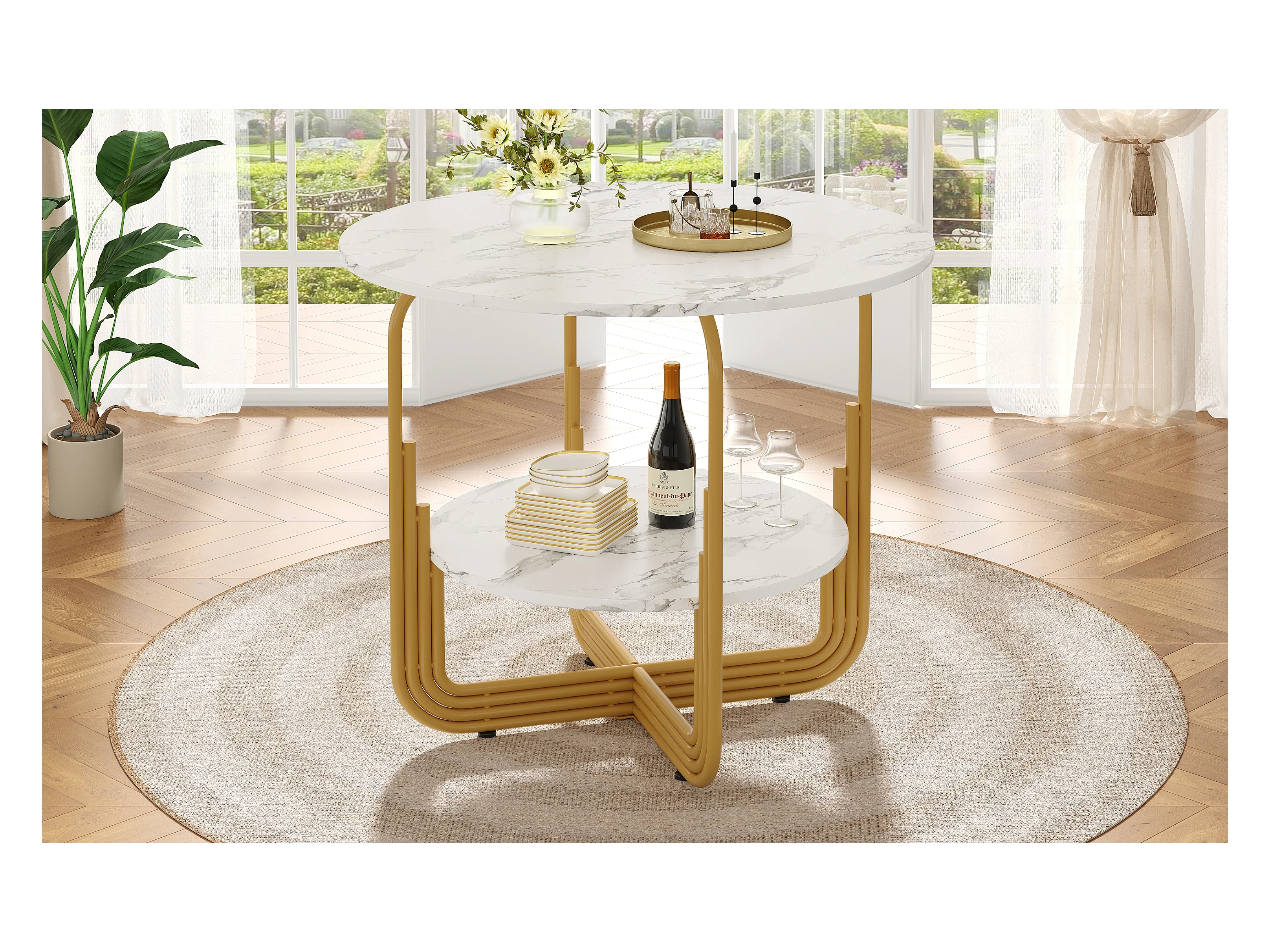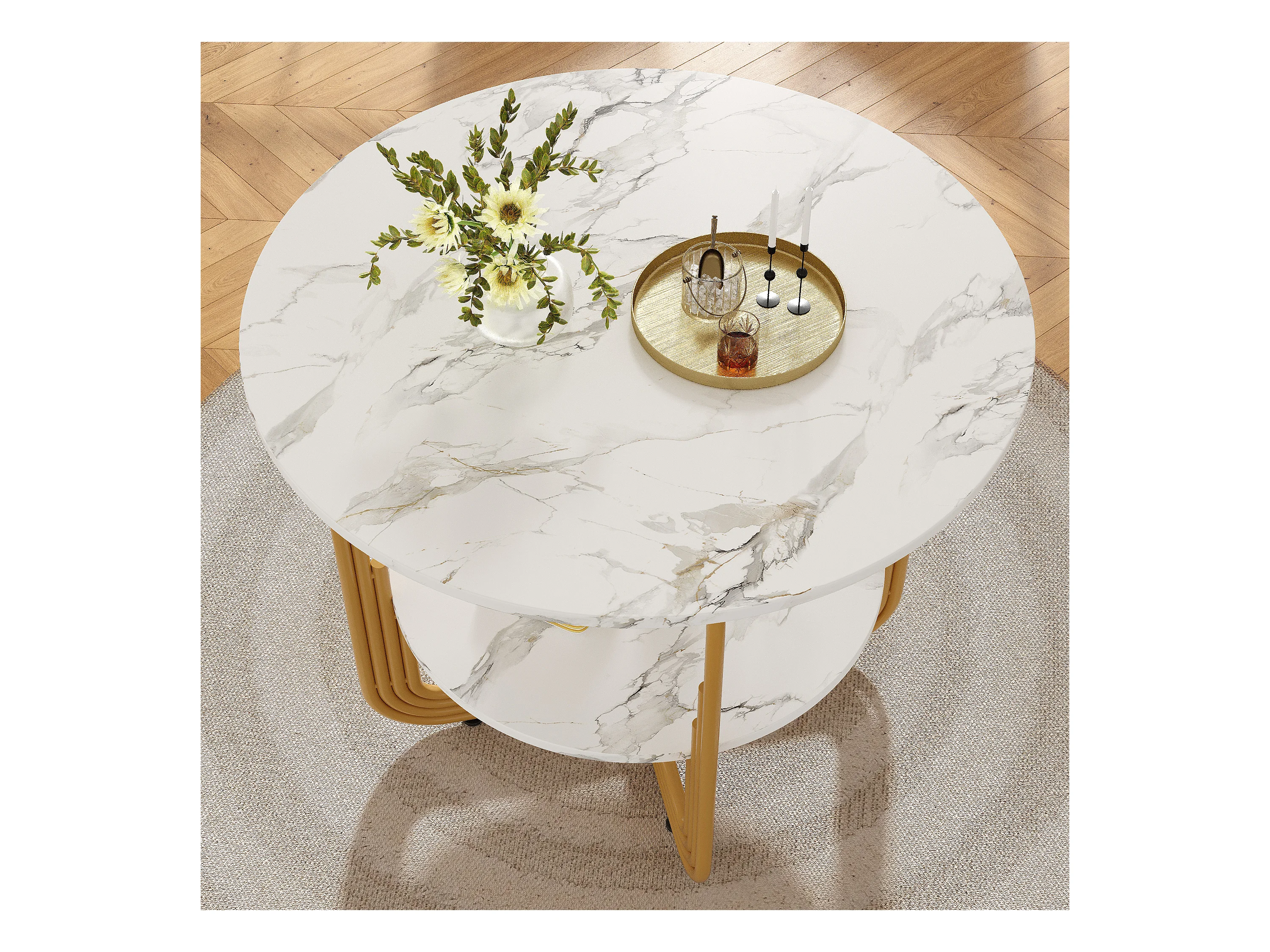 Mesa de comedor redonda de MDF con tablero efecto mármol y base de metal dorado para 4 personas (80 x 80 x 76 cm)