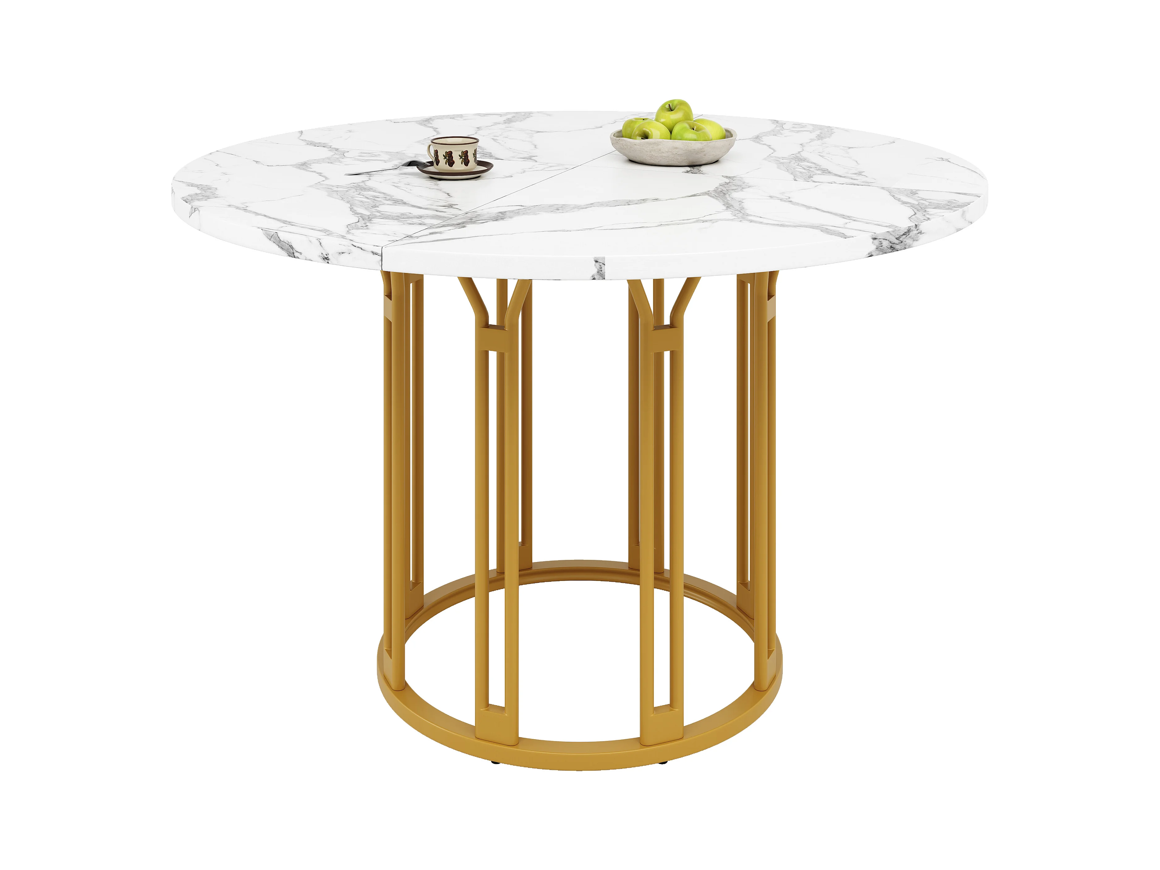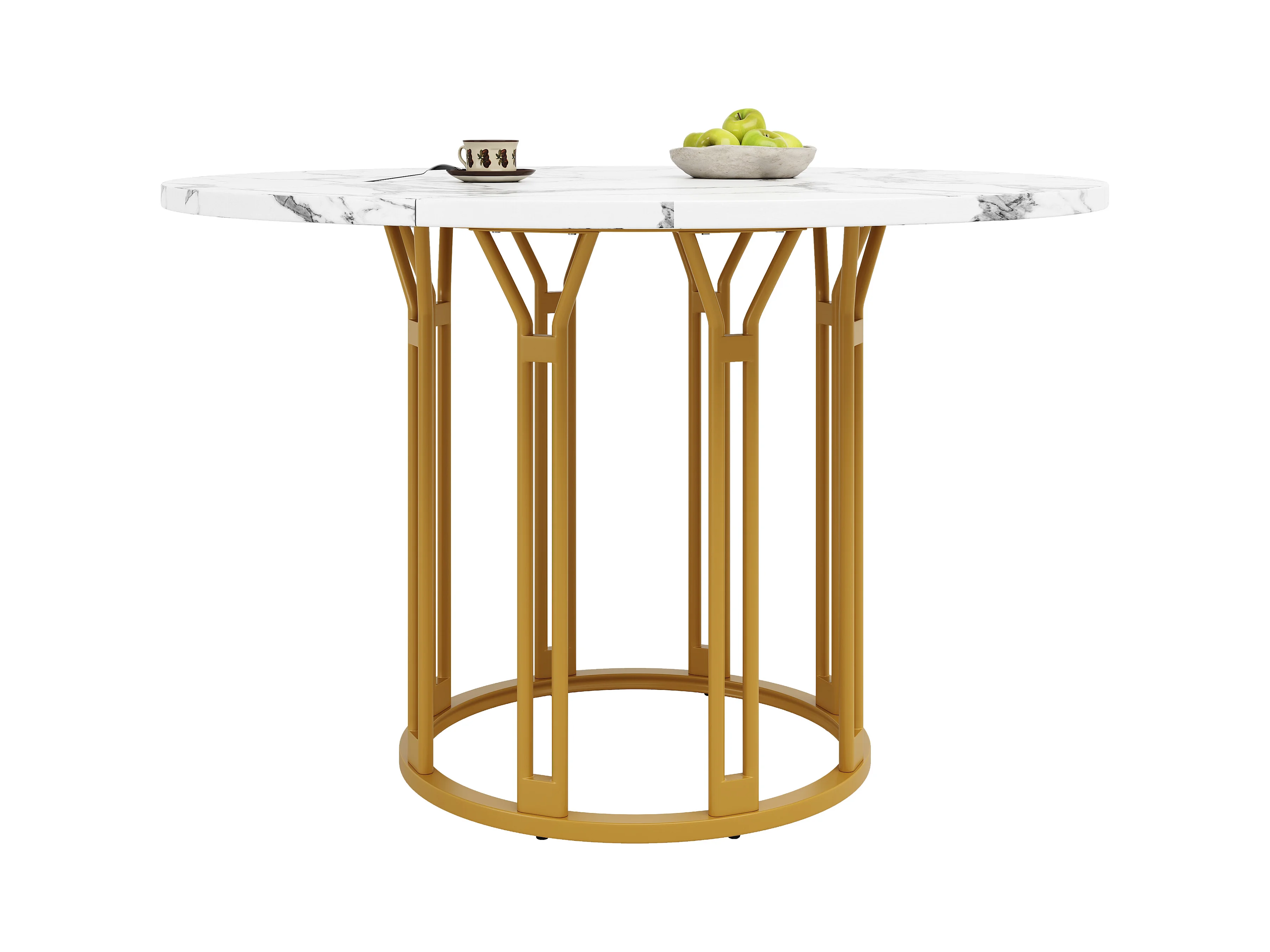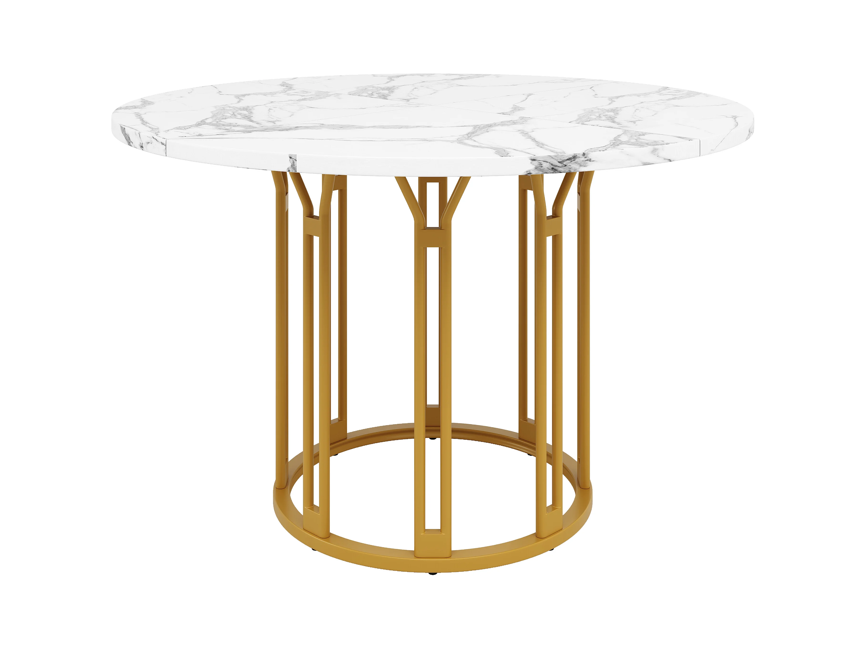 Mesa de comedor redonda 100x100x76cm para 4 personas con tapa chapada en mármol blanco, estructura de metal dorado