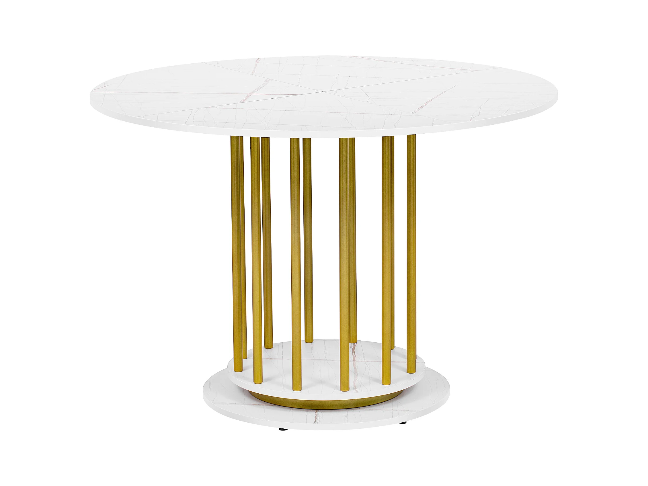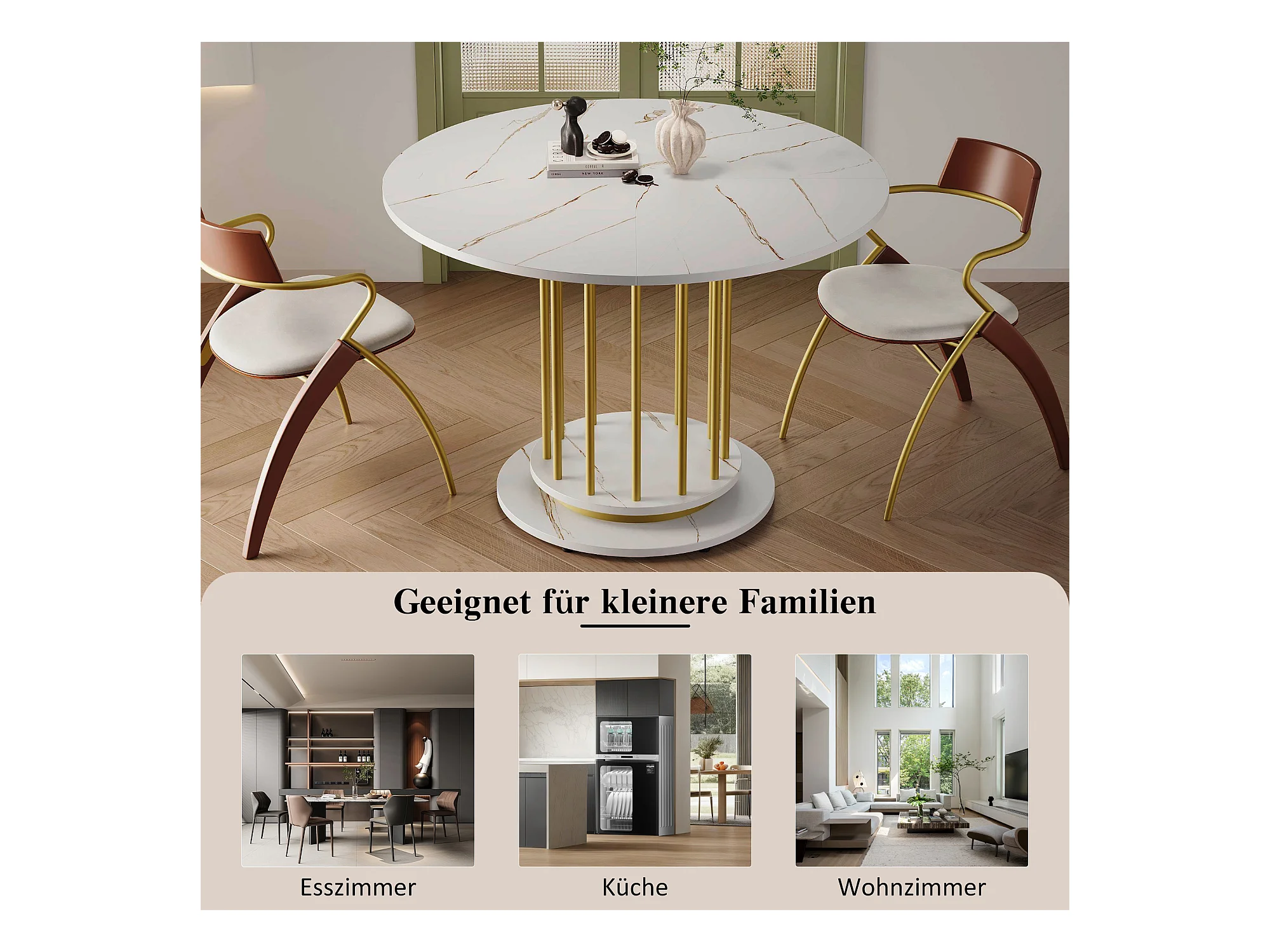 Mesa de comedor redonda efecto mármol, diseño moderno con patas de metal, ideal para 2-4 personas, color blanco y dorado (110x110x74,6 cm)
