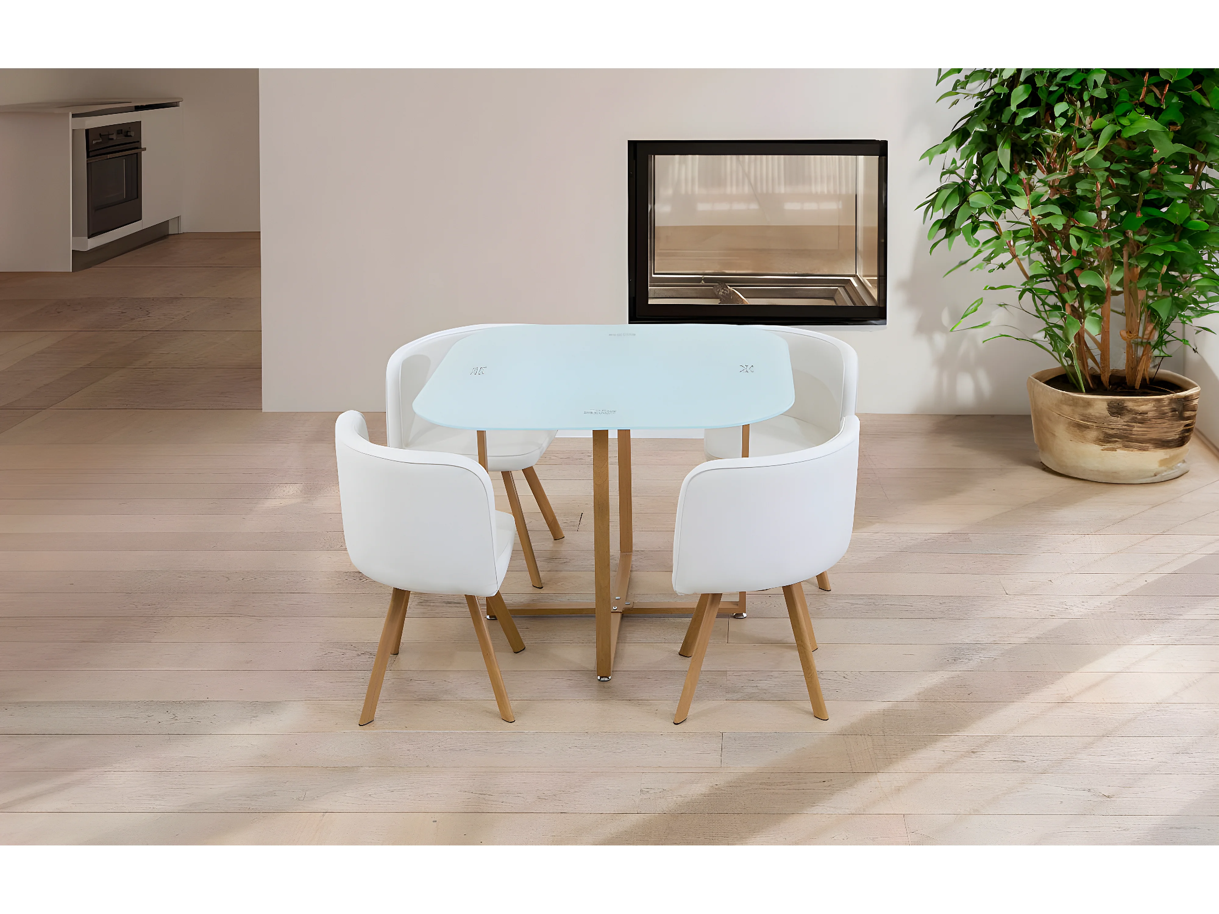 Mesa de Cristal Templado Teka + 4 Sillas. Comedor o Cocina Blanco 100x100 cm