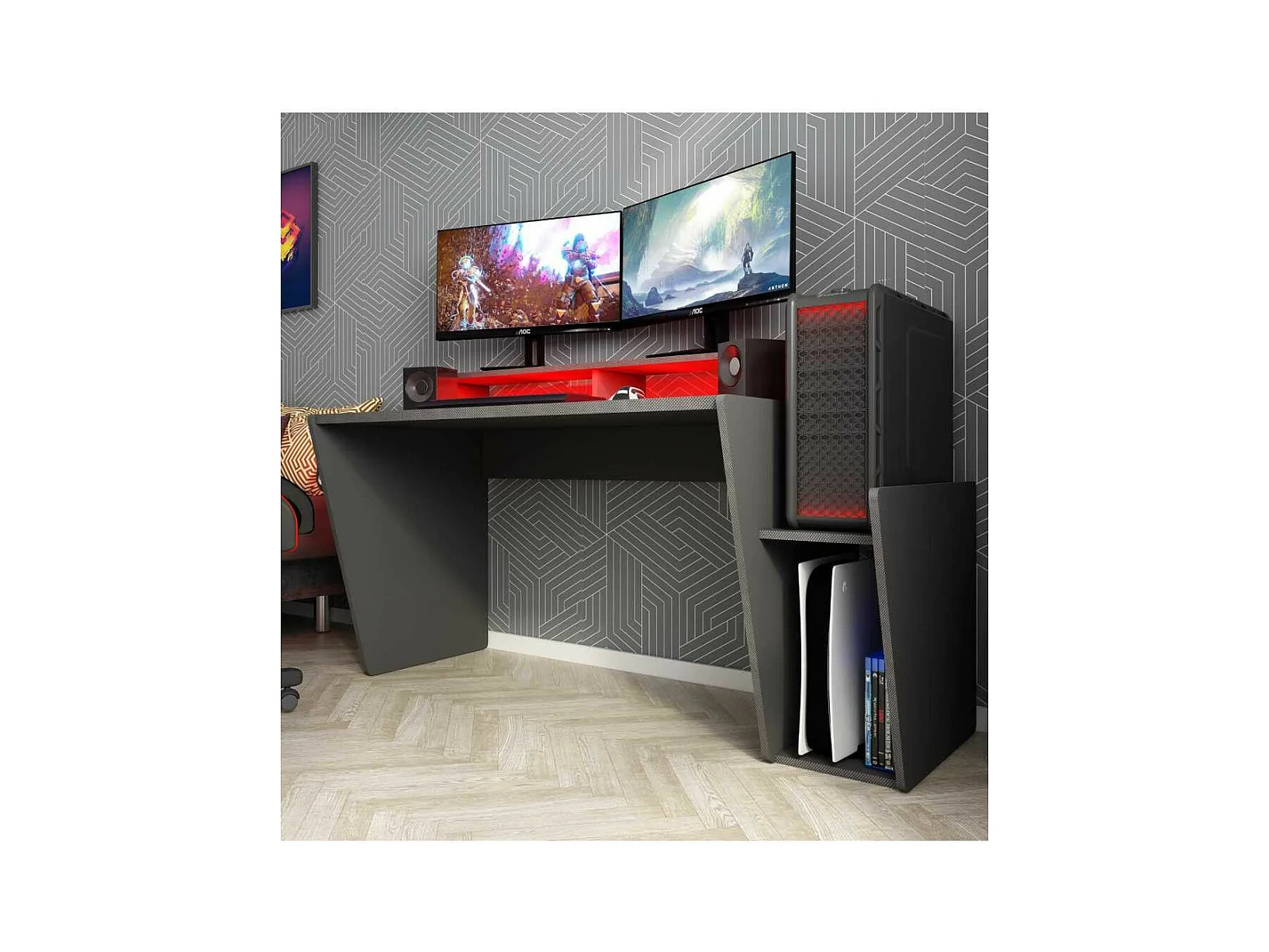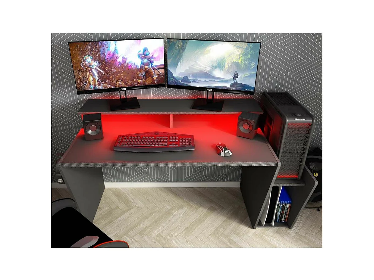 Mesa de escritorio gaming de 86x150x47 cm en color negro con almacenaje y luces LED Touma