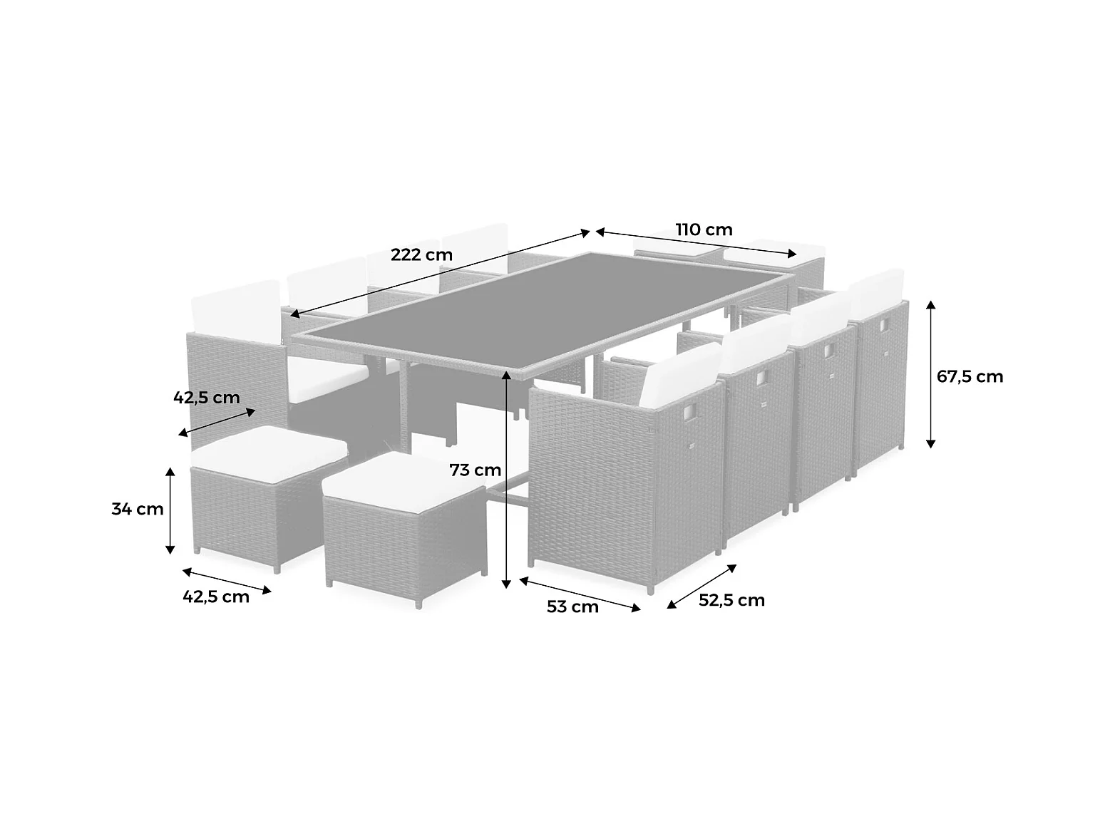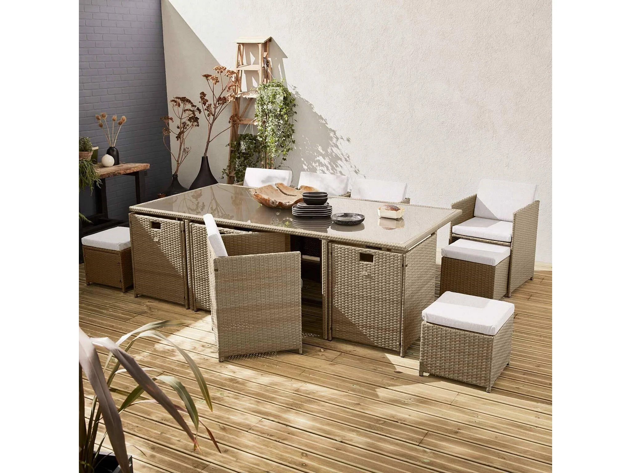 Mesa de jardín encastrable de resina trenzada 12 sillones + funda