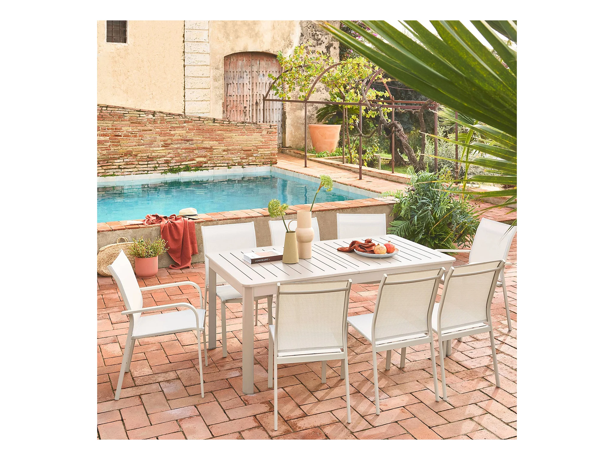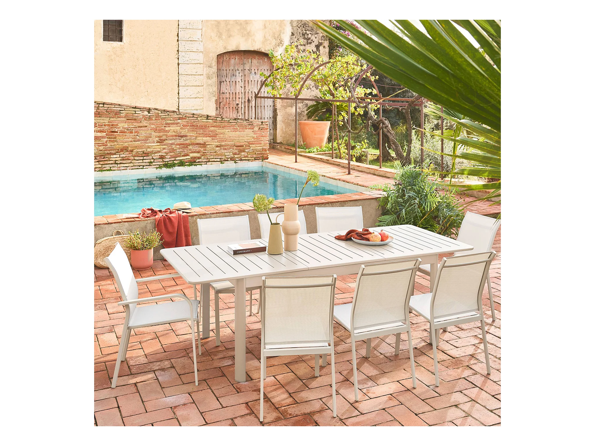 Mesa de jardín extensible de aluminio con 10 sillas beige