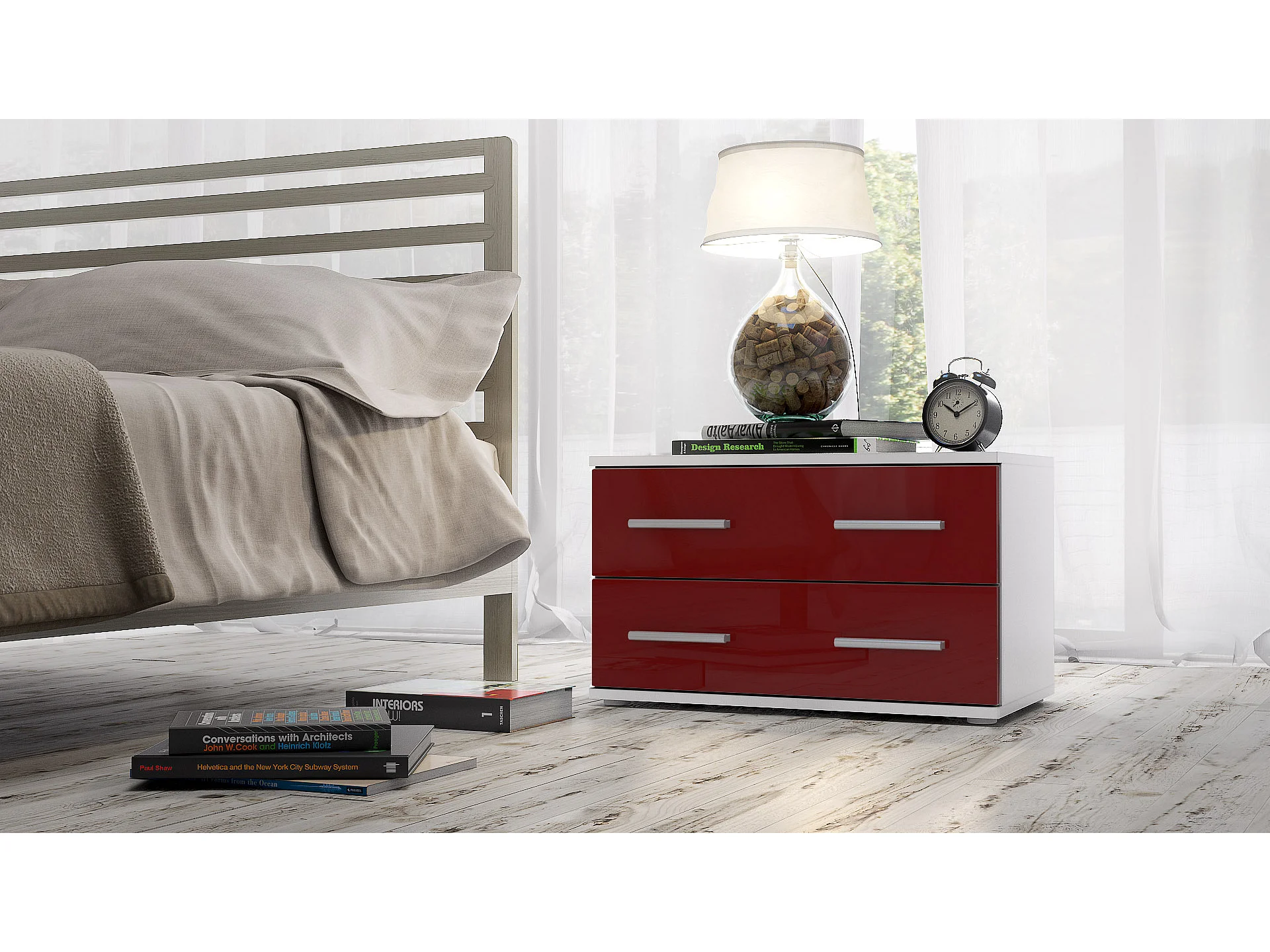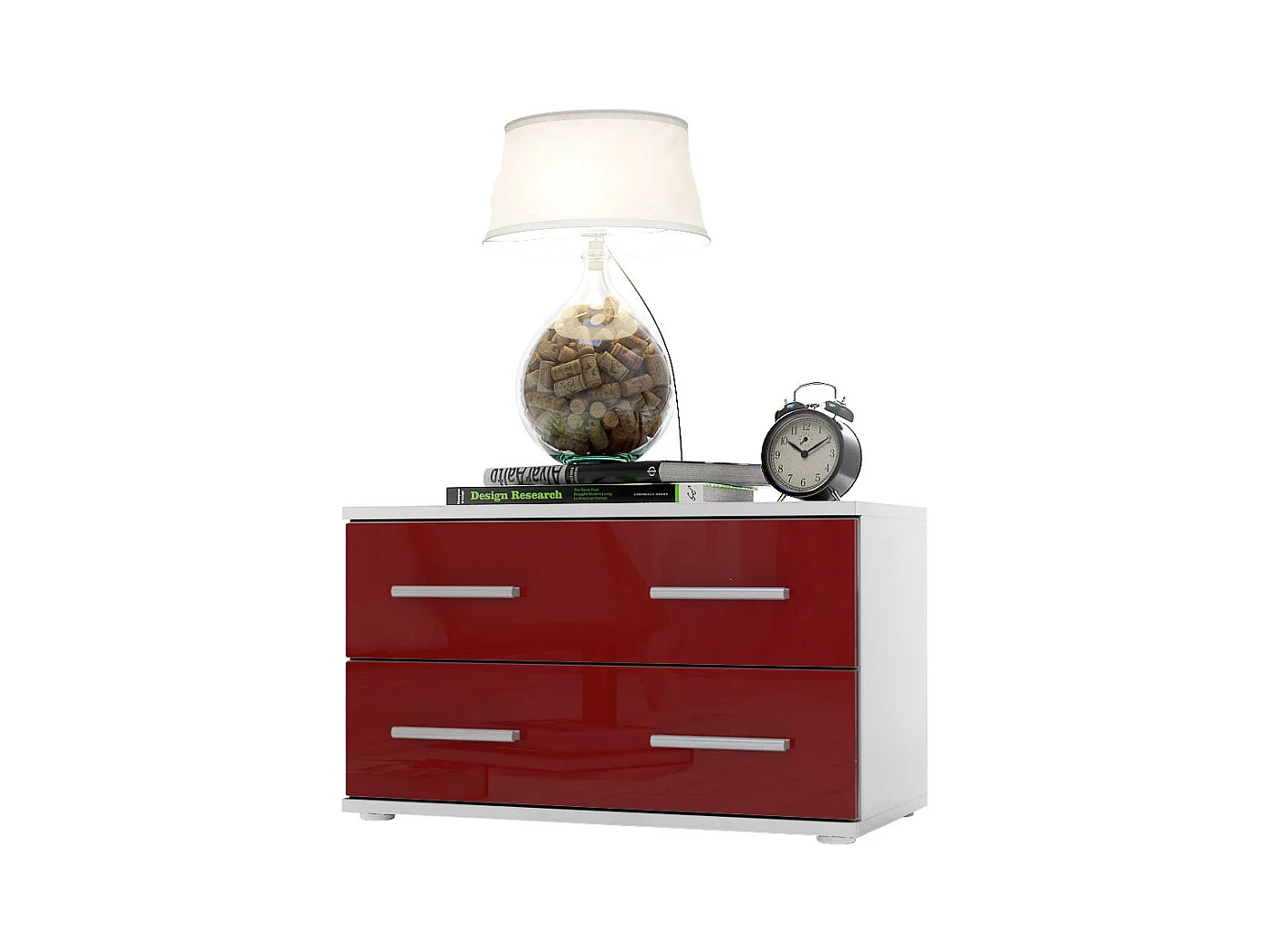 Mesa de noche Kioto, Cuerpo en Blanco mate / Frontal en Color Burdeos alto brillo