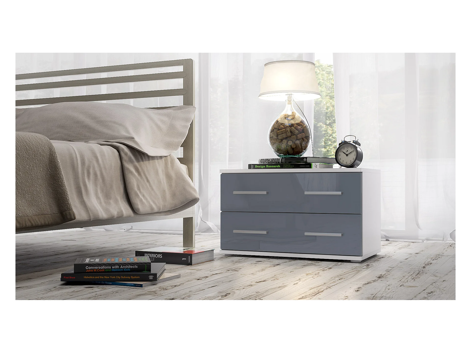 Vladon Mesita de noche Queens, Cómoda de noche con 2 Cajones y 1 Compartimento lateral para Montaje en Pared, Blanco mate/Gris de alto brillo (60 x 63 x 36 cm)