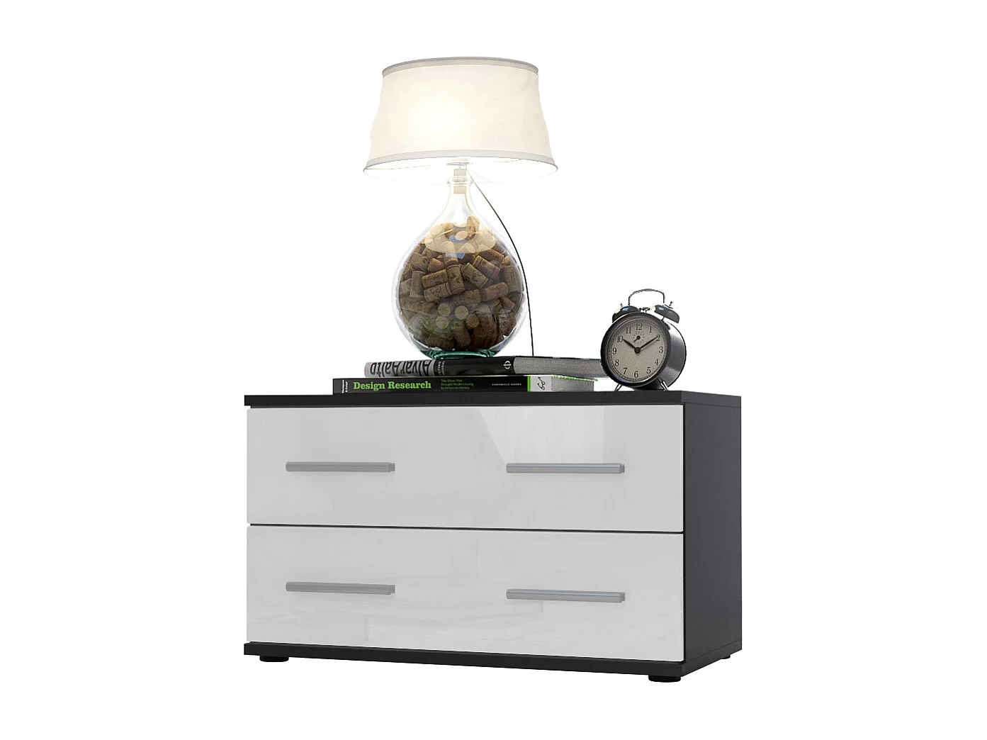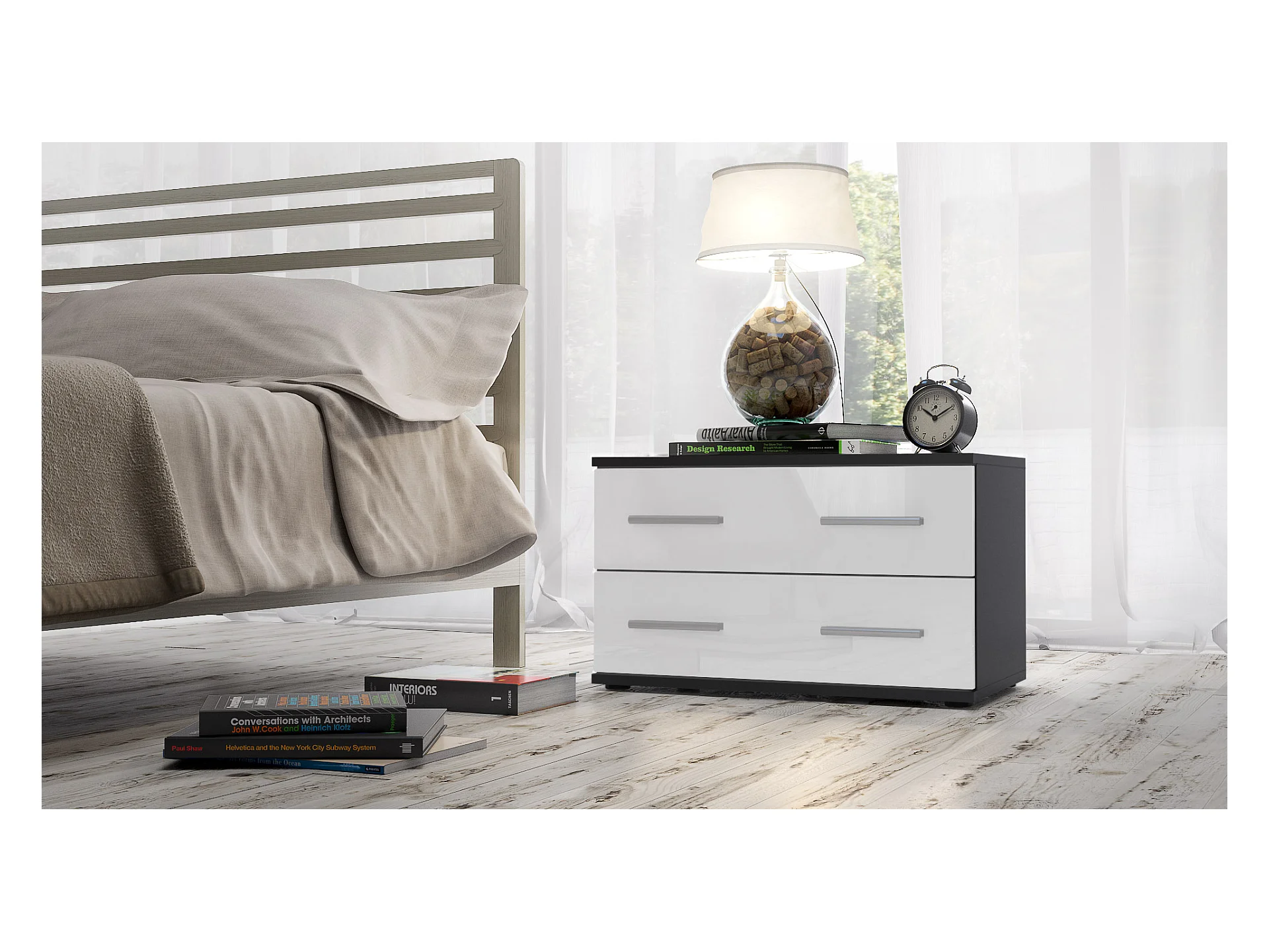 Vladon Mesita de noche Queens, Cómoda de noche con 2 Cajones y 1 Compartimento lateral para Montaje en Pared, Negro mate/Blanco de alto brillo (60 x 63 x 36 cm)