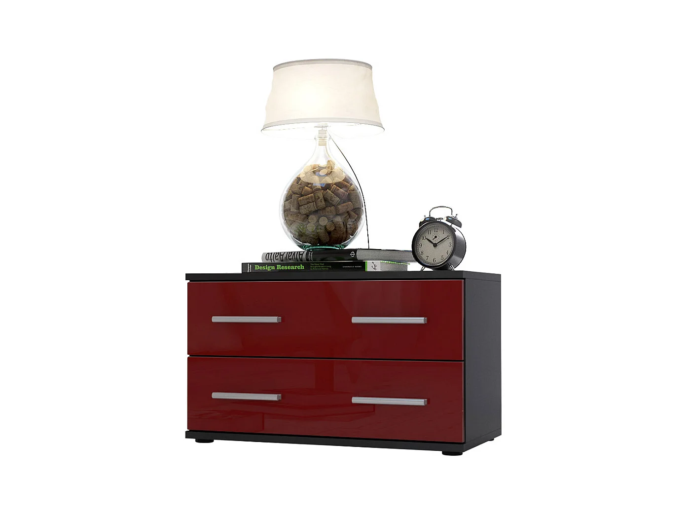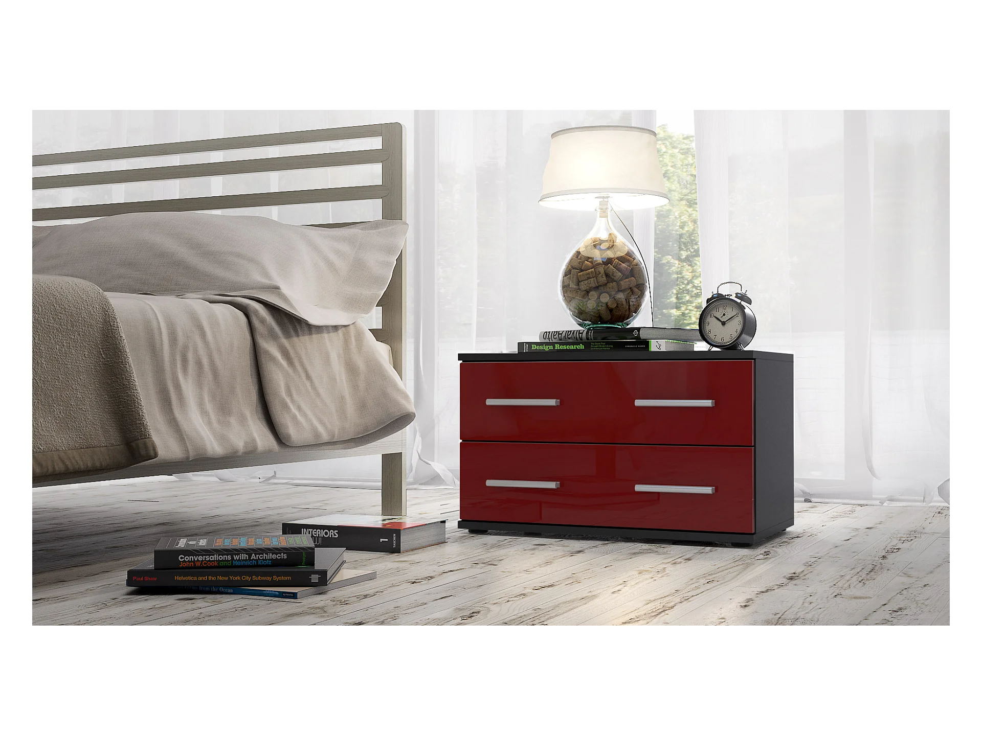 Vladon Mesita de noche Queens, Cómoda de noche con 2 Cajones y 1 Compartimento lateral para Montaje en Pared, Negro mate/Burdeos de alto brillo (60 x 63 x 36 cm)