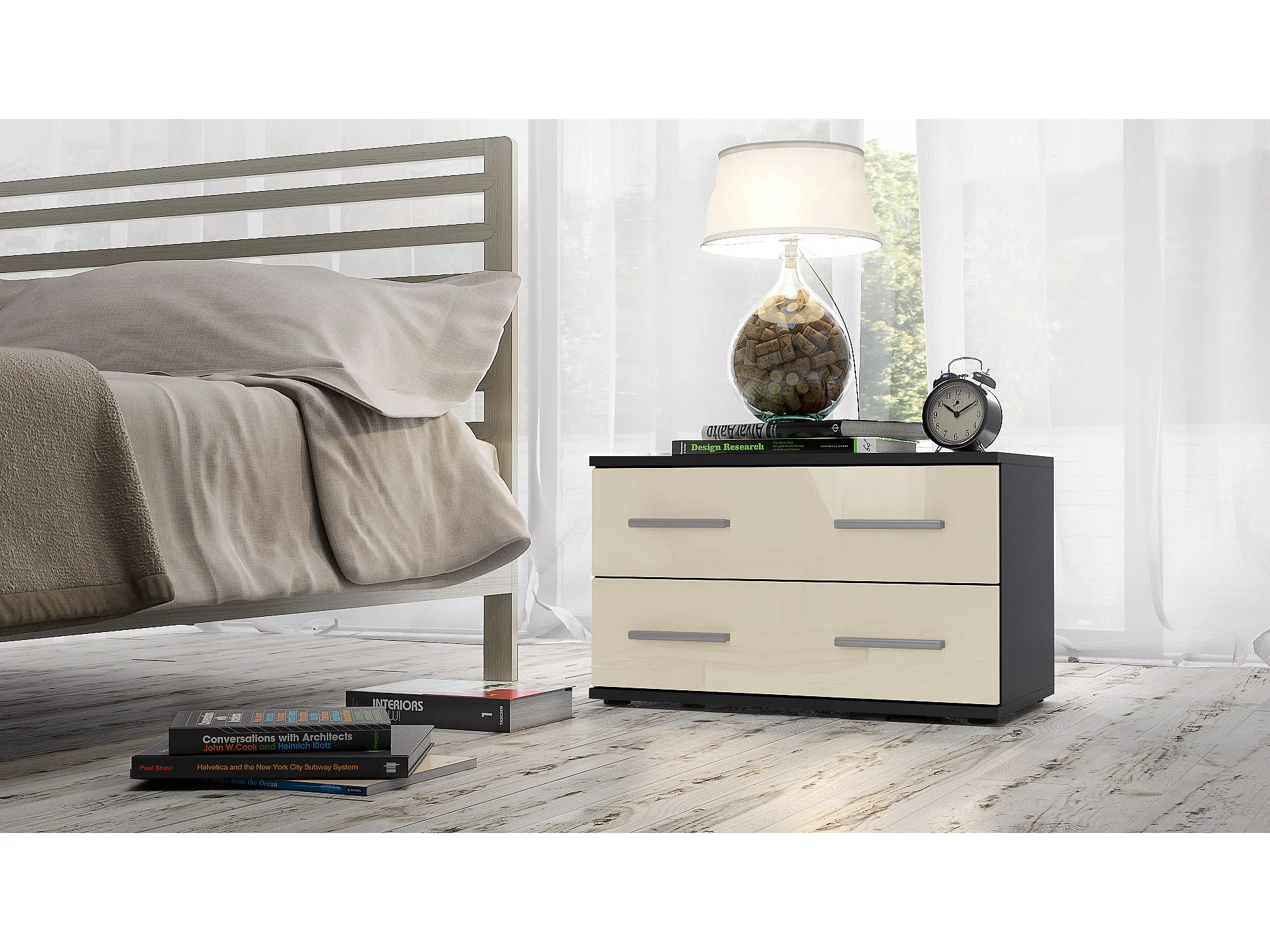 Mesa de noche Kioto, Cuerpo en Negro mate / Frontal en Color Crema alto brillo
