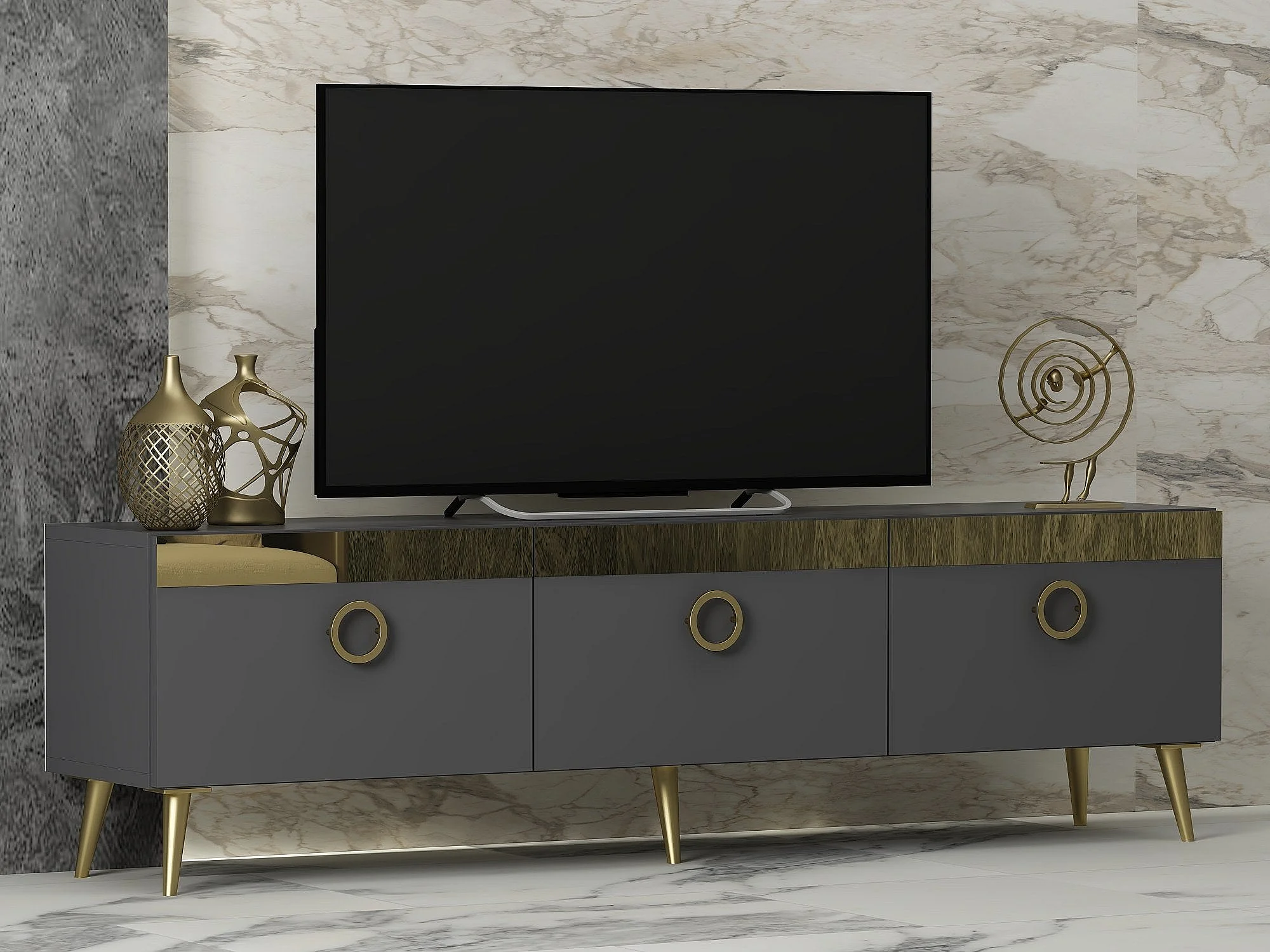Mesa de tv Kailua 1962, Dorado|Antracita, 150x45x30cm