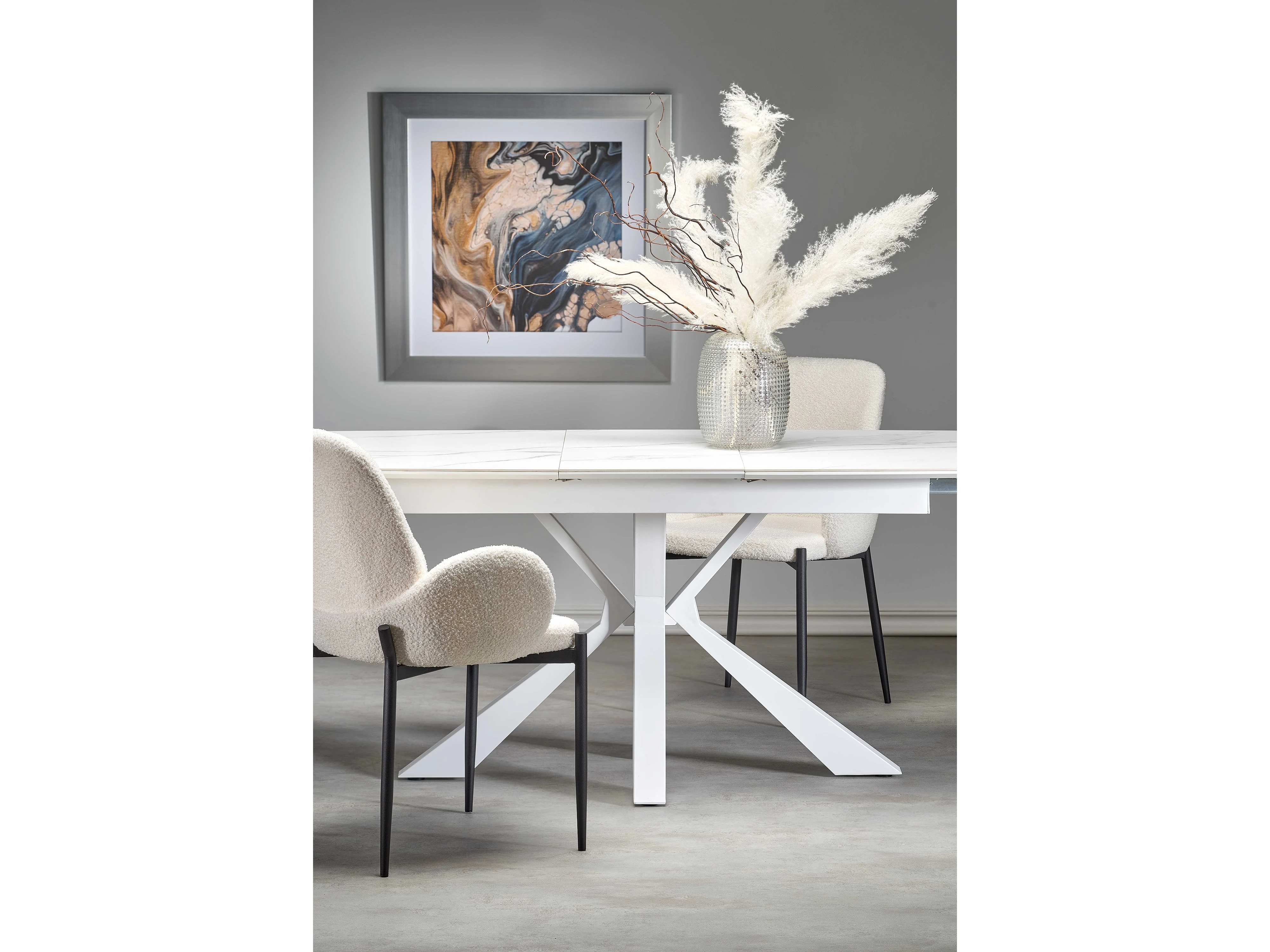 Mesa extensible contemporánea con tablero de aspecto mármol y pata central de diseño metálico blanco HORN