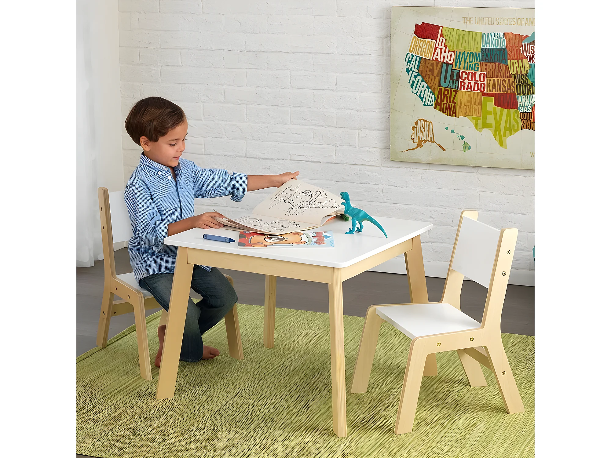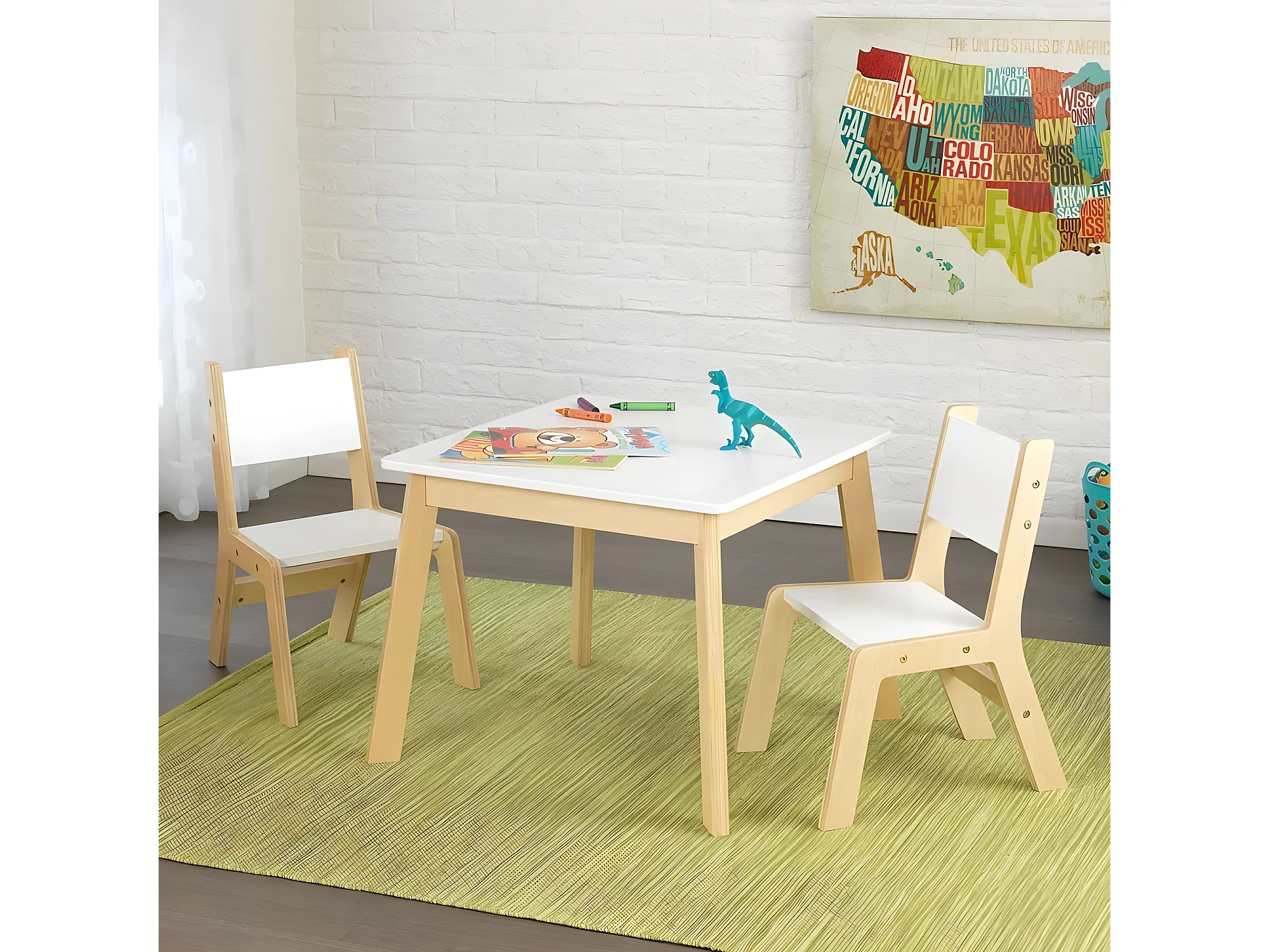 Mesa, sillas y caja de madera para niños Coeur