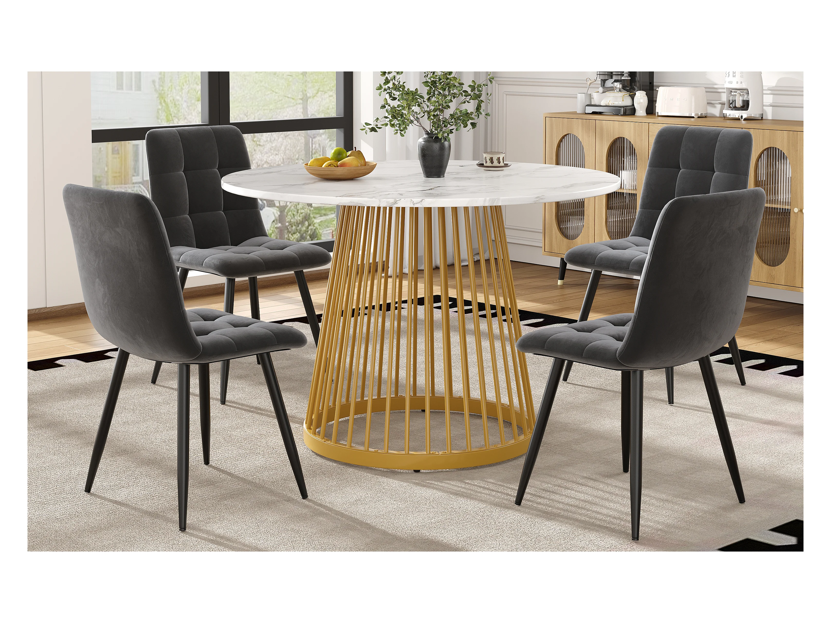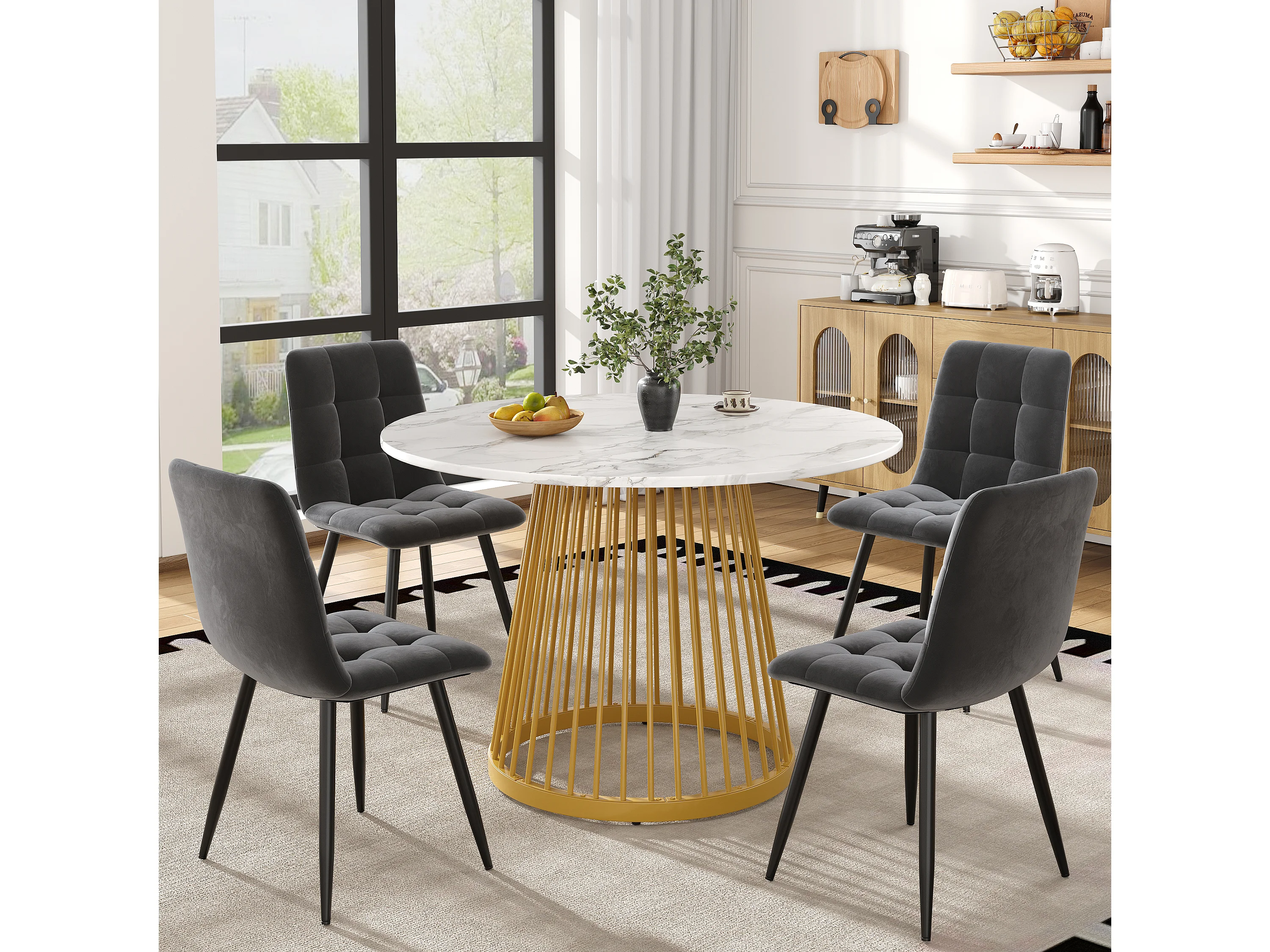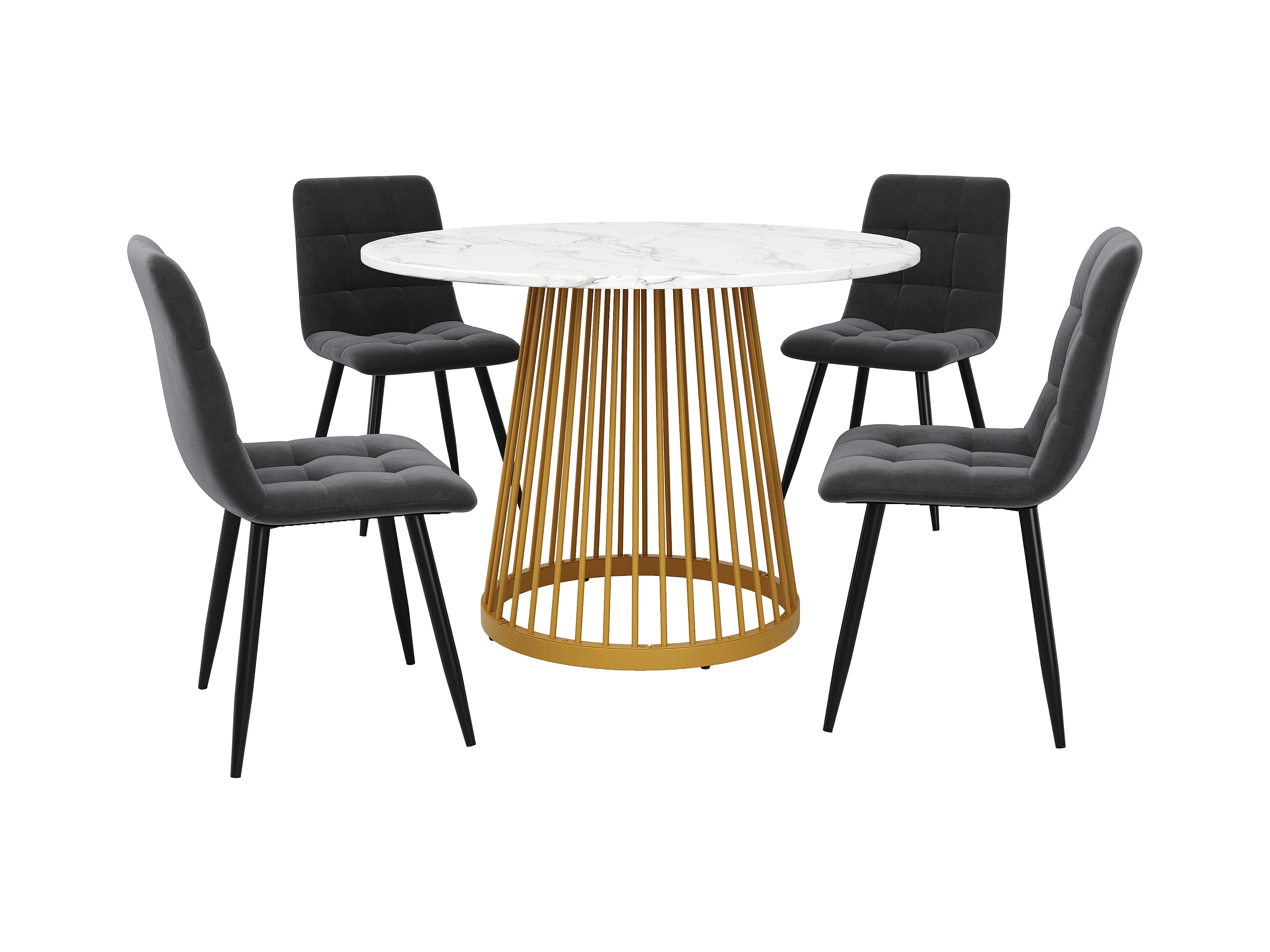 Mesa redonda blanca de 80 cm con 4 sillas de terciopelo gris y patas de metal dorado, juego de comedor moderno