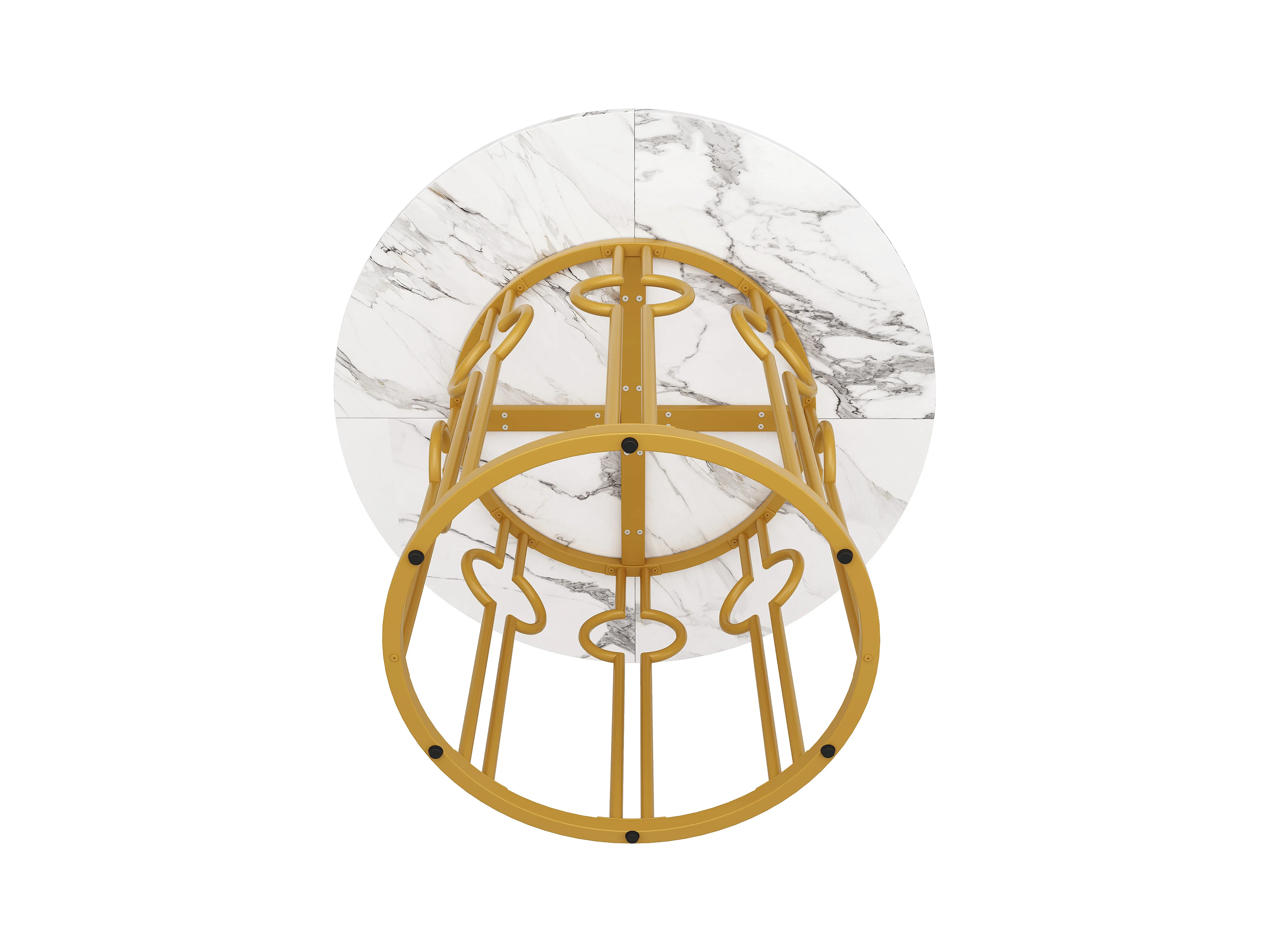 Mesa redonda de lujo, tablero de MDF marmolado, patas de metal dorado, para comedor y salón (100x100x76cm)
