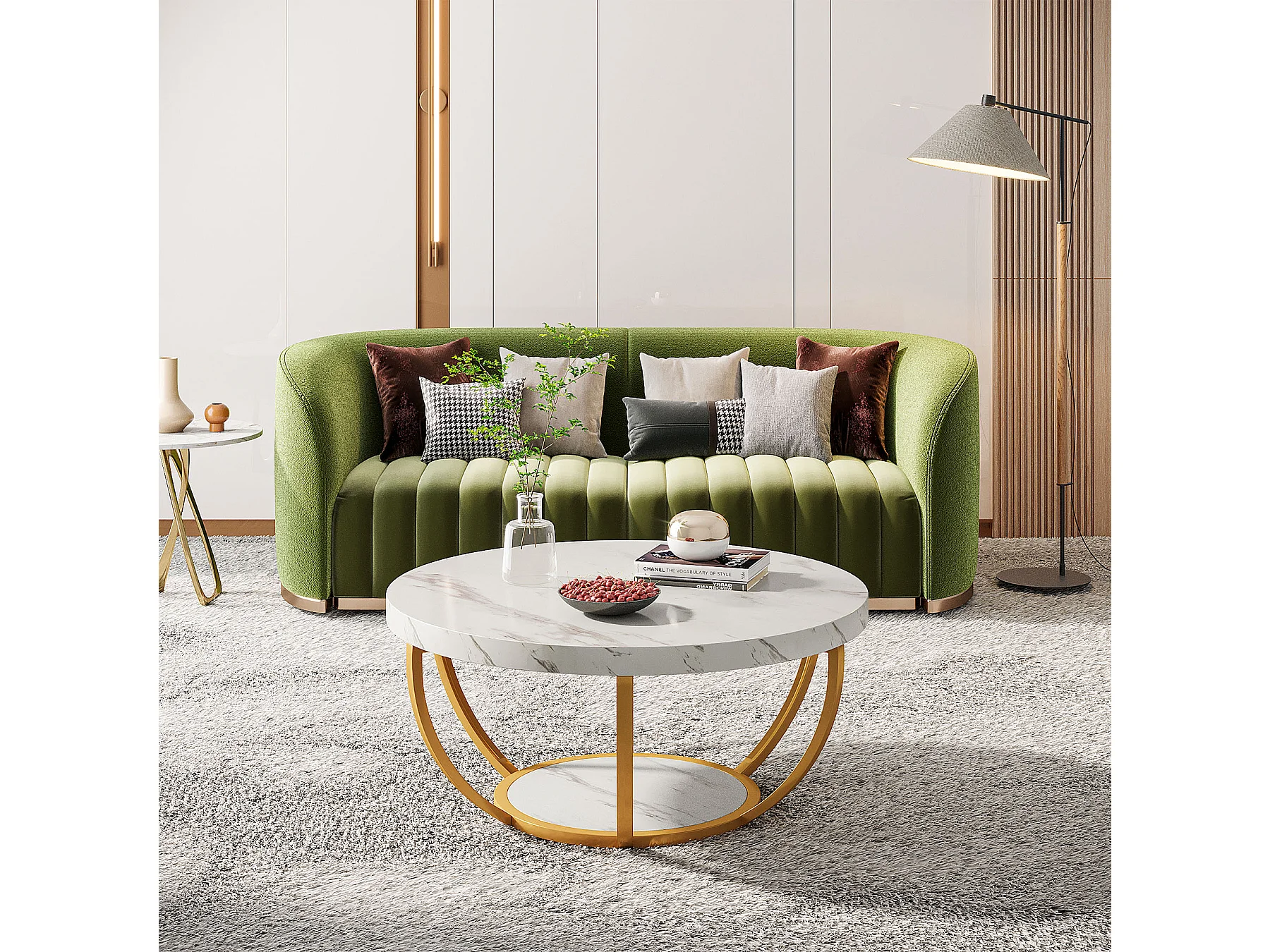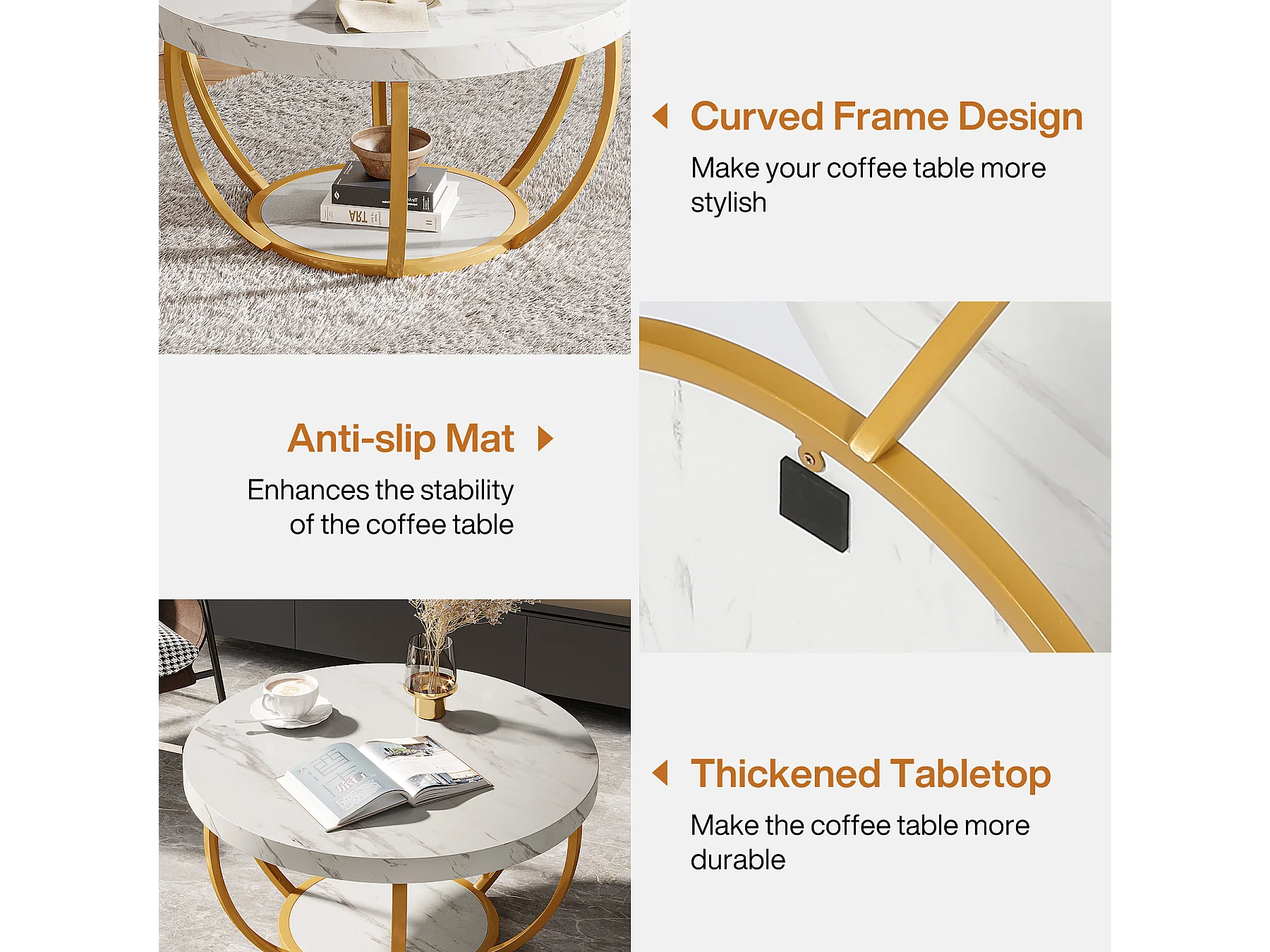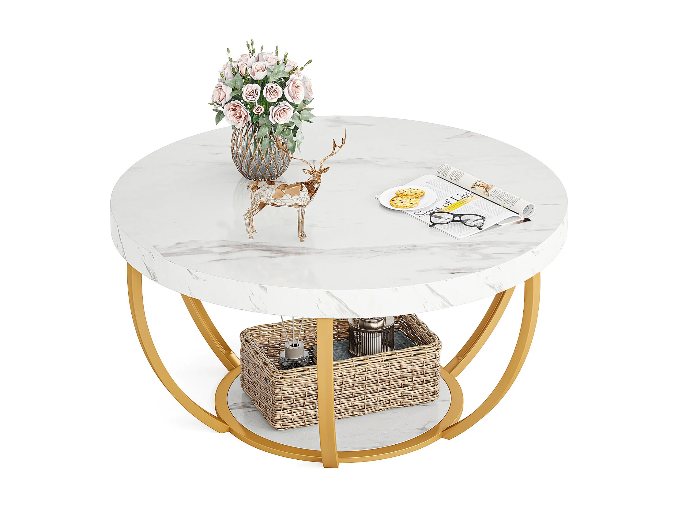 Mesa redonda de café moderna, mesa de café de 2 niveles con acabado de mármol blanco falso y patas de metal dorado