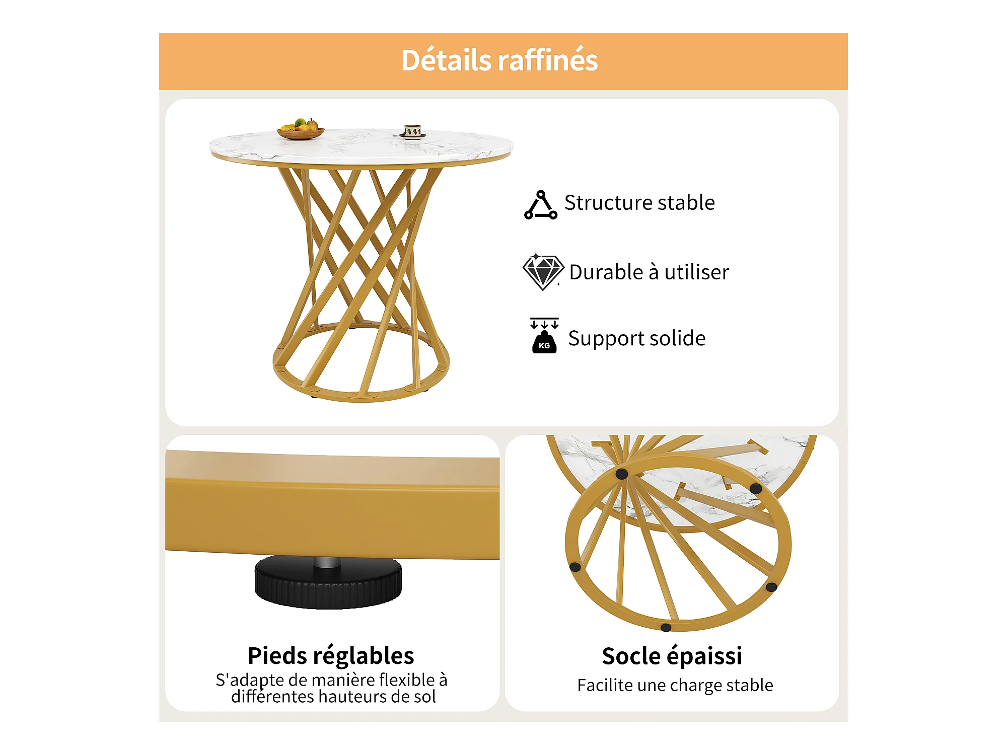 Mesa redonda para 4 personas, 80×80×76 cm, tablero de MDF marmolado, patas de metal dorado, ideal para cocina o salón.