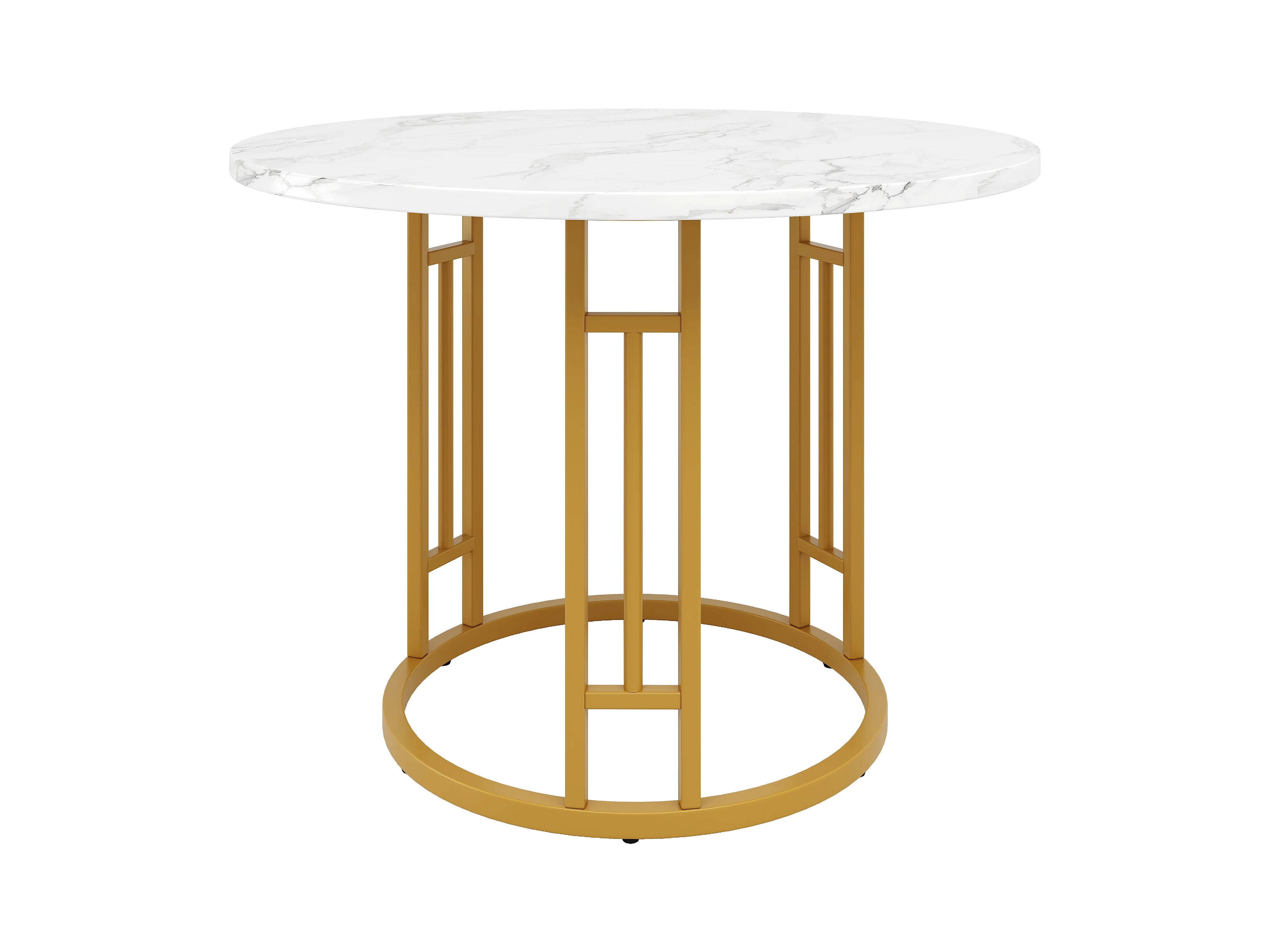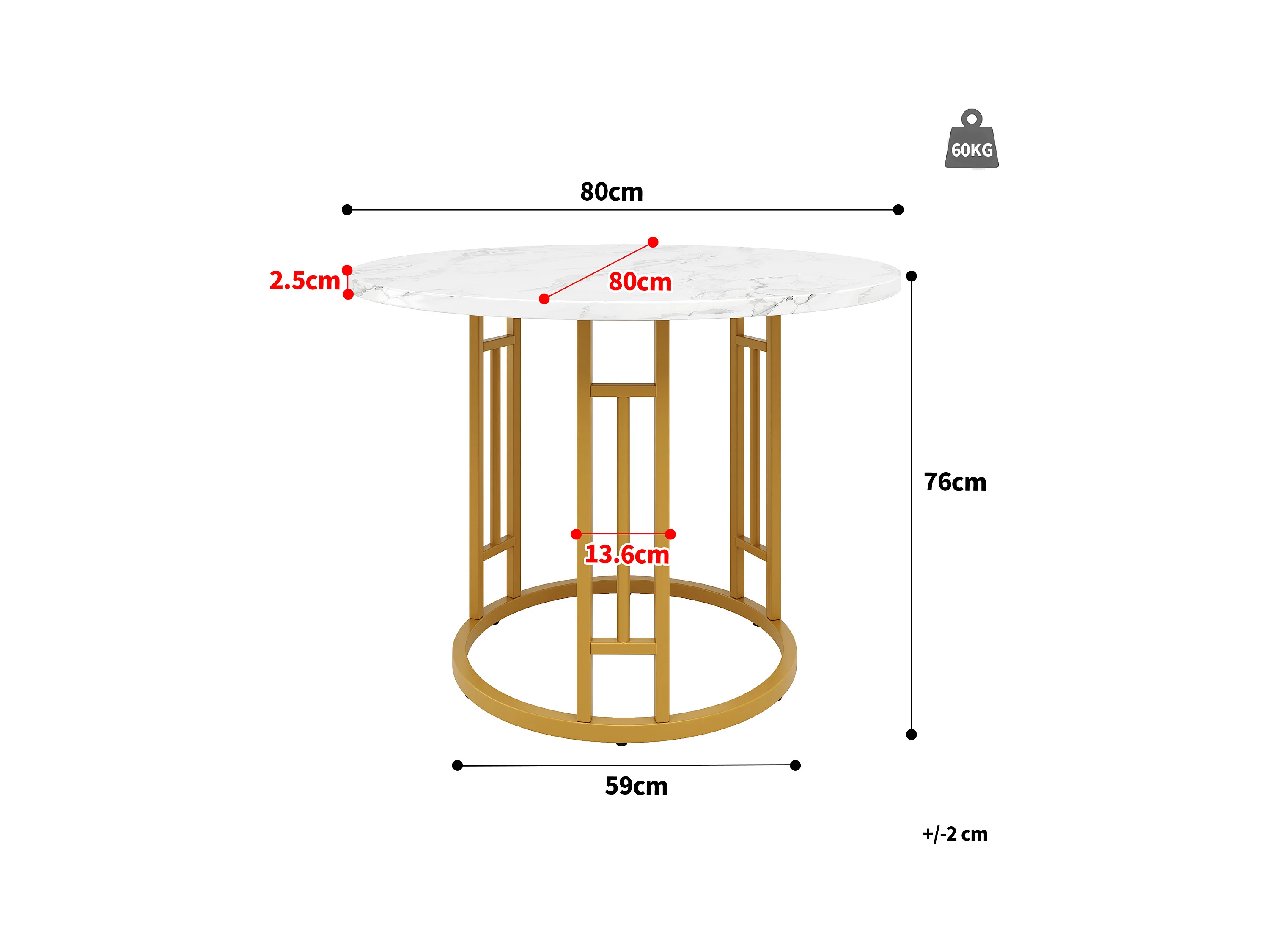Mesa de comedor redonda de MDF con tablero efecto mármol y base de metal dorado para 4 personas (80 x 80 x 76 cm)