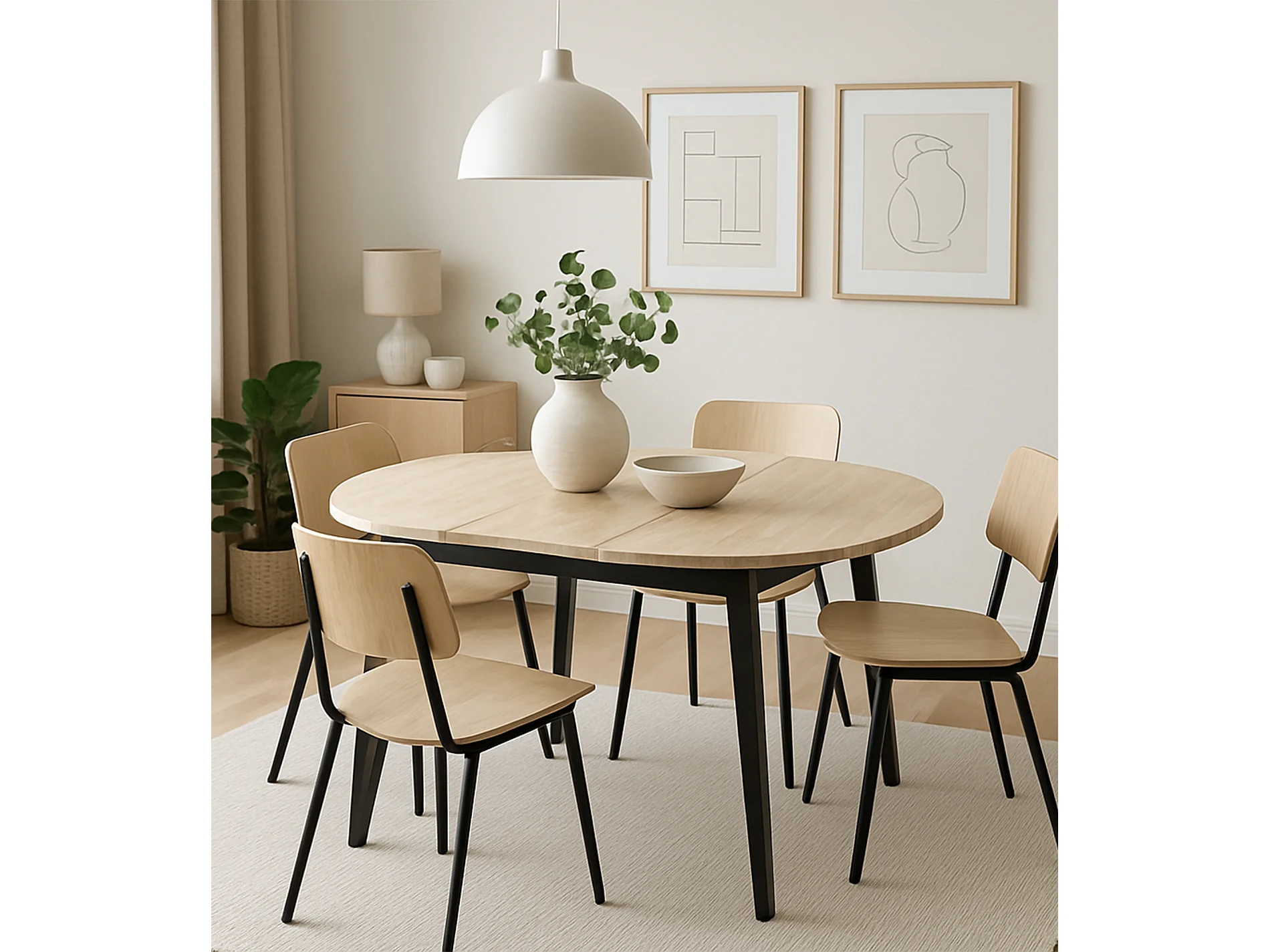 Mesa redonda extensible de 74x100-140-180x100 cm con sobre de roble y patas negras Bergi