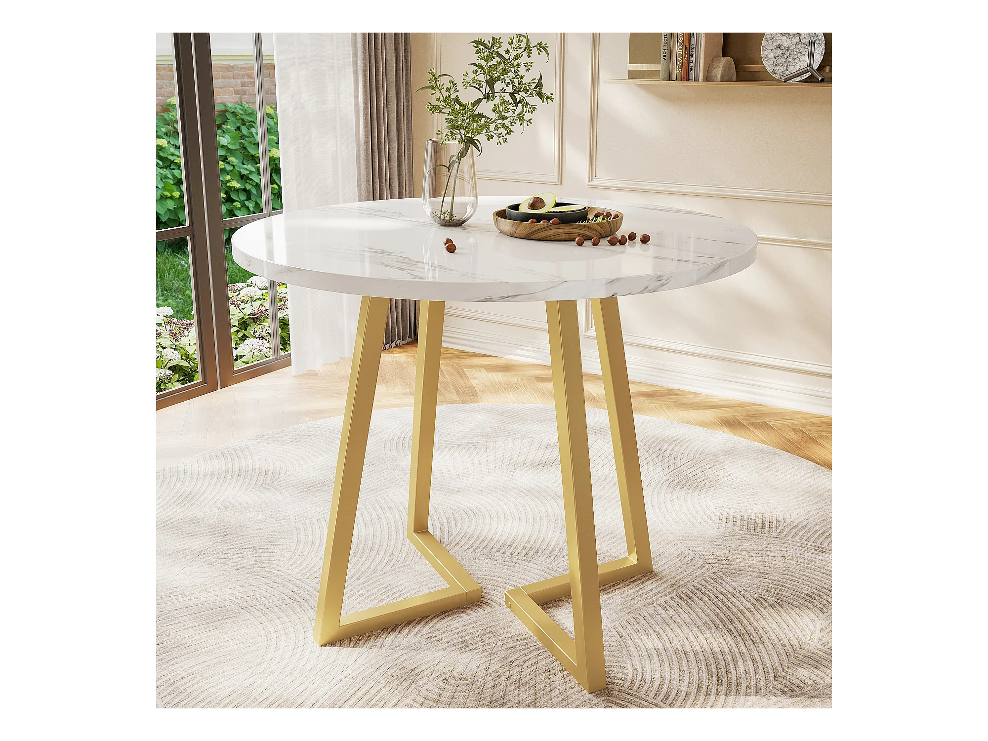 Mesa de comedor redonda efecto mármol, diseño moderno con patas de metal, ideal para 2-4 personas, color blanco y dorado (110x110x74,6 cm)