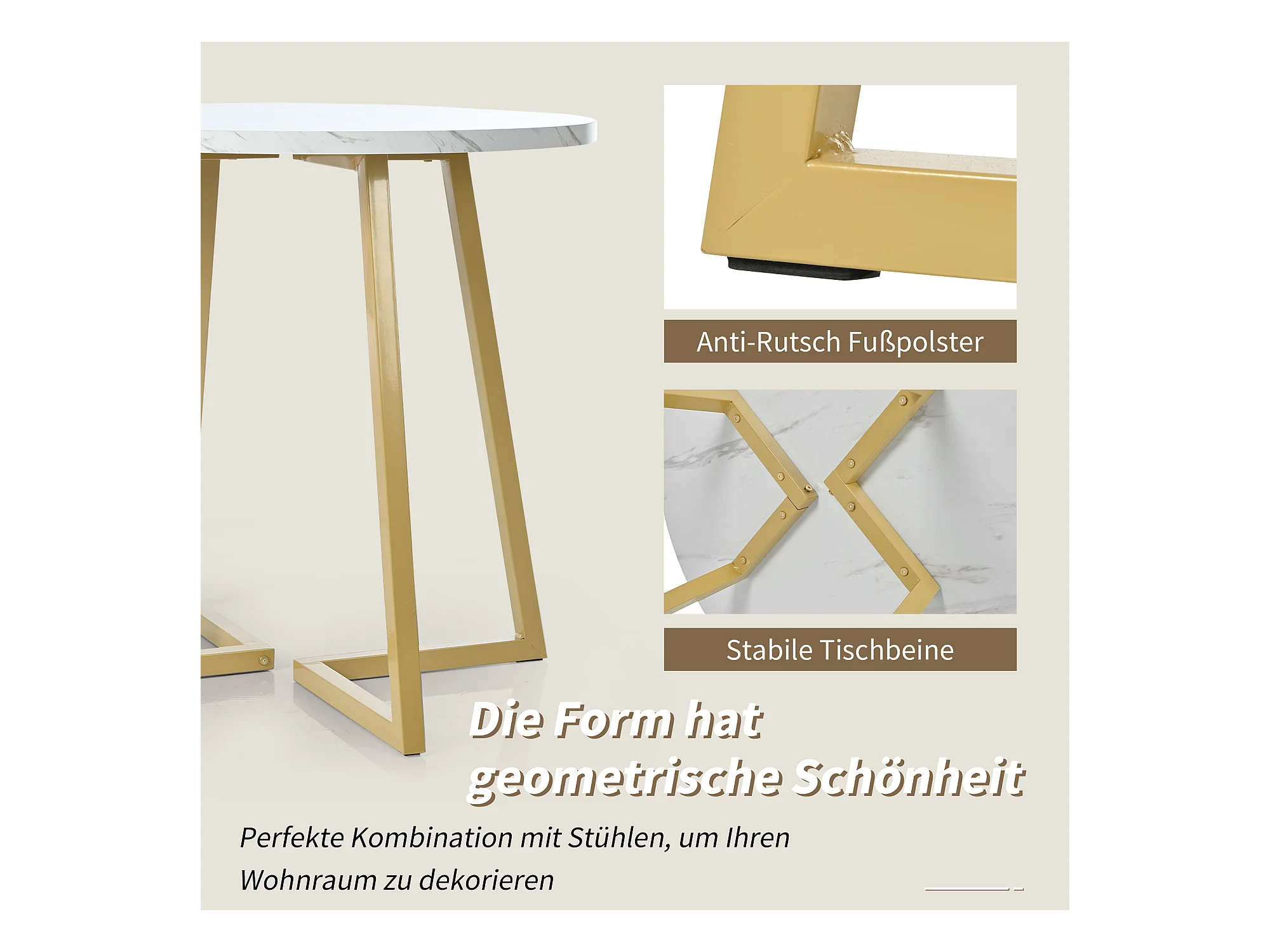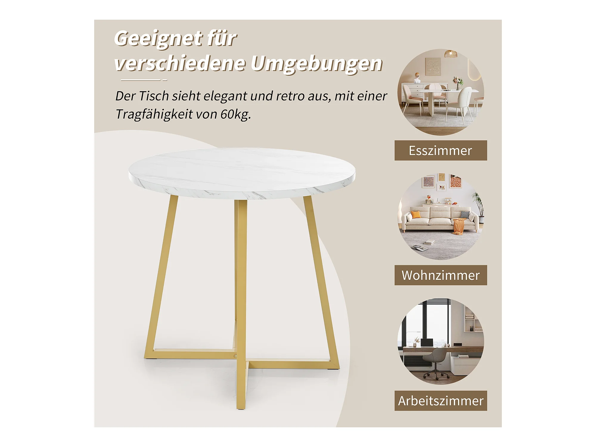 Mesa redonda moderna con patas de metal dorado, tablero de MDF blanco y diseño de mármol (80 cm) (80 x 80 x 75 cm)