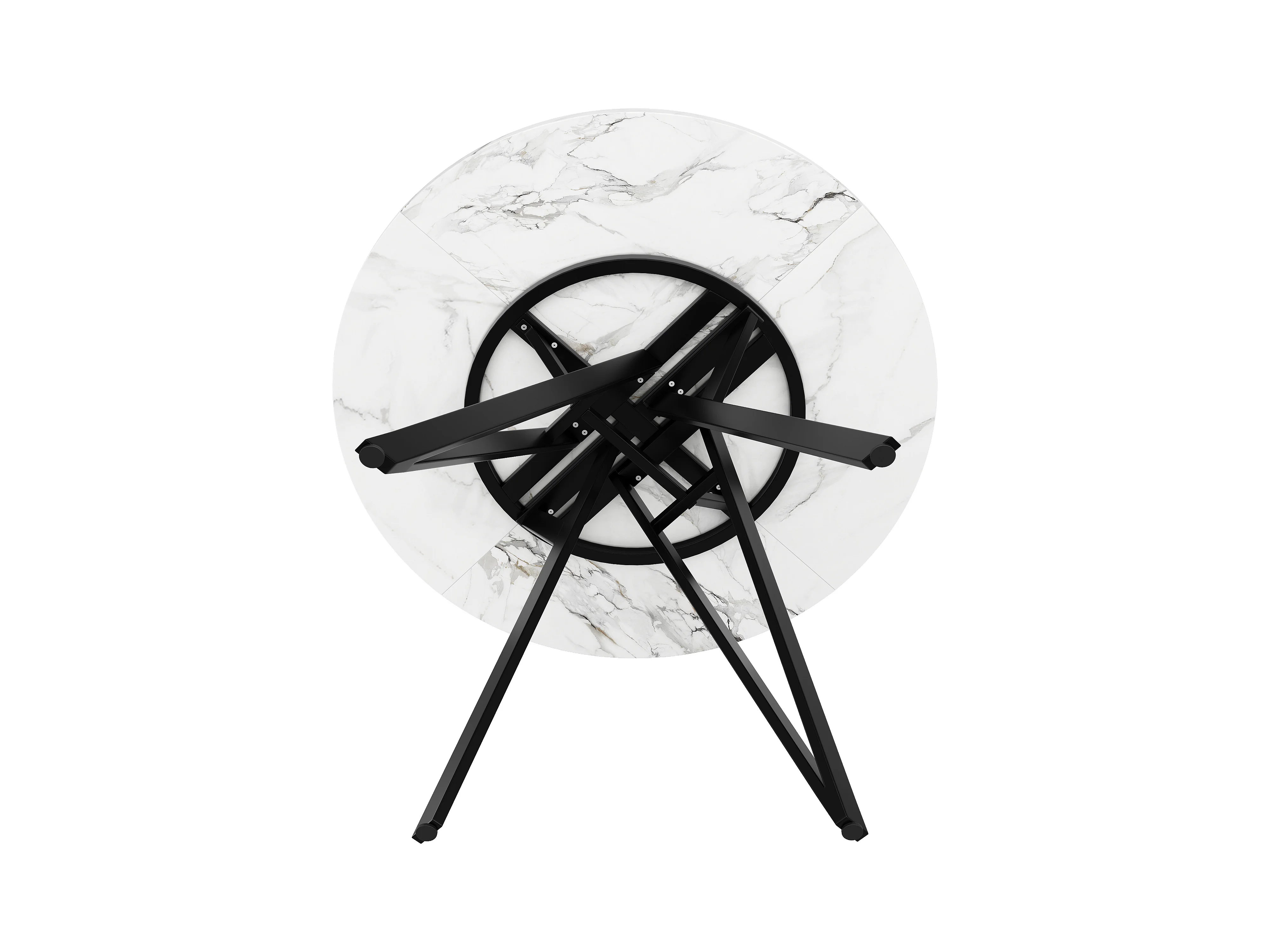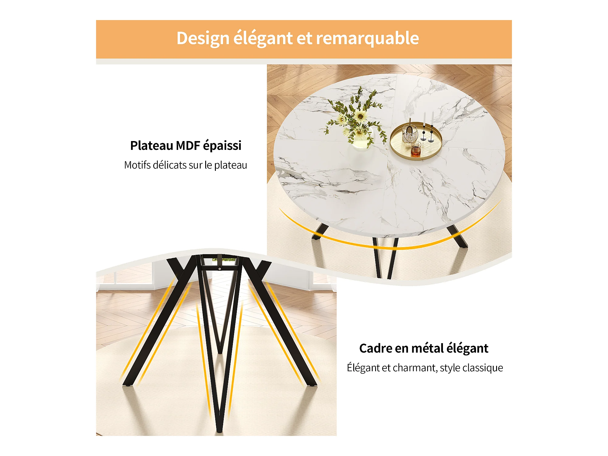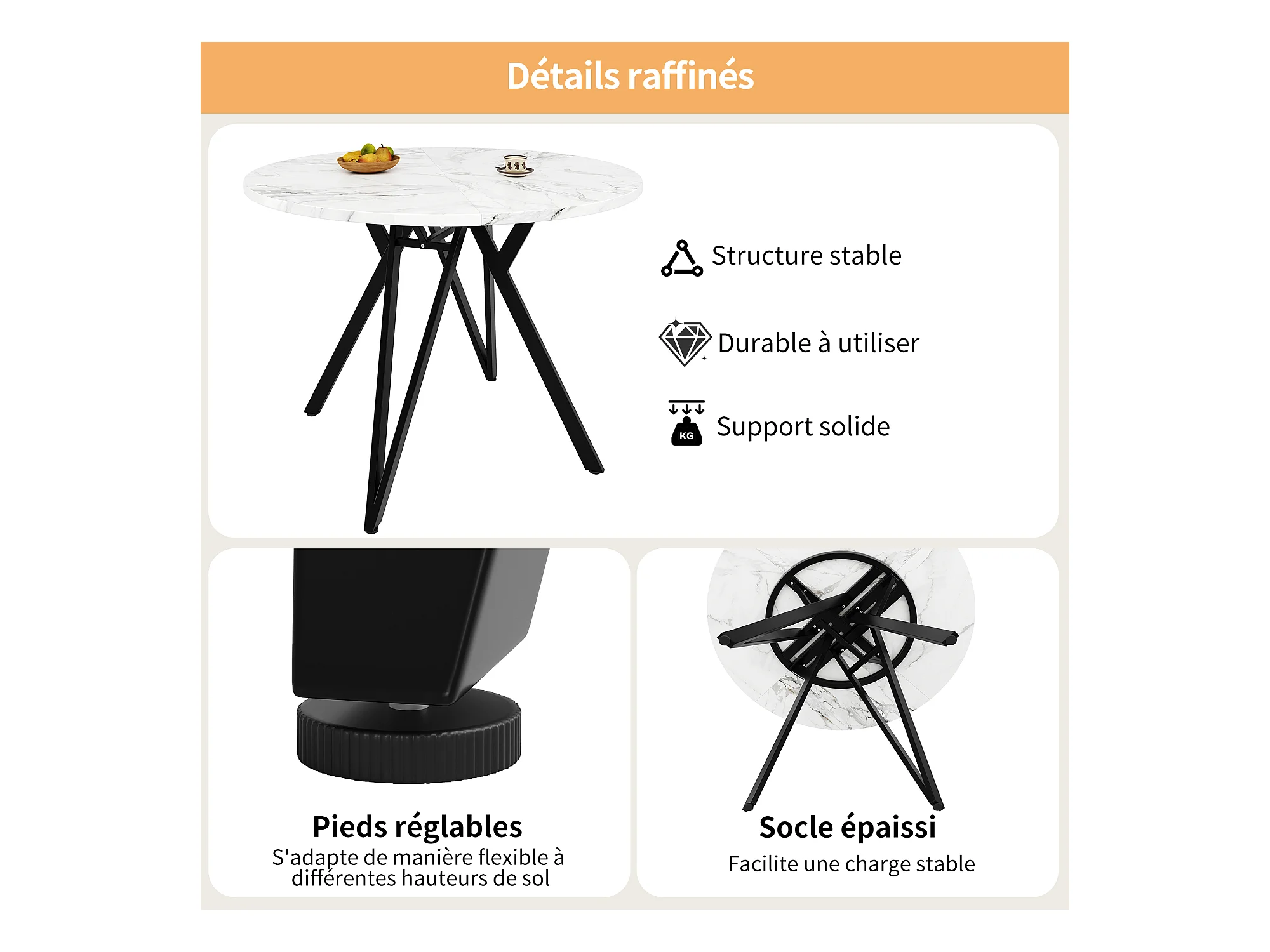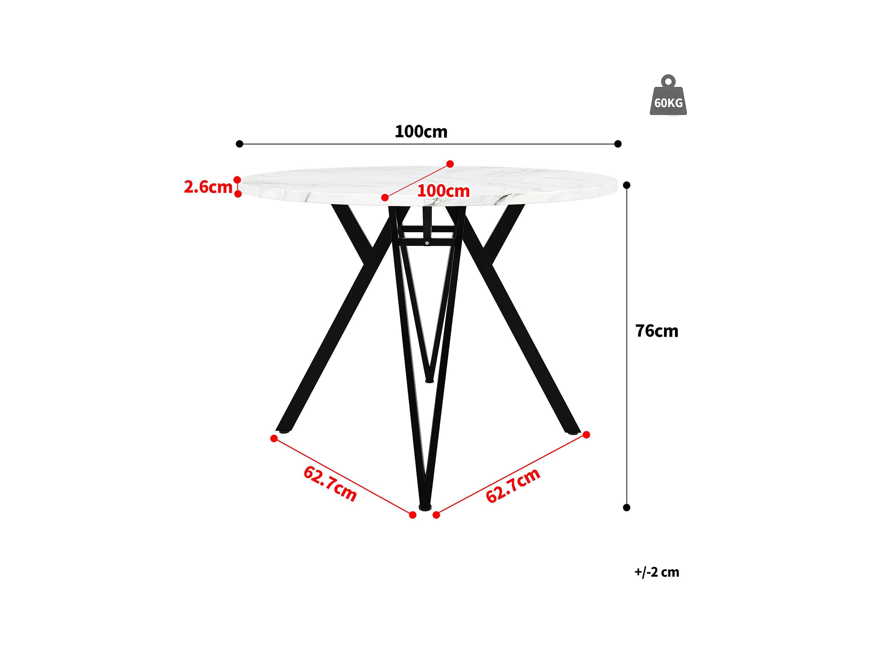 Mesa redonda para 4 personas, 100×100×76 cm, tablero de MDF efecto mármol, patas de metal negro, estilo moderno