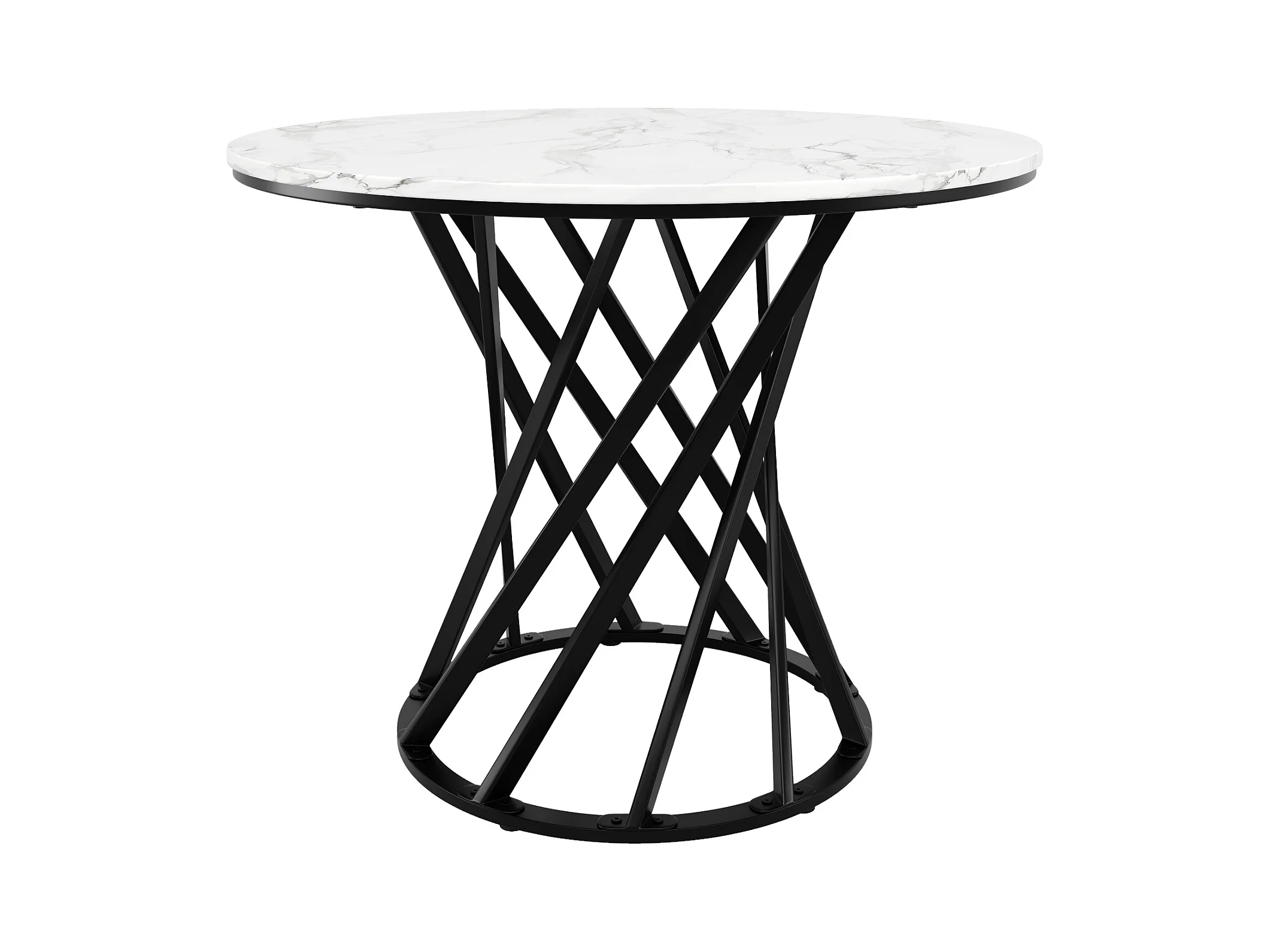 Mesa redonda para 4 personas, 100×100×76 cm, tablero de MDF efecto mármol, patas de metal negro, estilo moderno