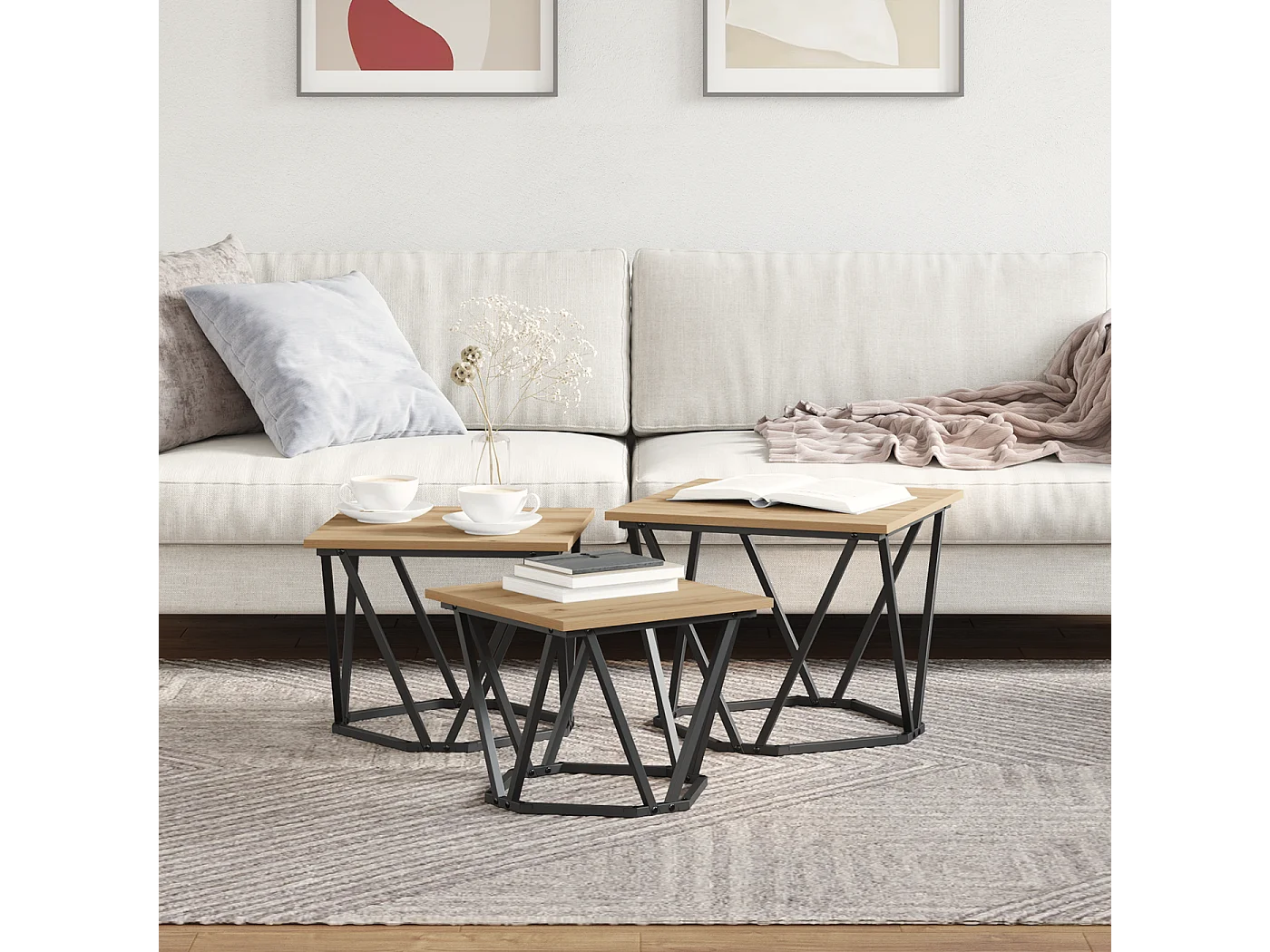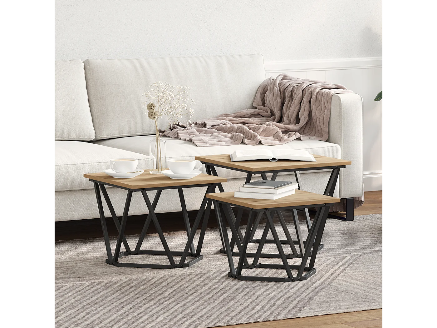 Mesas auxiliares apilables de 3 piezas de roble Sonoma fabricadas en aglomerado