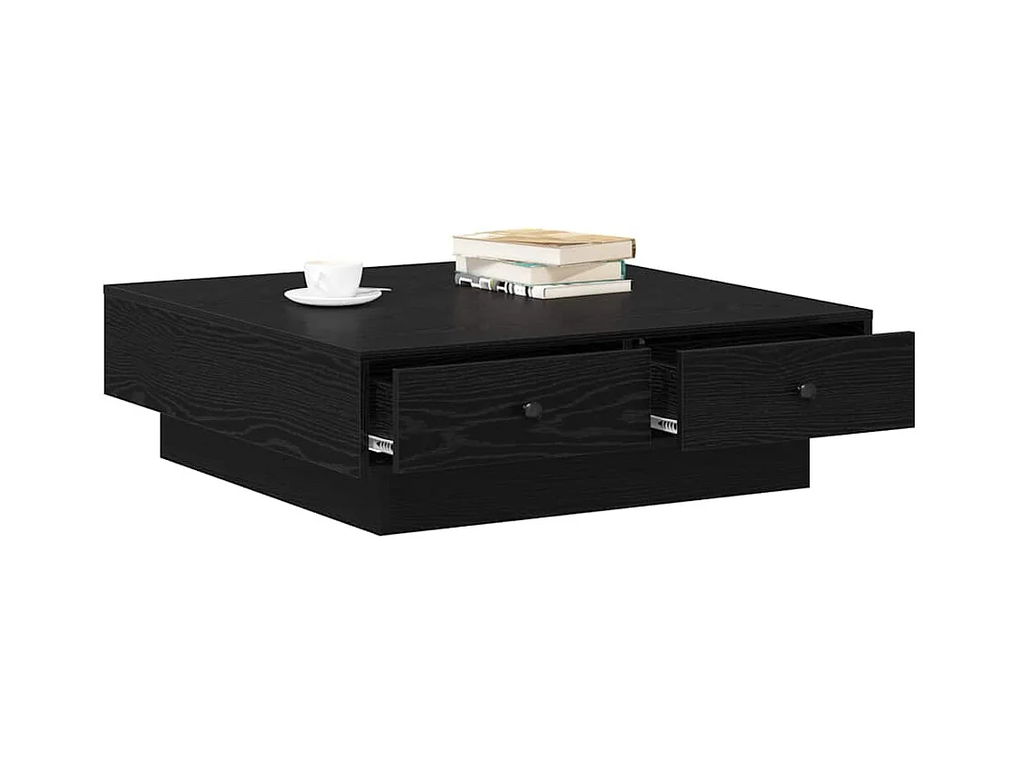 Mesa de centro cuadrada moderna con efecto mármol, tablero de partículas negro, con 4 cajones y tablero extraíble (90 x 90 x 25 cm)