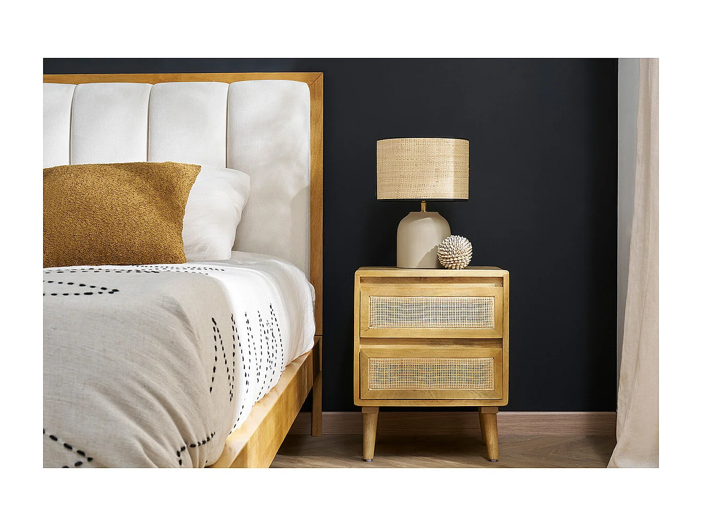 Mesilla de noche de madera maciza de mango y caña de ratán con 2 cajones ACANGE