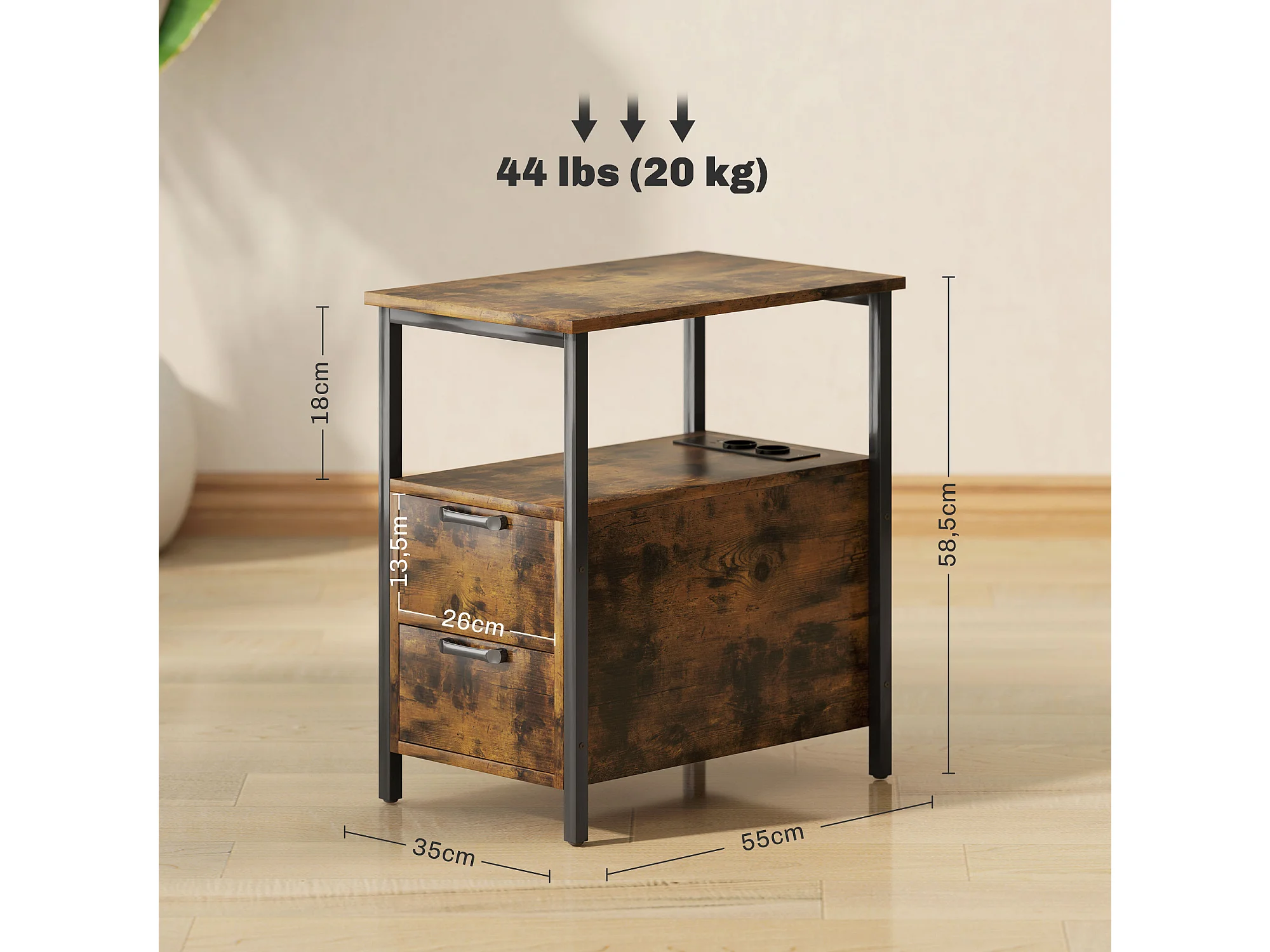 Mesita auxiliar estrecha con 2 cajones, puertos USB y enchufes, para salón o dormitorio, color marrón